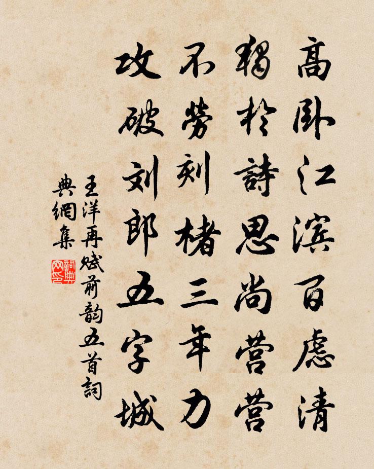 詩詞名句歷史字典書法欣賞書法字典國語詞典說文解字康熙字典古漢語字典標 題 作 者 詩 句 再賦前韻五首作者:王洋 朝代:宋代再賦前韻五首原文高臥江濱百慮清,獨於詩思尚營營。不勞刻楮三年力,攻破劉郎五字城。詩詞問答問:再賦前韻五首的作者是誰?答:王洋問:再賦前韻五首寫於哪個朝代?答:宋代王洋再賦前韻五首書法欣賞再賦前韻五首書法作品詩詞推薦馴鹿王令〔宋代〕日日野心新,籠欄外強馴。祗消指馬相,便有逐原人。昔起歌賓興,今無伏囿仁。豺狼好牙爪,應笑角如麟。金剛隨機無盡頌淨心行善分第二十三釋印肅〔宋代〕暖律潛消凍,萬國春風動。柳上一聲鶯,喚醒輪迴夢。試茗泉王安石〔宋代〕此泉地何偏,陸羽曾未閱。坻沙光散射,竇乳甘潛泄。靈山不可見,嘉草何由啜。但有夢中人,相隨掬明月。東門行佚名〔兩漢〕出東門,不顧歸。來入門,悵欲悲。盎中無斗米儲,還視架上無懸衣。拔劍東門去,舍中兒母牽衣啼:“他家但願楊公懿得潁人惠糟粕分餉並遺楊叔恬梅堯臣〔宋代〕頭尾接清淮,淮魚日登網。吳蓴芼羹美,楚糟增味爽。雲誰得嘉貺,曾靡獨為享。乃知不忘義,分遺及吾黨。和梁宏父二首王之道〔宋代〕時來談笑取侯封,清曠寧容雅志從。上聖急賢齊舜禹,群公引類邁夔龍。非材似我十圍櫟,有用如君千丈松。邂逅戊午夜宿寶石寺視寶石戲題黃庭堅〔宋代〕石形臥蒼牛,屭贔古松陰。松風與溪月,相守歷古今。初無廊廟姿,又不能礎碪。呈文謝珉光,撫質愧球琳。金馬病中代書奉寄聖俞二十五兄歐陽修〔宋代〕憶君去年來自越,值我傳車催去闕。是時新秋蟹正肥,恨不一醉與君別。今年得疾因酒作,一春不飲氣彌劣。飢腸頌古五十五首釋紹曇〔宋代〕古洞桃花發嫩枝,施朱施粉兩相宜。要渠成結千年實,多謝春風著意吹。折劍頭白居易〔唐代〕拾得折劍頭,不知折之由。一握青蛇尾,數寸碧峰頭。疑是斬鯨鯢,不然刺蛟虬。缺落泥土中,委棄無人收。我有望夫石陸游〔宋代〕送君遠戍交河北,男兒自以身許國。不能彎弓騎惡馬,欲隨君去何由得?登山矯首西北雲,形容雖變心猶存。月明又和後九首劉克莊〔宋代〕寒儒賴有雪映,貧女那無績光。千眼今依佛閣,重瞳昔侍舜廊。讀竹林先生墓銘項安世〔宋代〕嵩安鄉社榻罔阡,野客銘詩嗣子鐫。花發鳥啼春覓句,草深螢度夜開編。竹林名字人知否,玉樹禨祥我謂然。十萬句劉存行〔宋代〕麥苗花下綠,犢子草邊黃。神君歌十首劉克莊〔宋代〕樵蘇出林看,士女擁途迎。要識神通趣,年年此際晴。清輝殿雙頭牡丹宋庠〔宋代〕禁御含暉地,春英浥露天。萬柯蒸協氣,雙蘤應祥篇。傃日香彌酷,乘風艷欲然。聯葩宸屋外,交影帝觴前。詠掩題道靜院院在中條山故王顏中丞所置虢州刺史…寫真存焉李商隱〔唐代〕紫府丹成化鶴群,青鬆手植變龍文。壺中別有仙家日,嶺上猶多隱士雲。獨坐遺芳成故事,褰帷舊貌似元君。自憐春望陸游〔宋代〕天地回春律,山川掃積陰。波光迎日動,柳色向人深。沾灑憂時淚,飛騰滅虜心。人扶上危榭,未廢一長吟。初夏六首方回〔宋代〕近午初微暑,侵晨尚薄寒。暗窗蠶績響,危棟燕泥乾。問價纖絺貴,尋盟舊扇完。野人言麥熟,出郭好同看。寒食樓鑰〔宋代〕輔政無功日歉然,佳時攽賚屢傳宣。已蒙授粲仍分茗,既荷貽牟更擊鮮。酒號流香盛寶榼,燭然新火散青煙。孫兒名句推薦邦有道,貧且賤焉,恥也;邦無道,富且貴焉,恥也。孔子弟子《論語·泰伯篇》 春陰垂野草青青,時有幽花一樹明。蘇舜欽《淮中晚泊犢頭》 君問歸期未有期,巴山夜雨漲秋池。李商隱《夜雨寄北》 木蘭舟上珠簾卷,歌聲遠,椰子酒傾鸚鵡盞。李珣《南鄉子·山果熟》 灼灼野花香,依依金柳黃。佚名《菩薩蠻·霏霏點點回塘雨》 連雨不知春去,一晴方覺夏深。范成大《喜晴》 算明朝、未了重陽,紫萸應耐看。吳文英《霜花腴·重陽前一日泛石湖》 相思本是無憑語,莫向花箋費淚行。晏幾道《鷓鴣天·醉拍春衫惜舊香》 隔水氈鄉,落日牛羊下,區脫縱橫。張孝祥《六州歌頭·長淮望斷》 淚濕羅衣脂粉滿。四疊陽關,唱到千千遍。李清照《蝶戀花·淚濕羅衣脂粉滿》