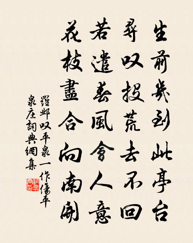 詩詞名句歷史字典書法欣賞書法字典國語詞典說文解字康熙字典古漢語字典標 題 作 者 詩 句 嘆平泉(一作傷平泉莊)作者:羅鄴 朝代:唐代嘆平泉(一作傷平泉莊)原文生前幾到此亭台,尋嘆投荒去不回。若遣春風會人意,花枝盡合向南開。詩詞問答問:嘆平泉(一作傷平泉莊)的作者是誰?答:羅鄴問:嘆平泉(一作傷平泉莊)寫於哪個朝代?答:唐代羅鄴嘆平泉(一作傷平泉莊)書法欣賞嘆平泉(一作傷平泉莊)書法作品注釋全唐詩:卷654-106詩詞推薦送張揚子章甫〔宋代〕堂上弦歌吏早休,三年官舍冷於秋。諸公極力爭推挽,野老何知欲借留。去矣青雲皆坦路,歸歟明月只扁舟。都城奉同景仁九日宴相公新堂韓維〔宋代〕高堂突兀里人驚,丞相規模固自宏。移石遠分嵩嶠色,鑿池切放潩泉聲。茱萸結佩聊同俗,鸚鵡傳杯豈吝情。右席宮詞王珪〔唐代〕迢遞金壺漏水長,輪更傳點報君王。諸宮各進進新果,盡著龍床駐夜香。題清音亭徐沖淵〔宋代〕人間絲竹競哇淫,只有清流解洗心。試論此山泉石看,茂林修竹勝山陰。野次遇雨王炎〔宋代〕木末雲屯飛雨暗,柳梢水到水溪深。身隨王事有行役,家在江南無信音。但得林泉堪著眼,莫將軒冕更關心。拂衣獨孤判官部送兵高適〔唐代〕餞君嗟遠別,為客念周旋。征路今如此,前軍猶眇然。出關逢漢壁,登隴望胡天。亦是封侯地,期君早著鞭。金剛隨機無盡頌離相寂滅分第十四釋印肅〔宋代〕慧命聞深義,五體如山禮。學海一時乾,心空方及第。瓦盆歌王哲〔元代〕你敲著得恁響聲大。無祥瑞,沒災禍。元誰知得那。外唇有口能發課。內虛有腹成因果。貴賤賢愚,細思量、人人雪中端約相招因以詩簡之蔡戡〔宋代〕纖纖暮雨變飛霙,夜聽敲窗瀉竹聲。柳絮因風誠可擬,梅花帶月有餘清。梁園公子方開宴,姑射神人最賦情。可笑詠史下龐士元陳普〔宋代〕放虎山林計已非,蛟龍雲雨意猶遲。士元驥足思騰踏,盍有劉琮不告時。送人宰吳縣杜荀鶴〔唐代〕海漲兵荒後,為官合動情。字人無異術,至論不如清。草履隨船賣,綾梭隔水鳴。唯持古人意,千里贈君行。慶劉教授李劉〔宋代〕萬里秋風生桂枝,麒麟墮地有誰知。摩空早奏甘泉賦,取勢猶歌{左氵右半}水詩。好是桑蓬浮喜氣,正栽桃李助和平叔道傍竹梅堯臣〔宋代〕野田有修竹,叢疏飽於霜。下上乏佳禽,左右雜枯桑。豈無行路子,行路厭榛荒。忽見此翠色,徘徊未能忘。車馬西江月侯善淵〔元代〕不在瞻星禮月,何須誦戒看經。今朝與汝付叮嚀。生死須憑性命。道啟遍知無上,神通法界圓明。不勞作用自功成寄賈元鎮並問楊似賢譚德稱李石〔宋代〕客子推移地,聞雞敢晏眠。酒樓春夜雨,柳岸早行天。龍臥風雷宅,蠶叢綿繡川。譚楊兩州教,記我別時年。題劉心月白玉蟾〔宋代〕汨羅江山水嗚唈,魚鱉不知老龍泣。徒棹龍舟何處尋,何不辦取屈原生前一枝楫。大吳江頭伍侯廟,夕陽滿樹聞啼過乾越宿熊氏澹園偕東采駕閣西玉國正二同年黎廷瑞〔宋代〕當年曲江燕,並醉西湖舟。芳夢故依然,落花水空流。今晨定何朝,聯裾此夷猶。暄風不驚波,小泊琵琶洲。無人禪林寺作寄劉書記李山甫〔唐代〕坐近松風骨自寒,茅齋直拶白雪邊。玄關不閉何人到,此事誰論在佛先。天竺老師留一句,曹溪行者答全篇。今朝次韻子瞻游徑山蘇轍〔宋代〕去年渡江愛吳山,忽忘蜀道輕秦川。錢塘後到山最勝,下枕湖水相縈旋。坐疑吳會無復有,扁舟屢出凌濤淵。今秋揚州慢趙以夫〔宋代〕花大而瓣厚,其色淡黃,聚八仙花小而瓣薄,其色微青,不同者一也。瓊花葉柔而瑩澤,聚八仙葉粗而有芒,不同名句推薦和氣吹綠野,梅雨灑芳田。李世民《詠雨》 問余何意棲碧山,笑而不答心自閒。李白《山中問答 / 山中答俗人問》 上交不諂,下交不瀆佚名《易傳·繫辭傳下·第五章》 合軍聚眾, 務在激氣孫臏《孫臏兵法·延氣》 一寸柔腸情幾許?薄衾孤枕,夢回人靜,徹曉瀟瀟雨。惠洪《青玉案·絲槐煙柳長亭路》 馬上相逢無紙筆,憑君傳語報平安。岑參《逢入京使》 凡學之道,嚴師為難。戴聖《禮記·學記》 殘螢棲玉露,早雁拂金河。許渾《早秋三首·其一》 白雪卻嫌春色晚,故穿庭樹作飛花。韓愈《春雪》 春日載陽,有鳴倉庚。佚名《七月》