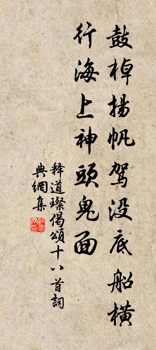 詩詞名句歷史字典書法欣賞書法字典國語詞典說文解字康熙字典古漢語字典標 題 作 者 詩 句 偈頌十八首作者:釋道璨 朝代:宋代偈頌十八首原文鼓棹揚帆,駕沒底船。橫行海上,神頭鬼面。詩詞問答問:偈頌十八首的作者是誰?答:釋道璨問:偈頌十八首寫於哪個朝代?答:宋代釋道璨偈頌十八首書法欣賞偈頌十八首書法作品詩詞推薦孟少保戎裝相贊釋慧開〔宋代〕英雄蓋世上將軍,洞寇聞風喪膽魂。寸刃不施機莫測,看渠談笑定乾坤。初冬雜詠陸游〔宋代〕重陽已過二十日,殘菊才存三四枝,對酒插花君勿笑,從來不解入時宜。題社友詩稿鄧允端〔宋代〕詩里玄機海樣深,散於章句斂於心。會時要似庖丁刃,妙處應同靖節琴。韻勝想君言外得,字新令我意邊尋。痴人宿玄武二首盧照鄰〔唐代〕方池開曉色,圓月下秋陰。已乘千里興,還撫一弦琴。庭搖北風柳,院繞南溟禽。累宿恩方重,窮秋嘆不深。題瑞雲峰釋子益〔宋代〕山行百折路重重,到頂回頭眼界空。但覺衲衣冰樣冷,不知身在現雲峰。次韻吳僧魁一山十絕方回〔宋代〕隋朝檜下訪仙真,五十年前夜榻身。至道宮前天目頂,羨公去作臥雲人。題義門胡氏華林書院李巽〔宋代〕孝義門風累世修,帝恩旌表耀南州。藏書不特延多士,貢幣仍聞亞列侯。高閣聲寒慈竹雨,小池香老瑞蓮秋。人來詠史上禰衡陳普〔宋代〕銅雀羅紈宛汗青,芳洲鼓史骨如生。羯奴礌落若日月,大雅那堪禰正平。過劉三十二故宅白居易〔唐代〕不見劉君來近遠,門前兩度滿枝花。朝來惆悵宣平過,柳巷當頭第一家。水龍吟陳著〔宋代〕杜鵑啼正忙時,半風半雨春慳霽。酴醿未過,櫻甜初熟,梅酸微試。一種紅芳,九苞真色,舞窗翻砌。自仙樊去後酬李補闕雨中寄贈崔峒〔唐代〕十年隨馬宿,幾度受人恩。白髮還鄉井,微官有子孫。竹窗寒雨滴,苦砌夜蟲喧。獨愧東垣友,新詩慰旅魂。題高節亭頌黃庭堅〔宋代〕松風竹雨共談空,樓閣參差古疊重。急水灘頭道人住,亦如前佛在因中。偈傾一百三十三首釋法薰〔宋代〕有祖以來,無人奈何。德山臨濟,特地干戈。水到滄溟不是波。題瑞安宰朱元成乃祖雲壑莊圖陳傅良〔宋代〕功成不受富貴汙,輕舟翩然下五湖。至今風流在姑蘇,我復見此雲壑圖。兩坡喬木樛相扶,殘山乘水千里余。天際點絳唇王哲〔元代〕可惜嬌兒,惺惺伶俐聰明作。靈台廓。圓明光爍。我許蓬萊約。斷卻麻繩,正好修丹藥。如今卻。買條銅索。縛住風月堂夜飲方岳〔宋代〕霜洗橫枝月上初,春彝更可共談無。玉杯一一寒於雪,貯以詩腸渺似湖。尋山僧真勝上人不遇棲白〔唐代〕松下禪棲所,苔滋徑莫分。青山春暮見,流水夜深聞。不坐看心石,應隨出定雲。猿猱非可問,岩谷自空曛。過金陵四首蘇泂〔宋代〕豆田無數老鴉飛,棗熟菰香稻子垂。未說前年那有此,今年還似去年時。送別胡汲古黃庚〔宋代〕自鄰身是客,又送客登舟。雖有重來約,難禁一別愁。風煙迷柳驛,草樹暗春洲。後夜懷人處,山空月滿樓。唐多令(城歸泊湖山)陳著〔宋代〕倦枕寄漁鄉。篷低被怯霜。月窺人、多少思量。自是欲眠眠不穩,禁聽得、雁聲雙。和夢早催行。歸來梅竹窗。小名句推薦淡淡橫朝煙,脈脈深秋思。劉道著《湘江秋曉》 人煙寒橘柚,秋色老梧桐。李白《秋登宣城謝朓北樓》 首夏猶清和,芳草亦未歇。謝靈運《游赤石進帆海》 滿目山河空念遠,落花風雨更傷春。晏殊《浣溪沙·一向年光有限身》 出其東門,有女如雲。佚名《出其東門》 秋波落泗水,海色明徂徠。李白《魯郡東石門送杜二甫》 繁霜儘是心頭血,灑向千峰秋葉丹。戚繼光《望闕台》 朝騁騖兮江皋,夕弭節兮北渚;屈原《九歌》 世人結交須黃金,黃金不多交不深。張謂《題長安壁主人》 明朝掛帆席,楓葉落紛紛。李白《夜泊牛渚懷古》