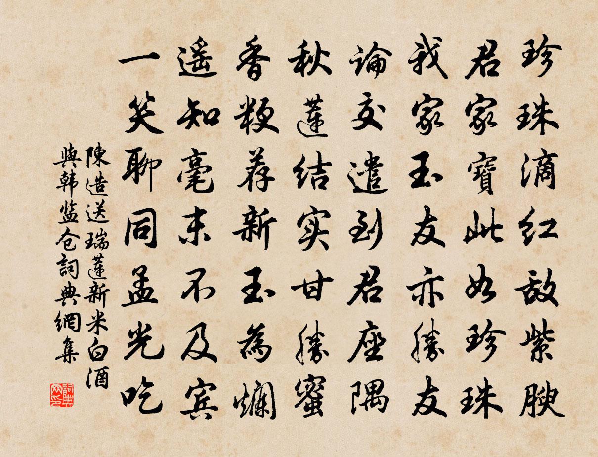 詩詞名句歷史字典書法欣賞書法字典國語詞典說文解字康熙字典古漢語字典標 題 作 者 詩 句 送瑞蓮新米白酒與韓監倉作者:陳造 朝代:宋代送瑞蓮新米白酒與韓監倉原文珍珠滴紅敵紫腴,君家寶此如珍珠。我家玉友亦勝友,論交遣到君座隅。秋蓮結實甘勝蜜,香粳薦新玉為爛。遙知毫末不及賓,一笑聊同孟光吃。詩詞問答問:送瑞蓮新米白酒與韓監倉的作者是誰?答:陳造問:送瑞蓮新米白酒與韓監倉寫於哪個朝代?答:宋代陳造送瑞蓮新米白酒與韓監倉書法欣賞送瑞蓮新米白酒與韓監倉書法作品詩詞推薦歸途次韻黃彥平〔宋代〕隔年重到浯溪路,旌旆行疏鬢雪添。幸有江山供吊屈,愧無耆舊詠來廉。謁金門沈端節〔宋代〕尋勝去。湖色淨涵疏樹。欸乃一聲何處起。風鈴相應語。目斷遙林修渚。畫出江南煙雨。山水照人人楚楚。錦腸生寄題興州晁太守新開古東池蘇軾〔宋代〕百畝清池傍郭斜,居人行樂路人夸。自言官長如靈運,能使江山似永嘉。縱飲座中遺白帢,幽尋盡處見桃花。不堪宮詞一百首岳珂〔宋代〕新渠瀰瀰漾波深,千里桑麻藹碧陰。喜動天顏古循吏,催教增秩賜黃金。次韻和台源諸篇九首之南屏山黃庭堅〔宋代〕襞積藍光刻削成,主人題作正南屏。身更萬事已頭白,相對百年終眼青。煙雨數峰當隱几,林塘一帶是中庭。紅塵詠史上武帝陳普〔宋代〕狄山不能居一障,公孫請專事朔方。尊榮衛霍家山嶽,冷淡申轅頭雪霜。次韻邦直通判少尹題普現堂見簡之什李彌遜〔宋代〕飽知世路厭陳人,分得僧窗寄此身。戴月筍輿成獨往,緣雲藜杖與誰親。足間優缽藏千界,掌上庵摩等一塵。賴得詩二首陳舜俞〔宋代〕自古匡廬是勝游,話臣何敢計淹留。城中未有看山處,客館僧坊謾舉頭。臨江仙(東叔兄生日)魏了翁〔宋代〕去歲玉堂山下住,母旁後弟前哥。今年作縣古松坡。靜參朱祭酒,間印馬頭陀。去路更無山隔斷,春風跋馬經過。黃兄宇出示湯丈追和春日詩適有會余情者次韻杜范〔宋代〕君不見西山凜凜百世師,忍窮受餓終采蕨。又不見愧謬遺臭幾千載,當年方丈厭肥滑。孰得孰失試大觀,較若五味次韻務觀城西書事二首韓元吉〔宋代〕臘盡雪晴春欲柔,蒙蒙煙柳認瓜洲。潮生潮落無窮事,江水東西不限愁。晨興韓偓〔唐代〕曉景山河爽,閒居巷陌清。已能消滯念,兼得散餘酲。汲水人初起,回燈燕暫驚。放懷殊未足,圓隙已塵生。贈宗魯筇竹杖李商隱〔唐代〕大夏資輕策,全溪贈所思。靜憐穿樹遠,滑想過苔遲。鶴怨朝還望,僧閒暮有期。風流真底事,常欲傍清羸。失調名 自樂 疑此首為曲調佚名〔宋代〕醉時節、就把青山靠。醒來時、興取瑤琴操。操的是、鶴鳴九皋,水色清,山色近,迥然閒自樂。俺也一如歸閬苑畫笥有二粉頭各題一絕劉克莊〔宋代〕高帝開江左,如天有太陽。迎歸皇太后,放出小流娘。三用韻何夢桂〔宋代〕何年鑄銅柱,請為問伏波。薊子去不遠,金狄誰再摩。世變落莽渺,吾意成蹉跎。盜跖飫肝膾,孔聖厄弦歌,禍福奧村晚望黃公度〔宋代〕山逐寒雲斷,天隨暮靄低。稻畦迷上下,樵逕自東西。故國存書劍,他鄉尚鼓鼙。涓埃期補報,未敢卜幽棲。靜心堂史堯弼〔宋代〕曲士懷軒裳,銖寸較得失。紛紜戰寵辱,矛盾相撞抶。大方惟達人,天游寄虛室。卷舒儻由己,出處要無必。時來木郎祈雨咒白玉蟾〔宋代〕乾晶瑤輝玉池東,盟威聖者命青童。擲火萬里坎震宮,雨騎迅發來太濛。木郎太乙三山雄,霹靂破石泉源通。神震周昌徐鈞〔宋代〕廷爭廢嫡見操持,故仗剛強托愛兒。三召歸來竟無語,此時何不更期期。名句推薦為害常因不察,致禍歸於不忍。來俊臣《羅織經·閱人卷第一》 以力服人者,非心服也,力不贍也;以德服人者,中心悅而誠服也。孟子《孟子·公孫丑章句上·第三節》 丈夫志四海,萬里猶比鄰。曹植《贈白馬王彪·並序》 利之中取大,害之中取小。墨子《墨子·44章 大取》 我居北海君南海,寄雁傳書謝不能。黃庭堅《寄黃幾復》 枝枝相覆蓋,葉葉相交通。佚名《孔雀東南飛 / 古詩為焦仲卿妻作》 窗間梅熟落蒂,牆下筍成出林。范成大《喜晴》 雲開遠見漢陽城,猶是孤帆一日程。盧綸《晚次鄂州》 沉舟側畔千帆過,病樹前頭萬木春。劉禹錫《酬樂天揚州初逢席上見贈》 清明節,雨晴天,得意正當年。薛昭蘊《喜遷鶯·清明節》
