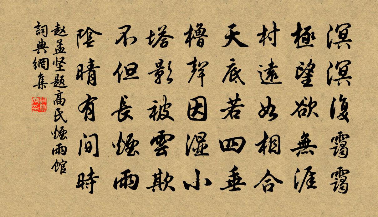 詩詞名句歷史字典書法欣賞書法字典國語詞典說文解字康熙字典古漢語字典標 題 作 者 詩 句 題高氏煙雨館作者:趙孟堅 朝代:宋代題高氏煙雨館原文溟溟復靄靄,極望欲無涯。村遠如相合,天底若四垂。櫓聲因濕小,塔影被雲欺。不但長煙雨,陰晴有間時。詩詞問答問:題高氏煙雨館的作者是誰?答:趙孟堅問:題高氏煙雨館寫於哪個朝代?答:宋代趙孟堅題高氏煙雨館書法欣賞題高氏煙雨館書法作品詩詞推薦雪齋張耒〔宋代〕雪霽山堆黛,江晴日炫金。風煙調柳態,冰雪徹梅心。節物何嫵媚,端居自滯淫。無眠聽雲雁,稍有北歸音。送王龜齡赴越州宗丞周必大〔宋代〕冊府號冀北,一時聚奇材。嗟我雖末至,尚及相追陪。鬍子真老驥,元章蓋龍媒。爾來厭名韁,蹙踏游九垓。王子膠山寺蘇紳〔宋代〕驅馬款禪扉,松風冷拂衣。紅塵不到處,青嶂此忘歸。鳥望生台下,雲侵講座飛,楞伽味真趣,轉覺俗緣稀。送張真州大經趙蕃〔宋代〕渺渺春江綠水波,客中送客倍愁多。一麾出守輸公去,三徑就荒如我何。暫為淮人符剖竹,即掃漢殿橐持荷。異時書來上人房王之道〔宋代〕十里清風水拍天,老僧齋罷抱頭眠。丹楹畫棟看摧厭,好為僧伽作勝緣。西園月夜醉作短歌二闋王令〔宋代〕我有壹鬱氣,從來未經吐。欲作大嘆吁向天,穿天作孔恐天怒。琥珀春撥醅,泛艷紅出杯。無客尚有月,把對心尚十二時行孝文白居易〔唐代〕雞鳴醜,高樓大宅得安久。常勸父母發慈心,孝得題名終不朽。謹和老人瘳字韻洪咨夔〔宋代〕本期洗眼看伊周,到此華胥只夢遊。爛漫蒼苔心事晚,婆娑紅槿鬢華秋。藏頭欲效鑽沙鱉,捫舌空成噍草牛。飯豆又和松碧軒三絕胡寅〔宋代〕新陂剩水沃良苗,想見當時相杵謠。尚有荒余須快犢,何須塌具更懸腰。游葛嶺瑪瑙寺瞻孤山尊者像張煒〔宋代〕柳風吹蘭衿,蘚暈識芒履。尋幽古招提,偶識尊者墓。斷碣眠蒼雲,慈容修香霧。孤山豈無詩,未若壁間句。詠史上戰國陳普〔宋代〕千秋萬古定於一,豈有乾坤屬虎狼。六印蘇秦壽如石,山東終作一阿房。侃老舍天寧寺往游何道二山二首袁說友〔宋代〕拍手笑無語,挑包去不還。行行餘一缽,歷歷上諸山。明月隨方照,孤雲任意閒。猊床待師處,猿鳥撤松關。呂偉信求冰花詩賦得兩絕蘇籀〔宋代〕墨跡扶疏凍未消,奇蹤印紙鏤刊雕。花宜道韞吟鹽絮,壓倒劉叉冰柱謠。謝先輩防記念拙詩甚多,異日偶有此寄李商隱〔唐代〕曉用雲添句,寒將雪命篇。良辰多自感,作者豈皆然。熟寢初同鶴,含嘶欲並蟬。題時長不展,得處定應偏。南浦清平樂劉敏中〔元代〕繁華敢望。自喜清貧狀。老屋三間空蕩蕩。幾冊閒書架上。客來或問中庵。平生虎穴曾探。隱几悠然不答,窗間笑昇平詞五首(一作薛能詩)曹唐〔唐代〕瑞氣繞宮樓,皇居上苑游。遠岡連聖祚,平地載神州。會合兼重譯,潺湲近八流。中興豈假問,據此自千秋。寥泬賦得雞李商隱〔唐代〕稻粱猶足活諸雛,妒敵專場好自娛。可要五更驚曉夢,不辭風雪為陽烏。己亥明禋恩封鄴侯感愧有作二首岳珂〔宋代〕布衣所朱極封留,佩印歸來天倦遊。汗馬無功開上郡,鑄龜有意雇中流。南巡空負黃圖恨,北望還興紫陌愁。王國哭李嶠詩崔泰之〔唐代〕台閣神仙地,衣冠君子鄉。昨朝猶對坐,今日忽雲亡。魂隨司命鬼,魄逐見閻王。此時罷歡笑,無復向朝堂。壽涪州李漢輔使君陽枋〔宋代〕見得州如斗大輕,間將五馬擊榕陰。兩江波上千家月,萬卷堂中一片心。尚笑龔黃為計淺,更尋伊洛問鉤深。莫慳名句推薦此地朝來餞行者,翻向此中牧征馬。孟浩然《高陽池送朱二》 近來攀折苦,應為別離多王之渙《送別》 山檣谷塹依然在,弱吐強吞盡已空。杜牧《題武關》 莫笑賤貧夸富貴,共成枯骨兩何如?白居易《放言五首·其四》 別後不知君遠近。觸目淒涼多少悶。歐陽修《玉樓春·別後不知君遠近》 天山雪雲常不開,千峰萬嶺雪崔嵬。岑參《天山雪歌送蕭治歸京》 無限枝頭好顏色,可憐開不為重陽。丘浚《詠菊》 能令暫開霽,過是吾無求。韓愈《洞庭湖阻風贈張十一署·時自陽山徙掾江陵》 讀書不覺已春深,一寸光陰一寸金。王貞白《白鹿洞二首·其一》 田舍清明日,家家出火遲。王建《寒食》