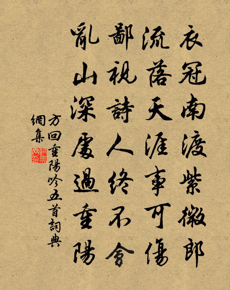 詩詞名句歷史字典書法欣賞書法字典國語詞典說文解字康熙字典古漢語字典標 題 作 者 詩 句 重陽吟五首作者:方回 朝代:宋代重陽吟五首原文衣冠南渡紫微郎,流落天涯事可傷。鄙視詩人終不會,亂山深處過重陽。詩詞問答問:重陽吟五首的作者是誰?答:方回問:重陽吟五首寫於哪個朝代?答:宋代方回重陽吟五首書法欣賞重陽吟五首書法作品詩詞推薦句晏殊〔宋代〕爭持白玉萼,共插翠雲鬟。有感項安世〔宋代〕大江千里從西來,憑陵三峽喧如雷。自矜萬頃臨一杯,湧起雪浪吞崔嵬。一過荊門楚天闊,七澤茫茫如減沒。波神陳氏夫人挽章曹彥約〔宋代〕受氏推玄女,來嬪得召南。躬行其誡七,禮盡所從三。孝養衣皆彩,權輿色已藍。霜風吟木末,哀怨不能堪。禪人寫師真請贊釋慧遠〔宋代〕祝髮何早,聞道何晚。出林猛虎靠山,當路毒蛇開眼。重不重漏泄,擬不擬便著。借問呂望六韜,何似黃公三略。秋老,四境雨已沛然,晚坐籌邊樓,方議祈晴范成大〔宋代〕歲晚羈懷有所思,秋來病骨最先知。鏡中公案已甘老,紙上課程休諱痴。西堰頗聞江漲急,東山猶說雨來遲。錦城山丹花二首佚名〔宋代〕人間花木眼曾經,未識斯花狀與名。丹卻青山暮春色,續他紅樹墜時英。偈頌一百五十首釋心月〔宋代〕披牯牛皮,輥瞎驢隊。帶水拖泥,東倒西{左犭右屯}。黃梅七百無人會。無題三首馬廷鸞〔宋代〕口語甘時心獨異,中邊甜處味方宜。詩情合薦東坡老,慚愧當年蜜荔枝。寄廣西漕陳魯叟誥院戴復古〔宋代〕回首元龍百尺樓,一時詩酒記同游。好山歷歷在人眼,流水滔滔任客舟。歸雁欲從何處去,落花恨不為春留。錦囊和洪秀才八首胡寅〔宋代〕鄙人聞道晚,何以播芳猷。未就三年刻,還驚一葉秋。論交無白足,對客有青眸。之子懷仙趣,相期汗漫遊。永初三年七月十六日之郡初發都詩謝靈運〔南北朝〕述職期闌暑。理棹變金素。秋岸澄夕陰。火旻團朝露。辛苦誰為情。遊子值頹暮。愛似莊念昔。久敬曾存故。如何送泉州周尚書仲並〔宋代〕閭里推耆德,門庭只故居。綺羅看富室,丹碧炫新廬。潤屋寶非璧,滿車家有書。功名宜歲晚,帶玉綴金魚。次高季應韻林季仲〔宋代〕杖屨相從秋水濱,便將公作社中人。酒行苦要深浮白,醉去那知倒著巾。把手共憐江國月,回頭休憶野堂春。太平結帶巾佚名〔宋代〕頭巾帶。誰理會。三千貫賞錢,新行條例。不得向後長垂,與胡服相類。法甚嚴,人盡畏。便縫闊大帶,向前面系初除戶曹,喜而言志白居易〔唐代〕詔授戶曹掾,捧認感君恩。感恩非為己,祿養及吾親。弟兄俱簪笏,新婦儼衣巾。羅列高堂下,拜慶正紛紛。俸錢題象山先生帖袁甫〔宋代〕誼重舅聊語甚真,典型滿紙墨猶新。中間多少箴規意,須信親親即是仁。梅花潘良貴〔宋代〕氣欲崢嶸歲欲新,寒梅方信冠群倫。直能平地凌封雪,可是回根迎小春。九畹蕙蘭真上客,千山桃李盡庸人。即今閒十詠仇遠〔宋代〕鳥雀喧秋未肯棲,狂風吹樹影離披。屋邊尚有斜陽在,更看山人一局棋。蜀公范景仁忠文公輓辭四首蘇頌〔宋代〕雅麗文園令,深湛揚大夫。初為蜀詞客,終作漢真儒。榮遇封公爵,歸休職禁塗。逢時致君事。自與二賢殊。寄王密卿李端〔唐代〕酒樂今年少,僧期近日頻。買山多為竹,卜宅不緣貧。志業歸初地,文章寄此身。嵇康雖有病,猶得見情人。名句推薦輕舟泛月尋溪轉,疑是山陰雪後來李白《東魯門泛舟二首》 渡頭楊柳青青。枝枝葉葉離情。晏幾道《清平樂·留人不住》 王師北定中原日,家祭無忘告乃翁。陸游《示兒》 嗚呼!楚雖三戶能亡秦,豈有堂堂中國空無人!陸游《金錯刀行》 人行事施予,以利之為心,則越人易和;以害之為心,則父子離且怨。韓非及後人《韓非子·外儲說左上》 想牧之、千載尚神遊,空山冷。吳潛《滿江紅·齊山繡春台》 轡搖銜鐵。蹴踏平原雪。張炎《清平樂·平原放馬》 歷覽前賢國與家,成由勤儉破由奢。李商隱《詠史二首·其二》 十分不耐煩,乃為人大病;一味學吃虧,是處事良方。王永彬《圍爐夜話·第五四則》 黯然銷魂者,唯別而已矣!江淹《別賦》
