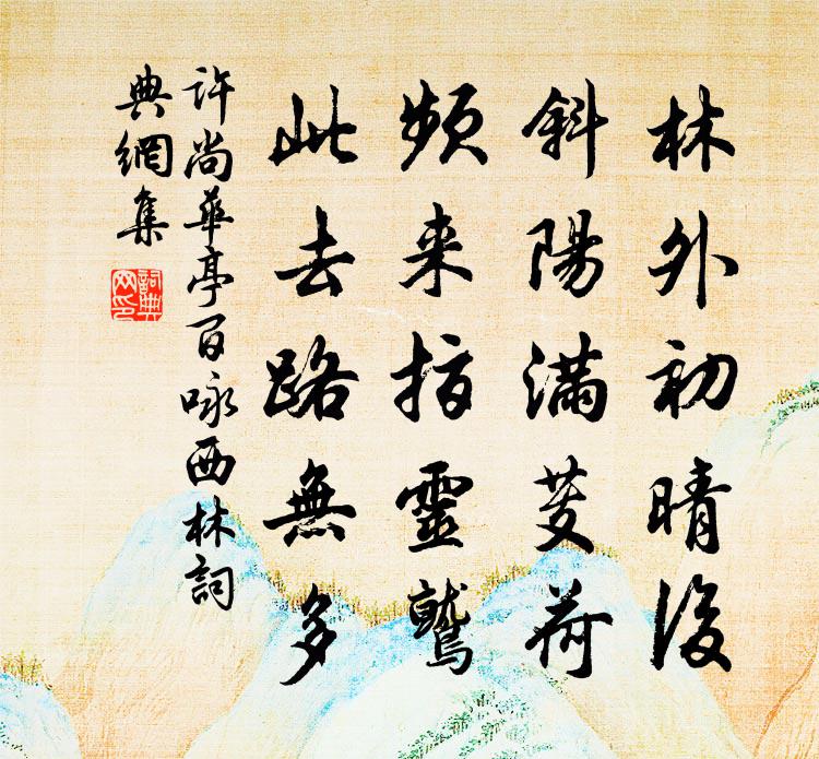 詩詞名句歷史字典書法欣賞書法字典國語詞典說文解字康熙字典古漢語字典標 題 作 者 詩 句 華亭百詠西林作者:許尚 朝代:宋代華亭百詠西林原文林外初晴後,斜陽滿芰荷。頻來指靈鷲,此去路無多。詩詞問答問:華亭百詠西林的作者是誰?答:許尚問:華亭百詠西林寫於哪個朝代?答:宋代許尚華亭百詠西林書法欣賞華亭百詠西林書法作品詩詞推薦感花吳芾〔宋代〕嗟我明年是七旬,此生能見幾番春。憑誰為補青天漏,放出春光處處新。夜雨陸游〔宋代〕初夏雨淋浪,檐聲繞四廊。感深頭易白,睡少漏偏長。紅捲簾旌濕,潤生衣焙香。清吟欲排悶,三嘆不成章。烏夜啼佚名〔宋代〕洗淨鉛華污,玉顏自發輕紅。無言雪月黃昏後,別是個丰容。骨瘦難禁消瘦,香寒不並芳穠。與君高卻看花眼,紅胡笳曲三拍文天祥〔宋代〕三年奔走空皮骨,三年笛里關山月。中天月色好誰看,豺狼塞路人煙絕。寒刮肌膚北風利,牛馬毛零縮如蝟。塞上寄陳正已曾極〔宋代〕十載憂近發半華,東山有意淨胡沙。公車戰策三千牘,腹笥兵書五十家。好佩青萍光奪月,莫驚赤羽氣成霞。嗟予酬樂天聞新蟬見贈劉禹錫〔唐代〕碧樹鳴蟬後,煙雲改容光。瑟然引秋氣,芳草日夜黃。夾道喧古槐,臨池思垂楊。離人下憶淚,志士激剛腸。昔聞龍尾洪咨夔〔宋代〕淺磧苕花紫,平畦芋梗紅。暝收漁筏雨,涼入酒帘風。客路三年夢,官身兩鬢蓬。誰知龍尾道,卻在鹿頭東。代扶風主人答王昌齡〔唐代〕殺氣凝不流,風悲日彩寒。浮埃起四遠,遊子彌不歡。依然宿扶風,沽酒聊自寬。寸心亦未理,長鋏誰能彈。主人和馮亞寄進士孫磻魏野〔宋代〕閒思生白髮,懶更把菱花。久別何州住,相尋恐路差。獨飛傷寒雁,會宿羨林鴉。猶得君為友,時過老母家。蔣丞相得男帖贊岳珂〔宋代〕仕遭時,相真主。材之充,澤斯普。以端逸,御妍嫵。諒予言,法當取。嘉禾百詠何城張堯同〔宋代〕報越心何壯,貪齊計已輕。忠言殊不聽,何用築斯城。聲聲慢 秋聲蔣捷〔宋代〕黃花深巷,紅葉低窗,淒涼一片秋聲。豆雨聲來,中間夾帶風聲。疏疏二十五點,麗譙門、不鎖更聲。故人遠,問西江月(立春)翁元龍〔宋代〕畫閣換粘春帖,寶箏拋學銀鉤。東風輕滑玉釵流。纖就燕紋鶯繡。隔帳燈花微笑,倚窗雲葉低收。雙鴛刺罷底尖頭韋使君宅海榴詠皇甫曾〔唐代〕淮陽臥理有清風,臘月榴花帶雪紅。閉閣寂寥常對此,江湖心在數枝中。香積廚法文釋印肅〔宋代〕咦,好辨心,以此三法為三昧,無量無邊世不會。我今修供佛眾生,萬聖千賢悉同共。摩訶般若味真如,十波羅蜜送崔少蓬南歸五首洪咨夔〔宋代〕富貴紛探驪,功名競騎虎。眉端萬國愁,公意良獨苦。五年安邊功,絕口不自語。仙帆去蓬萊,急流一砥柱。乙卯種牡丹姜特立〔宋代〕課仆舁豐壤,辛勤種牡丹。不知從此去,更得幾春看。艷聲歌(太平時七首)賀鑄〔宋代〕蜀錦塵香生襪羅。小婆娑。個儂無賴動人多。是橫波。樓角雲開風卷幕,月侵河。纖纖持酒艷聲歌。奈情何。送勉華嚴見本師釋紹曇〔宋代〕秦望山前撞老爺,一拳打得鼻頭喎。衲僧氣息都忘了,無復尋香嗅雜華。食罷書字范成大〔宋代〕甲子霖涔雨,東南濕蟄風。荔枝梅子綠,豆蔻杏花紅。捫腹蠻茶快,扶頭老酒中。荒隅經歲客,土俗漸相通。名句推薦寒日蕭蕭上瑣窗,梧桐應恨夜來霜。李清照《鷓鴣天·寒日蕭蕭上瑣窗》 一顧傾人城,再顧傾人國。李延年《李延年歌》 閒鷺棲常早,秋花落更遲。錢起《谷口書齋寄楊補闕》 君人者不可以不慎取臣,匹夫不可不慎取友。友者,所以相有也。荀子《荀子·大略》 漢家君臣歡宴終,高議雲台論戰功。王維《少年行四首》 思其艱以圖其易佚名《尚書·周書·君牙》 一語不入意,從君萬曲梁塵飛。李白《夜坐吟》 崑崙之高有積雪,蓬萊之遠常遺寒。王令《暑旱苦熱》 留戀海棠顏色、過清明。張輯《南歌子·柳戶朝雲濕》 有錢道真語,無錢語不真。佚名《增廣賢文·上集》