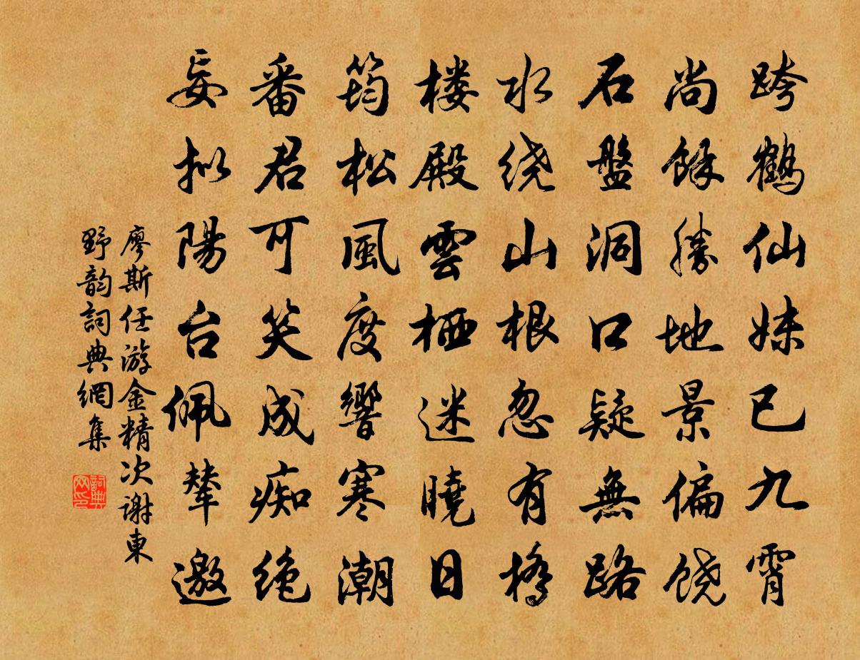 詩詞名句歷史字典書法欣賞書法字典國語詞典說文解字康熙字典古漢語字典標 題 作 者 詩 句 游金精次謝東野韻作者:廖斯任 朝代:宋代游金精次謝東野韻原文跨鶴仙妹已九霄,尚餘勝地景偏饒。石盤洞口疑無路,水繞山根忽有橋。樓殿雲棲迷曉日,筠松風度響寒潮。番君可笑成痴絕,妄擬陽台佩輦邀。詩詞問答問:游金精次謝東野韻的作者是誰?答:廖斯任問:游金精次謝東野韻寫於哪個朝代?答:宋代廖斯任游金精次謝東野韻書法欣賞游金精次謝東野韻書法作品詩詞推薦自贊釋如淨〔宋代〕烏龜殼空索索,打一鑽響剝剝。也是張拳嚇野狐,描邈出來增醜惡。雖然三十年後,只管有人卜度。突出娑婆世界望江南淨圓〔宋代〕娑婆苦,身世一浮萍。蚊蚋睫中爭小利,蝸牛角上竊虛名。一點氣難平。人我盛,日夜長無明。地獄爭頭成隊入,西江月(即席次王華容韻)張孝忠〔宋代〕堂上簪纓交錯,花間簾幕高張。與君一詠一飛觴。莫笑詩狂飲暢。滿路光風轉蕙,吟邊宮柳斜行。新詞妙絕動宮牆三次蘇字韻曾幾〔宋代〕陶詩雖瘠元非枯,確論近出眉山蘇。君詩不贈世作者,以暗投我如投珠。鄙人摹寫不成就,妄指畫狗為於菟。安得古從軍行李頎〔唐代〕白日登山望烽火,黃昏飲馬傍交河。行人刁鬥風沙暗,公主琵琶幽怨多。野雲萬里無城郭,雨雪紛紛連大漠。胡雁城南即事張栻〔宋代〕活泉細引忽盈溝,自繞書齋堦堦流。添得眼前無限思,石橋竹塢共清幽。呈梁從善趙蕃〔宋代〕飄流老矣謂知津,邂逅欣然願卜鄰。不但梁邢丈人行,更吾騷雅社中人。前秋一見遽為別,今日重來情倍親。政自讀本朝史有感十首項安世〔宋代〕非獨蘇仙念老窮,古靈亦復豐孤跨。白頭不得諸公力,惟有西塘八十翁。檢校竹隱竹數三首趙蕃〔宋代〕錢多論以屋,畜多論以谷。我獨何為者,個個數修竹。竹個雖不多,是亦我所欲。於以盜之防,盜防寧此足。句岑參〔唐代〕初程莫早發,且宿灞橋頭。第二百零二卷春懷范成大〔宋代〕柳顰梅笑各相惱,詩債棋讎俱見尋。莫道幽居無一事,春來風物總關心。悲歌行陸游〔宋代〕士如天馬龍為友,雲夢胸中吞 * ,秦皇殿上奪白璧,項羽帳中撞玉斗。張綱本不問狐狸,董龍何足方雞狗。風埃八聲甘州(和魏鶴山韻)吳潛〔宋代〕任渠儂、造物自兒嬉。安能止吾歸。有秋來竹徑,春時花塢,夏里荷漪。何事東塗西抹,空遣鬢毛稀。矯首看鴻鵠次蕭冰崖梅花韻趙希桐〔宋代〕冰姿瓊骨淨無瑕,竹外溪邊處士家。若使牡丹開得早,有誰風雪看梅花。句朱皆〔宋代〕千金常恨鄰難買,一笑那知蓋已傾。石上苔白居易〔唐代〕漠漠斑斑石上苔,幽芳靜綠絕纖埃。路傍凡草榮遭遇,曾得七香車輾來。贈蔡俊民挾雷法妝眼科北行陳杰〔宋代〕乖龍捲雨焦土山,妖蟆蝕晴長夜漫。安得霹靂鞭龍起,取光還天磔蟆死。寥落風霆道術空,坐看短世入盲聾。南人過小圃曹勛〔宋代〕小隱州城北,先謀儋石儲。幾椽將弊屋,數策未看書。碧色新松徑,泉聲舊石渠。欣然終日過,真是愛吾廬。偈傾一百六十九首釋智朋〔宋代〕雙林示滅誑何人,無際真空淨法身。活向春風裹埋了,萬年千載不成塵。賢八詠謝安圍碁姚勉〔宋代〕安石廊廟姿,豈不嫻將略。氐奴驚偉人,良已先得著。名句推薦三月休聽夜雨,如今不是催花。張炎《清平樂·采芳人杳》 陽春布德澤,萬物生光輝。佚名《長歌行》 恐鳳靴,挑菜歸來,萬一灞橋相見。史達祖《東風第一枝·詠春雪》 京國多年情盡改,忽聽春雨憶江南。虞集《聽雨》 午夢初回,捲簾盡放春愁去。周晉《點絳唇·訪牟存叟南漪釣隱》 志以淡泊明,而節從肥甘喪矣。洪應明《菜根譚·概論》 行善濟人,人遂得以安全,即在我亦為快意王永彬《圍爐夜話·第五一則》 蕃甲鎖蛇鱗,馬嘶青冢白。李賀《塞下曲》 美人梳洗時,滿頭間珠翠。鄭遨《富貴曲》 中秋月。月到中秋偏皎潔。徐有貞《中秋月·中秋月》
