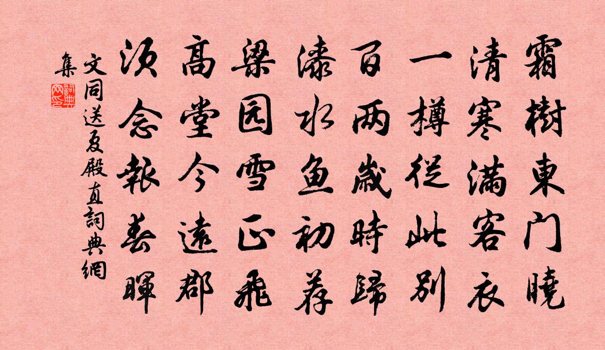 詩詞名句歷史字典書法欣賞書法字典國語詞典說文解字康熙字典古漢語字典標 題 作 者 詩 句 送夏殿直作者:文同 朝代:宋代送夏殿直原文霜樹東門曉,清寒滿客衣。一樽從此別,百兩歲時歸。漆水魚初薦,梁園雪正飛。高堂今遠郡,須念報春暉。詩詞問答問:送夏殿直的作者是誰?答:文同問:送夏殿直寫於哪個朝代?答:宋代文同送夏殿直書法欣賞送夏殿直書法作品詩詞推薦送滕監簿歸寧岳陽梅堯臣〔宋代〕乃翁守西鄙,胡騎敢憑陵。撫士無餘貨,吏以文結繩。向聞來三堂,今復走巴陵。泝流幾千里,雲夢苦炎蒸。風檣感遇之二十陳子昂〔唐代〕玄天幽且默。群議曷嗤嗤。聖人教猶在。世運久陵夷。一繩將何系。憂醉不能持。去去行采芝。勿為塵所欺。詠扇梅堯臣〔宋代〕翦紈成薄質,誰將擬月輪。閔竭夏後德,同我天王仁。及至為時用,豈必畫美人。何憂秋風來,退保藏其真。送湖南張倉解官還建昌九首廖行之〔宋代〕湘俗湘人自戚休,親民誰復念承流。公歸若也嫌名跡,論奏何由達冕旒。家釀酒鄉四首曾幾〔宋代〕醉鄉即是無何有,歡伯相招歸去休。全以箇中為境界,更於底處覓溫柔。小憩栟楮楊萬里〔宋代〕箏輿放下倦騰騰,睡倚胡床撼不應。櫸柳細花吹面落,誤揮團扇撲飛蠅。將適台州曾幾〔宋代〕風林何許著驚禽,惟有台州舊所臨。避地妻孥雖在眼,藏山文字卻關心。維揚大將金城固,建業名臣天槧深。說與修石山方回〔宋代〕土山未甚正,有石亦頗欹。方矩一再度,夙具鍤與箕。晨興命工徒,將一大治之。掃礫斫枯卉,擁泥護芳荑。春雷次韻宋永兄傷時二首黃公度〔宋代〕目斷吳天遠,魂飛楚塞低。六龍巡漠北,萬騎繞淮西。寒月籠煙燧,霜風遞曉鼙。征夫蝴蝶夢,休傍故園棲。鑄鏡歌龍護老人〔唐代〕盤龍盤龍,隱於鏡中。分野有象,變化無窮。興雲吐霧,行雨生風。上清仙子,來獻聖聰。水龍吟·送萬信州吳文英〔宋代〕幾番時事重論,座中共惜斜陽下。今朝翦柳,東風送客,功名近也。約住飛花,暫聽留燕,更攀情話。問千牙過闕山城聞笙簫思靈芝宮事作晁說之〔宋代〕笙簫婉孌落人間,目極靈芝宮不還。猶喜遺音吾獨識,且教明月住空山。論筆硯間物薛紹彭〔宋代〕研滴須琉璃,鎮紙須金虎。格筆須白玉,研磨須墨古。越竹滑如苔,更須加萬杵。自封翰墨卿,一書當千戶。別齊之趙蕃〔宋代〕新月淨林木,微風動菰蒲。客子不能寐,拊身念艱虞。忽思騎鯨翁,已去不可呼。樂哉今夕境,忍令墮空虛。南都武陵春日王建〔唐代〕尋春何事卻悲涼,春到他鄉憶故鄉。秦女洞桃欹澗碧,楚王堤柳舞煙黃。波濤入夢家山遠,名利關身客路長。不似獻大京兆薛常侍能鄭谷〔唐代〕恥將官業競前途,自愛篇章古不如。一炷香新開道院,數坊人聚避朝車。縱游藉草花垂酒,閒臥臨窗燕拂書。唯有蝶戀花佚名〔宋代〕因授之以貽崔氏,自是復容之。朝隱而出,暮隱而入,同安於曩所謂西廂者,幾一月矣。張生將之長安,先以情諭長安懷古儲嗣宗〔唐代〕禍稔蕭牆終不知,生人力屈盡邊陲。赤龍已赴東方暗,黃犬徒懷上蔡悲。面缺崩城山寂寂,土埋冤骨草離離。秋風贈章相士魏了翁〔宋代〕我本三生人,寄身軟紅士。方困京華老,誰識新豐旅。稠中有章生,道周忽會雇。謂余有奇骨,往往么告語。許予藤道范寅孫〔宋代〕峻極藤為道,盤旋百轉多。崖懸枯樹杪,澗折怪岩阿。雁入雲霄去,猿從荊刺過。誰雲西蜀險,羅此更如何。名句推薦不痴不聾,不作家翁。司馬光《資治通鑑·唐紀四十》 當君懷歸日,是妾斷腸時。李白《春思》 離宮絕曠,身體摧藏,志念沒沉,不得頡頏。王昭君《怨詞》 孤客傷逝湍,徒旅苦奔峭。謝靈運《七里瀨》 天秋日正中,水碧無塵埃。柳宗元《湘口館瀟湘二水所會》 翠鈿曉寒輕,獨倚鞦韆無力。楊冠卿《如夢令·滿院落花春寂》 外游者,求備於物;內觀者,取足於身。列子及其弟子《列子·仲尼》 一張一弛,文武之道戴聖《禮記·雜記下》 夫惜草茅者耗禾穗,惠盜賊者傷良民。韓非及後人《韓非子·難二》 忽聞歌古調,歸思欲沾巾。杜審言《和晉陵陸丞早春遊望》
