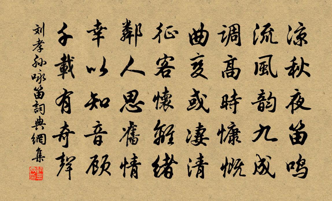 詩詞名句歷史字典書法欣賞書法字典國語詞典說文解字康熙字典古漢語字典標 題 作 者 詩 句 詠笛作者:劉孝孫 朝代:唐代詠笛原文涼秋夜笛鳴,流風韻九成。調高時慷慨,曲變或淒清。征客懷離緒,鄰人思舊情。幸以知音顧,千載有奇聲。詩詞問答問:詠笛的作者是誰?答:劉孝孫問:詠笛寫於哪個朝代?答:唐代問:詠笛是什麼體裁?答:五古劉孝孫詠笛書法欣賞詠笛書法作品注釋全唐詩:卷33_18詩詞推薦蘇州寒食日送人歸覲李頻〔唐代〕江城寒食下,花木慘離魂。幾宿投山寺,孤帆過海門。□聲潑火雨,柳色禁菸村。定看堂高后,斑衣滅淚痕。挽孫庸齋文天祥〔宋代〕淮水奇人物,樞星偉弟兄。泰山開學譜,雲谷發詩源。委吏初行志,修文莫返魂。功名傳久遠,賴有二郎存。拜先外舅墓坐雨用趙景文韻二首陳著〔宋代〕說著韜翁淚泫然,得來展墓及春先。松楸舊壠驚如許,風雨寒宵坐有緣。餘味淡交微醉酒,回頭流俗未烹鮮。明朝涼棚艾性夫〔宋代〕數柱伶俜不架椽,密鋪松發厚如氈。御風難覓深蓬島,障日聊成矮木天。肥瓠引藤高浥露,閒花借蔭省澆泉。熱時先公三池祠室學官相傳占為公署同年李南才毅李流謙〔宋代〕一椽不得留遺愛,百世寧能保奉嘗。豚犢無稱益先美,碎碑伐樹亦尋常。思帝鄉·春日游韋莊〔唐代〕春日游,杏花吹滿頭,陌上誰家年少,足風流,妾擬將身嫁與,一生休。縱被無情棄,不能羞。句劉昭禹〔唐代〕句向夜深得,心從天外歸。(見《紀事》)危樓聊側耳,高柳又鳴蟬。(《秋日登樓》,見《吟窗雜錄》)蘚色圍二郎神(七夕)張孝祥〔宋代〕坐中客。共千里、瀟湘秋色。漸萬寶西成農事了,稏看、黃雲阡陌。喬□橘洲風浪穩,岳鎮聳、倚天青壁。追前梅花喜神譜爛熳二十八枝宋伯仁〔宋代〕很禽忘所儔,翻身拿鳥雀。羽毛同所天,何奪強凌弱。漂泊鄭谷〔唐代〕槿墜蓬疏池館清,日光風緒淡無情。鱸魚斫鱠輸張翰,橘樹呼奴羨李衡。十口漂零猶寄食,兩川訊息未休兵。黃花感興陸游〔宋代〕築室真須待伯夷,起墳仍合近要離。藥來賊境靈何用,米出胡奴死不炊。下石紛紛驚俗薄,絕弦寂寂嘆吾衰。一尊過盧子俞陳藻〔宋代〕番番留我殺雞多,老齒如今不奈何。本是年凶甘隔闊,論情非為酒來過。水調歌頭張炎〔宋代〕白髮已如此,歲序更駸駸。化機訊息,壯生天籟雍門琴。頗笑論文說劍,休問高車駟馬,袞袞□黃金。蟻在元無夢贈梅谷相士文天祥〔宋代〕當年壽陽額,春風點顏色。後來廣平腸,冰雪峙氣骨。世人識花面,識花還自淺。花有歲寒心,清貞堅百鍊。君家酬潘縣尉王之道〔宋代〕堯明毛文采燦星毛宿,子全毛道義高金玉。傷哉二子不可見,墓上悲風號拱木。逢君論在友話偶及,令我吞聲為渠和元晦後洞山口晚賦張栻〔宋代〕石裂長藤瘦,山圍野路深。寒溪千古思,喬木四時陰。更得尋幽侶,何妨擁鼻吟。笑看雲出岫,誰是此無心。春日幽居示仲固彥沖十絕胡寅〔宋代〕花事先從桃李來,海棠紅杏即相催。化工節度重重好,護得山丹最後開。送大機上白雲 其二王冕〔元代〕東郡雨不歇,西湖水亦高。上人今日去,行李不辭勞。傳法燈無盡,懸崖屋更牢。交情如問訊,謂我只囂囂。除夜野宿常州城外二首蘇軾〔宋代〕行歌野哭兩堪悲,遠火低星漸向微。病眼不眠非守歲,鄉音無伴苦思歸。重衾腳冷知霜重,新沐頭輕感發稀。多謝惱自澄李群玉〔唐代〕常聞天女會,玉指散天花。莫遣春風裡,紅芳點袈裟。名句推薦百年成之不足,一旦壞之有餘。佚名《增廣賢文·上集》 江山如有待,花柳自無私。杜甫《後游》 兩岸猿聲啼不住,輕舟已過萬重山李白《早發白帝城/白帝下江陵》 何夜無月?何處無竹柏?但少閒人如吾兩人者耳。蘇軾《記承天寺夜遊 / 記承天夜遊》 寫不了相思,又蘸涼波飛去。朱彝尊《長亭怨慢·雁》 朱門酒肉臭,路有凍死骨。杜甫《自京赴奉先縣詠懷五百字 / 自京赴奉先詠懷五百字》 尺蠖之屈,以求信也;龍蛇之蟄,以存身也。佚名《易傳·繫辭傳下·第五章》 好風朧月清明夜,碧砌紅軒刺史家。白居易《清明夜》 古路無行客,寒山獨見君。劉長卿《碧澗別墅喜皇甫侍御相訪》 不成便沒相逢日,重整釵鸞箏雁。張翥《陌上花·有懷》