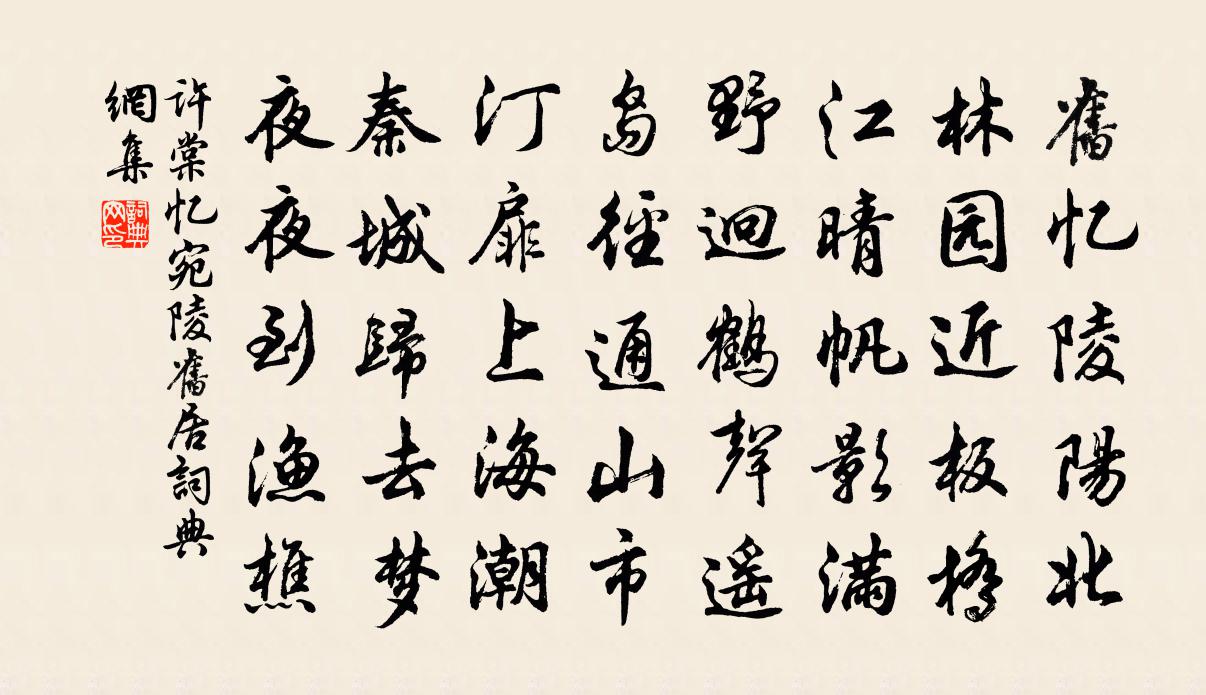 詩詞名句歷史字典書法欣賞書法字典國語詞典說文解字康熙字典古漢語字典標 題 作 者 詩 句 憶宛陵舊居作者:許棠 朝代:唐代憶宛陵舊居原文舊憶陵陽北,林園近板橋。江晴帆影滿,野迥鶴聲遙。島徑通山市,汀扉上海潮。秦城歸去夢,夜夜到漁樵。詩詞問答問:憶宛陵舊居的作者是誰?答:許棠問:憶宛陵舊居寫於哪個朝代?答:唐代問:憶宛陵舊居是什麼體裁?答:五律許棠憶宛陵舊居書法欣賞憶宛陵舊居書法作品注釋全唐詩:卷604-59詩詞推薦詰燕戴復古〔宋代〕去年汝來巢我屋,梁間污泥高一尺。啄腥拋穢不汝厭,生長群雛我護惜。家貧惠愛不及人,自謂於汝獨有力。不望桂莊姚勉〔宋代〕不求田二頃,只種桂為仁。坐與茲山對,靜中天地春。寄題德莊二首韓元吉〔宋代〕報陟西樞掾,遙憐勢未行。葬親嘗有請,去國豈無名。松菊關心在,江山到眼青。琵琶洲畔宅,歸計幾時成。杜鵑釋文珦〔宋代〕遊魂變化事無涯,吳蜀相望萬里賒。回首故宮歸不得,聲聲啼血染山花。送友封元稹〔唐代〕輕風略略柳欣欣,晴色空濛遠似塵。斗柄未回猶帶閏,江痕潛上已生春。蘭成宅里尋枯樹,宋玉亭前別故人。心斷登望湖樓林季仲〔宋代〕胡塵漠漠暗中州,無力持顛漫自憂。花鳥相逢非昔日,不堪重上望湖樓。獨坐二首杜甫〔唐代〕竟日雨冥冥,雙崖洗更青。水花寒落岸,山鳥暮過庭。暖老須燕玉,充飢憶楚萍。胡笳在樓上,哀怨不堪聽。白狗池州和同官詠梅花張道洽〔宋代〕有月色逾淡,無風香自生。霜崖和樹瘦,冰壑養花清。政爾疎還冷,忽然斜又橫。千林成獨韻,難弟又難兄。江南作(一作江上旅泊)張祜〔唐代〕楚塞南行久,秦城北望遙。少年花已過,衰病柳先凋。客淚收回日,鄉心寄落潮。殷勤問春雁,何處是煙霄。寒甚晁說之〔宋代〕二月春風著意來,氈裘北客尚低回。只應是日無何遜,江上梅花未肯開。桂州陶弼〔宋代〕亂草藏邊路,寒禽下戍樓。伏波渠水淺,難載濟川舟。玉關寄長安李主簿岑參〔唐代〕東去長安萬里餘,故人何惜一行書。玉關西望堪腸斷,況復明朝是歲除。游劉園分韻得峽字趙汝鐩〔宋代〕園林十畝余,此邦人推甲。匝谷篔簹淨,循沼芙蓉夾。波暖游魚樂,機忘飛鷗狎。劇談互揮塵,曲欄憑鬥鴨。棋仙閔雨詩李覯〔宋代〕吳江之南,是曰豐國。五種之生天下食,一歲不登,吾民菜色。如何天不仁,縱彼旱孽稱其神。矯矯赤龍推火軒,慶元改元浦城桑田大稔余按視次告父老曾豐〔宋代〕農桑初軫素餐憂,幸爾天然大有秋。壯穗凝鎌黃{左禾右罷}稏,柔絲滑杼白綢繆。黎明婦女放雞犬,薄暮兒童歸七夕楊億〔宋代〕東西燕子伯勞飛,新月如鉤玉露垂。河鼓天孫信靈匹,鵲橋星渚有佳期。穿鍼乞巧佇立久,織素成章報答遲。定與送胡伯量劉宰〔宋代〕我本山澤人,飄然如野鶴。夫君九皋來,氣類頗相若。相逢宿不再,別去天一角。君從浮丘游,度世得良藥。渴飲漁家傲可旻〔宋代〕我佛蓮華隨步踏。黃金妙相青螺發。因地曾將洪誓發。四十八。眾生盡度成菩薩。宮殿紅香華影合。寶階三道琉璃寄趙靈秀翁卷〔宋代〕千山落葉深,高樹不藏禽。遊子在何處,故人勞此心。閒燈妨遠夢,寒雨亂愁吟。僧奭曾相約,花時共一尋。句羅椿〔宋代〕春消千嶂雪,清逼五湖秋。名句推薦爐火照天地,紅星亂紫煙。李白《秋浦歌十七首》 神人之言微,聖人之言簡,賢人之言明,眾人之言多,小人之言妄。陳繼儒《小窗幽記·集醒篇》 若到江南趕上春,千萬和春住。王觀《卜運算元·送鮑浩然之浙東》 去意徊徨,別語愁難聽。周邦彥《蝶戀花·早行》 堪怨王孫,不記歸期早。梅堯臣《蘇幕遮·草》 去歲江南見雪時,月底梅花發。張孝祥《卜運算元·雪月最相宜》 我歌月徘徊,我舞影零亂。李白《月下獨酌四首·其一》 花漸凋疏不耐風,畫簾垂地晚重工,墮階縈蘚舞愁紅孫光憲《浣溪沙·花漸凋疏不耐風》 涓流雖寡,浸成江河;爝火雖微,卒能燎野范曄《後漢書·列傳·酷吏列傳》 簾外雨潺潺,春意闌珊。李煜《浪淘沙令·簾外雨潺潺》