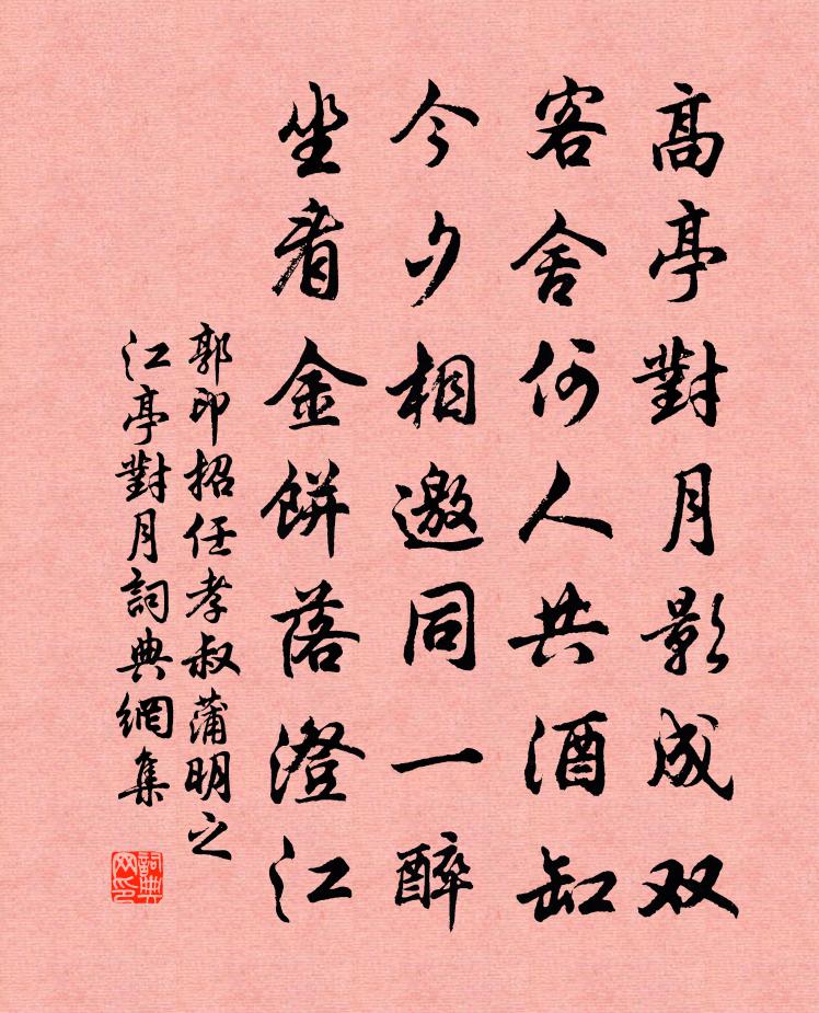 詩詞名句歷史字典書法欣賞書法字典國語詞典說文解字康熙字典古漢語字典標 題 作 者 詩 句 招任孝叔蒲明之江亭對月作者:郭印 朝代:宋代招任孝叔蒲明之江亭對月原文高亭對月影成雙,客舍何人共酒缸。今夕相邀同一醉,坐看金餅落澄江。詩詞問答問:招任孝叔蒲明之江亭對月的作者是誰?答:郭印問:招任孝叔蒲明之江亭對月寫於哪個朝代?答:宋代郭印招任孝叔蒲明之江亭對月書法欣賞招任孝叔蒲明之江亭對月書法作品詩詞推薦入城楊萬里〔宋代〕杜鵑有底怨春啼,燕子無端貼水飛。不種自紅仍自白,野酴醾壓野薔薇。羅察院父瑞桂堂洪咨夔〔宋代〕老仙方寸長黃芽,百順薰蒸到物華。移得廣寒宮裹種,開將后土廟中花。詩書根帶聖賢脈,忠孝馨香今古牙。富貴玉蝴蝶·為甚夜來添病佚名〔宋代〕為甚夜來添病,強臨寶鏡,憔悴嬌慵。一任釵橫鬢亂,永日薰風。惱脂消榴紅徑里,羞玉減蝶粉叢中。思悠悠,垂春日出苑游矚(太子時作)李隆基〔唐代〕三陽麗景早芳辰,四序佳園物候新。梅花百樹障去路,垂柳千條暗回津。鳥飛直為驚風葉,魚沒都由怯岸人。惟願陳留市隱黃庭堅〔宋代〕陳留江端禮季共曰:“陳留市上有刀鑷工,年四十餘,無世家子姓;惟一女年七歲矣,日以刀鑷所得錢與女子醉飽金剛隨機無盡頌嘆仰流通釋印肅〔宋代〕焦琴月下聽,露柱卻知音。世人應不會,側耳立松陰。頌古三十一首釋安永〔宋代〕前箭猶輕後箭深,無限平人被陸沉。個裹豁開天地眼,吹毛拈起任橫行。題楊秘書新居張籍〔唐代〕愛閒不向爭名地,宅在街西最靜坊。徑山傾蓋亭范成大〔宋代〕萬杉離立翠雲幢,嫋嫋稀聞晚吹香。山下行人塵撲面,誰知世界有清涼?觀畫山水陸游〔宋代〕古北安西志未酬,人間隨處送悠悠。騎驢白帝城邊雨,掛席黃陵廟外秋。大綱截江魚可膾,高樓臨路酒如油。老來山居歲暮任璡〔宋代〕讀罷羲文先後天,蕭然一室裊寒煙。山中歲月那知得,但見梅花又一年。西園張耒〔宋代〕滿園紅紫春無限,盡日飛鳴鳥自由。夜雨朝晴風日好,盡舒雲錦不能收。苔封池面草芊綿,鳴蚓跳蛙意若便。頗覺柳州開元寺夏雨呂本中〔宋代〕風雨瀟瀟似晚秋,鴉歸門掩伴僧幽。雲深不見千岩秀,水漲初聞萬壑流。鍾喚夢回空悵望,人傳書至竟沈浮。面如餘姚董役海進有作謝景初〔宋代〕五行交相陵,海水不潤下。處處壞進防,白浪大於馬。顧予為其長,恐懼敢暫舍。董眾完築塞,跋履率曠野。使人梨花陳允平〔宋代〕流鶯偷入未央宮,望斷昭陽信不通。寂寞雨聲寒食夜,一枝香淚泣東風。次答熊去非七夕遇雨見候陳普〔宋代〕五鬼不害道,含沙非殺身。大和一巨毒,西方無人倫。三聖不復作,誰亨萬世屯。喜雪二首曾鞏〔宋代〕欲休還舞任風吹,斷續繁雲作陣隨。已塞茅蹊人起晚,更迷沙渚鳥飛遲。混同天地歸無跡,潤色山川入有為。太守項羽陸游〔宋代〕八尺將軍千里騅,拔山扛鼎不妨奇。范增力盡無施處,路到烏江君自知。花竹圖仇遠〔宋代〕梅癯竹潤楚蘭馨,相約凌波作四清。最愛此君秋一片,湘江煙火曉初晴。霸王廟袁說友〔宋代〕志大無遺策,天亡有愧心。威稜空炯炯,祠殿獨陰陰。木秀千年古,溪流萬折深。江東父老意,羯鼓奏新音。名句推薦疏條交映,有時見日。吳均《與朱元思書》 何處它年寄此生,山中江上總關情。虞集《院中獨坐》 春眠不覺曉,處處聞啼鳥。孟浩然《春曉》 晴野鷺鷥飛一隻,水葓花發秋江碧。皇甫松《天仙子·躑躅花開紅照水》 立非常之事,必俟非常之人。令狐德棻《周書·列傳·卷十四》 但夢想、一枝瀟灑,黃昏斜照水周邦彥《花犯·小石梅花》 晴雲輕漾,薰風無浪,開樽避暑爭相向。薛昂夫《西湖雜詠·夏》 春色將闌,鶯聲漸老。紅英落盡青梅小。寇準《踏莎行·春色將闌》 何處可為別,長安青綺門。李白《送裴十八圖南歸嵩山二首》 夜深風竹敲秋韻,萬葉千聲皆是恨。歐陽修《玉樓春·別後不知君遠近》