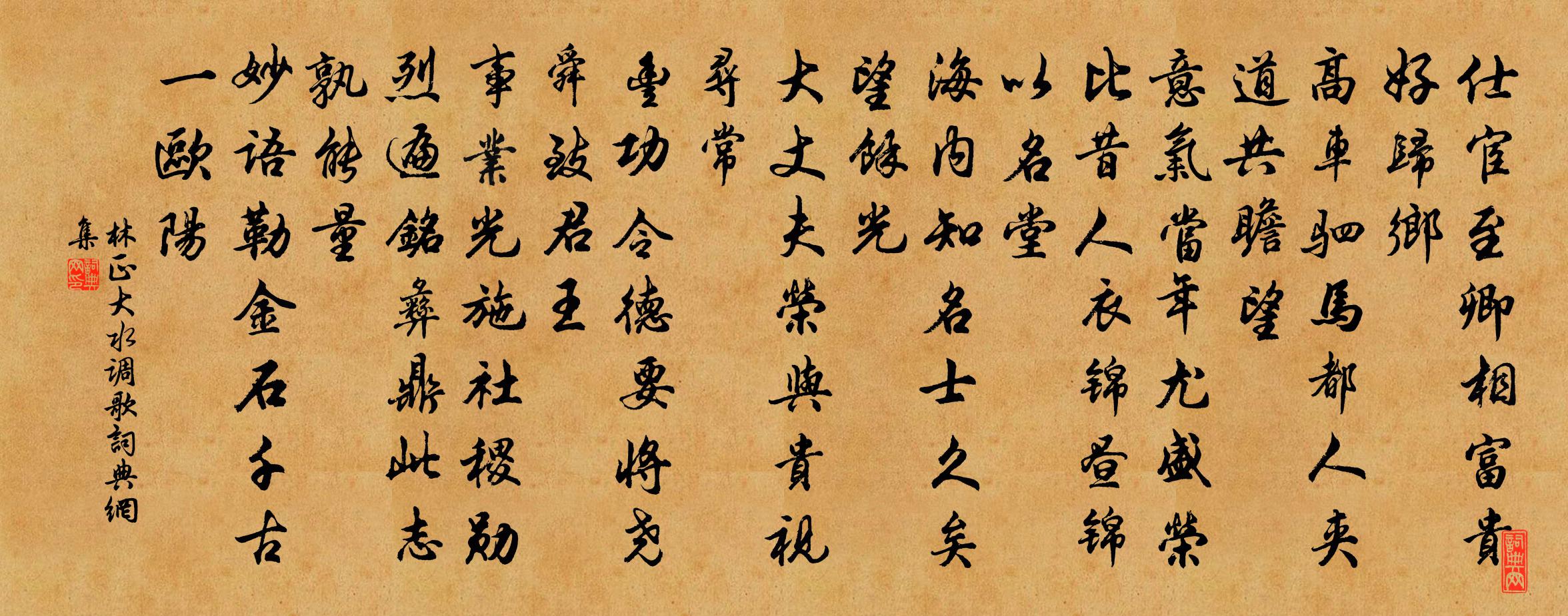 詩詞名句歷史字典書法欣賞書法字典國語詞典說文解字康熙字典古漢語字典標 題 作 者 詩 句 水調歌作者:林正大 朝代:宋代水調歌原文仕宦至卿相,富貴好歸鄉。高車駟馬,都人夾道共瞻望。意氣當年尤盛,榮比昔人衣錦,晝錦以名堂。海內知名士,久矣望餘光。大丈夫,榮與貴,視尋常。豐功令德,要將堯舜致君王。事業光施社稷,勛烈遍銘彝鼎,此志孰能量。妙語勒金石,千古一歐陽。詩詞問答問:水調歌的作者是誰?答:林正大問:水調歌寫於哪個朝代?答:宋代問:水調歌是什麼體裁?答:詞林正大水調歌書法欣賞水調歌書法作品詩詞推薦頌證道歌證道歌釋印肅〔宋代〕不思議,解脫力,不是思量心外得。一句當天八萬門,野橋金柳依依色。徐元敏察院頃和子中兄長篇語頗相屬今承出使周必大〔宋代〕少年同仕秦淮口,醉里殷勤掃花帚。蒼顏白髮二紀中,夢斷賞心並折柳。非才晚污論思地,分察久觀彈擊手。端方題安溪雙清閣陳宓〔宋代〕重開傑閣似天成,氣壓塵闤境自清。一水深澄蒼玉遠,五峰齊峙翠屏橫。未諧廣廈萬間志,且愜行人六月情。蚤晚十六日方回〔宋代〕來往江復浙,擾擾一年間。有子猶相隔,無官亦未閒。病嫌真藥少,債準舊書不。霽雪樓前立,依依憶故山。春晏北園三首宋祁〔宋代〕春物在無幾,景隨人意閒。筍生迷塢缺,花盡失林殷。墜絮來何所,輕雲久未還。持杯問流照,肯信有朱顏。重送白將軍武元衡〔唐代〕紅燭芳筵惜夜分,歌樓管咽思難聞。早知怨別人間世,不下青山老白雲。過摩訶池二首宋祁〔宋代〕十頃隋家舊鑿池,池平樹盡但回堤。清塵滿道君知否,半是當年濁水泥。次韻舒堯文祈雪霧豬泉蘇軾〔宋代〕長笑蛇醫一寸腹,銜冰吐雹何時足。蒼鵝無罪亦可憐,斬頸橫盤不敢哭。豈知泉下有豬龍,臥枕雷車踏陰軸。前年對趙穎歌朱子真〔唐代〕人間幾日變桑田,誰識神仙洞裡天。短促雖知有殊異,且須歡醉在生前。冬夜對月懷彥逢弟王之道〔宋代〕荒庭寒有月,窮巷靜無聲。坐想積年別,遙同今夕明。蹉跎前進士,憔悴老書生。短棹歸來好,邊城久偃兵。蝶戀花(癸卯信豐賦芙蓉)趙師俠〔宋代〕剪剪西風催碧樹。亂菊殘荷,節物驚秋暮。綠葉紅苞迎曉露。錦屏繡幄圍芳圃。塵世鸞驂那肯駐。尚憶層城,仙苑自京還始來龍變軒覓故年幽致閒成長句粗寫虛張繼先〔宋代〕尋得故年香翠團,共將真賞倚闌乾。幾隨白日飛仙變,半為今朝寶黑乾。光冷未粘春物笑,影疏來趁月華看。江南去郡三思方岳〔宋代〕我思渤海龔,一語鋤獷俗。竟令隴畝間,刀劍化牛犢。樵民亦人耳,乃不受約束。時時弄梃刃,誰肯繼往躅。歸來哭金部韋郎中盧照鄰〔唐代〕金曹初受拜,玉地始含香。翻同五日尹,遽見一星亡。賀客猶扶路,哀人遂上堂。歌筵長寂寂,哭位自蒼蒼。歲時鷓鴣天 室人降日以此奉寄魏初〔元代〕去歲今辰卻到家。今年相望又天涯。一春心事閒無處,兩鬢秋霜細有華。山接水,水明霞。滿林殘照見歸鴉。幾時天台隱者林景熙〔宋代〕俗駕不曾到,瘦筇時復攜。肺肝清澗飲,鬢髮老岩棲。野巷猶雞犬,春城自鼓鞞。未應人世外,別有武陵溪。舟中詠落景余清暉輕橈弄溪渚之句蓋孟浩然耶陸游〔宋代〕鏡湖三百里,風止鏡面平;持以照吾心,俗塵安得生?散發鷗鷺間,萬事秋毫輕。誰能拂東絹,寫我孤舟橫?霹靂松鄧肅〔宋代〕老乾千年如削鐵,蟄龍釀春未肯泄。阿香推車動地來,振起虬髭上天闕。砰轟一聲驚倒人,雨勢更挽銀河傾。炎洲題溪東草堂鄭樵〔宋代〕春融天氣露微微,藥草蔥芽脈脈肥。植竹舊竿從茂謝,栽桃新樹忽芳菲。天寒堂上燃柴火,日暖溪東解虱衣。興動南樓懷古五首周弼〔宋代〕茫茫迂曲度平川,何處孤村近水邊。煙護劉琮殘壁壘,雨沉黃祖舊樓船。寒沙細擁菰蘆地,破隴斜耕苜蓿田。見說名句推薦垂下簾櫳。雙燕歸來細雨中。歐陽修《採桑子·群芳過後西湖好》 指點江山,激揚文字,糞土當年萬戶侯 * 《沁園春·長沙》 聽人以言,樂於鐘鼓琴瑟。荀子《荀子·非相》 人生如夢,一尊還酹江月蘇軾《念奴嬌·赤壁懷古》 相見情已深,未語可知心。李白《相逢行二首》 鳥向平蕪遠近,人隨流水東西。劉長卿《謫仙怨·晴川落日初低》 怨別自驚千里外,論交卻憶十年時。高適《東平別前衛縣李寀少府 / 送前衛縣李宷少府》 雨下飛花花上淚,吹不去,兩難禁陳子龍《唐多令·寒食》 滿目山河空念遠,落花風雨更傷春,不如憐取眼前人。晏殊《浣溪沙·一向年光有限身》 朱門沉沉按歌舞,廄馬肥死弓斷弦。陸游《關山月》