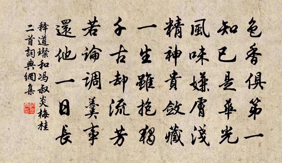 詩詞名句歷史字典書法欣賞書法字典國語詞典說文解字康熙字典古漢語字典標 題 作 者 詩 句 和馮叔炎梅桂二首作者:釋道璨 朝代:宋代和馮叔炎梅桂二首原文色香俱第一,知已是華光。風味嫌膚淺,精神貴斂藏。一生雖抱獨,千古卻流芳。若論調羹事,還他一日長。詩詞問答問:和馮叔炎梅桂二首的作者是誰?答:釋道璨問:和馮叔炎梅桂二首寫於哪個朝代?答:宋代釋道璨和馮叔炎梅桂二首書法欣賞和馮叔炎梅桂二首書法作品詩詞推薦題清芬閣二首陶遷〔宋代〕盧茨源上風煙好,結架遙憐雲水湄。曾是先生親卜築,不妨相國細吟詩。山開兩峽雲來暝,灘急一江帆到遲。作意贈都雍元規田況〔宋代〕醒時莫憶醉時事,今日休言昨日非。池上風光宜共酹,勸君不要半酣歸。南柯子侯善淵〔元代〕坐看華胥景,神遊玩寶方。一雙童子抱龍光。煥煥煌煌,撮聚入中央。產出靈仙子,功成入帝鄉。玉霄榜上應科場劉伶墓林景熙〔宋代〕碧落當年墮酒星,醉中萬事一浮萍。亦知人世無窮事,一醉松根不肯醒。閏月二十日離玉山八月到餘干易舟又二日抵鄱趙蕃〔宋代〕試登雲錦閣,還上揖仙亭。棟宇雖摧落,江山自典型。衝風聊策杖,晚日更揚舲。要寫吳江句,初無六尺屏。久客懷故里宋庠〔宋代〕漢枌遺產接東陂,舒嘯行吟失舊期。嶺上孤猿驚別久,山中芳草怨歸遲。鮒波希潤寧堪待,龍斷求豐忍自欺。負郭不食仙姑山房張籍〔唐代〕寂寂花枝里,草堂唯素琴。因山曾改眼,見客不言心。月出溪路靜,鶴鳴雲樹深。丹砂如可學,便欲住幽林。寒食上已雜吟八章程公許〔宋代〕碧桃花底小寒輕,綽約仙姿格外清。錦繡卷還春去了,藍橋風露放雲英。頌一百則釋重顯〔宋代〕頭兮第一,第二臥龍。不鑒止水,無處有月。波澄有處,無風浪起。棱禪客,棱禪客,三月禹門遭點額。水調歌頭(和王槐城自壽)劉辰翁〔宋代〕未信仙都子,曾識老仙翁仙都,槐城所領宮觀。卿卿少年去後,心與道人同。揮塵不須九錫,開閣苦無長物,閒日灞陵亭高蟾〔唐代〕一條歸夢朱弦直,一片離心白羽輕。明日灞陵新霽後,馬頭煙樹綠相迎。題東溪公幽居李白〔唐代〕杜陵賢人清且廉,東谿卜築歲將淹。宅近青山同謝朓,門垂碧柳似陶潛。好鳥迎春歌后院,飛花送酒舞前檐。客到上陽宮月鮑溶〔唐代〕水北宮城夜柝嚴,宮西新月影纖纖。受環花幌小開鏡,移燭瑤房皆捲簾。學織機邊娥影靜,拜新衣上露華沾。合裁詠史詩瀘水胡曾〔唐代〕五月驅兵入不毛,月明瀘水瘴煙高。誓將雄略酬三顧,豈憚征蠻七縱勞。隱君宅楊維楨〔元代〕隱君宅中區,心游入天境。酌空引窊石,汲深出寒井。檐花度吹香,池葉漏天影。隱几鳴虛琴,悠然有真省。水調歌頭張元乾〔宋代〕平日幾經過,重到更留連。黃塵烏帽,覺來眼界忽醒然。坐見如雲秋稼,莫問雞蟲得失,鴻鵠下翩翩。四海九洲大清平樂劉翰〔宋代〕萋萋芳草。怨得王孫老。瘦損腰圍羅帶小。長是錦書來少。玉簫吹落梅花。曉寒猶透輕紗。驚起半屏幽夢,小窗淡贈靈鷲山道潤禪師院貫休〔唐代〕常恨煙波隔,聞名二十年。結為清氣引,來到法堂前。薪拾紛紛葉,茶烹滴滴泉。莫嫌來又去,天道本泠然。僧道暉疏泉疊石種松竹梅有詩求和次韻戴栩〔宋代〕松下煮茶冰折玉,梅梢掛衲蘚黏綠。莫侵石塢竹邊行,行處明年減新竹。句王琪〔宋代〕結伴不禁鴛瓦冷,羞明常怯玉鉤斜。名句推薦寥落古行宮,宮花寂寞紅。元稹《行宮》 細看不是雪無香,天風吹得香零落。王旭《踏莎行·雪中看梅花》 而今燈漫掛。不是暗塵明月,那時元夜。蔣捷《女冠子·元夕》 無情燕子,怕春寒、輕失花期。晁沖之《漢宮春·梅》 紅樓隔雨相望冷,珠箔飄燈獨自歸。李商隱《春雨》 為問元戎竇車騎,何時返旆勒燕然。皇甫冉《春思》 其服不同,其行猶一也。墨子《墨子·48章 公孟》 逝者如斯夫!不捨晝夜。孔子弟子《論語·子罕篇》 聞君有兩意,故來相決絕。卓文君《白頭吟》 歌中醉倒誰能恨,唱罷歸來酒未消。晏幾道《鷓鴣天·小令尊前見玉簫》