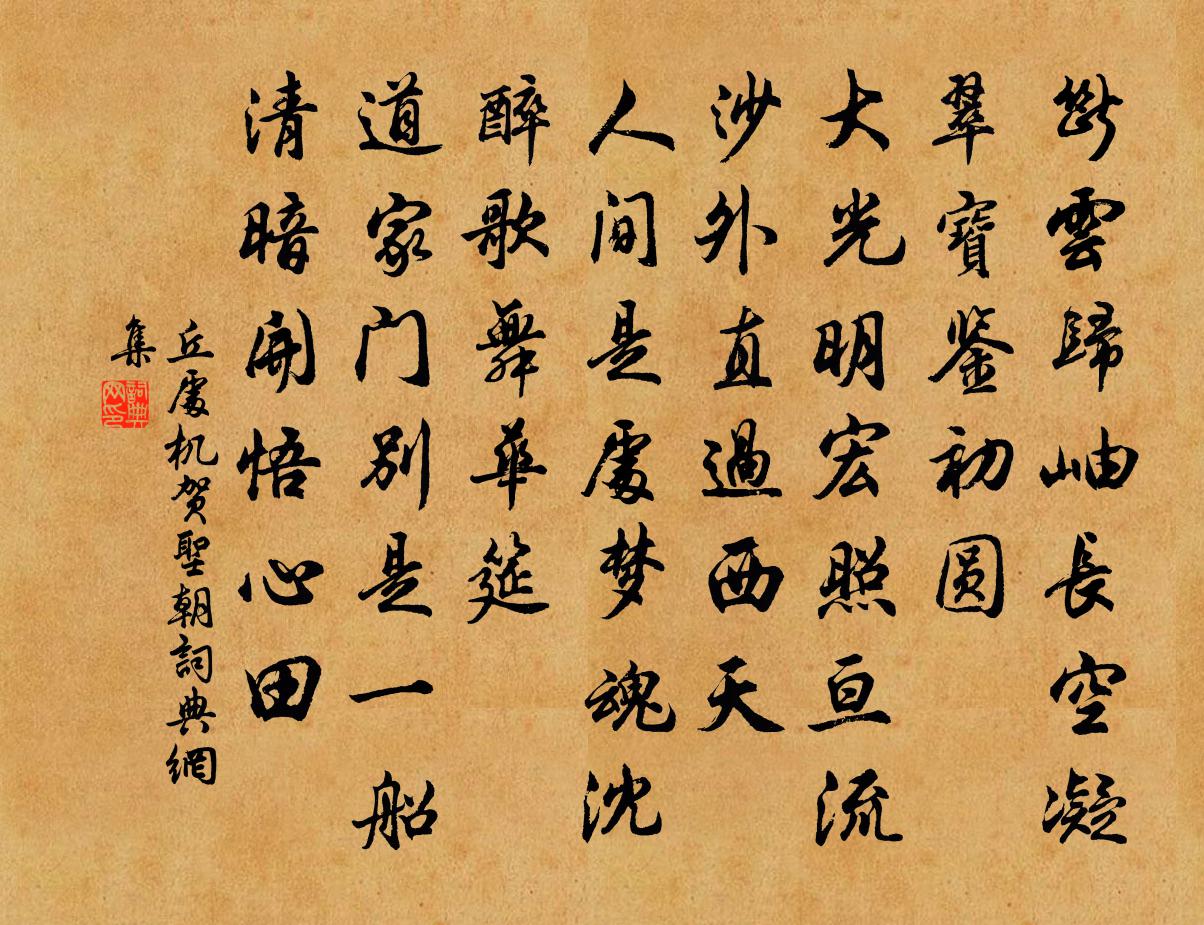 詩詞名句歷史字典書法欣賞書法字典國語詞典說文解字康熙字典古漢語字典標 題 作 者 詩 句 賀聖朝作者:丘處機 朝代:元代賀聖朝原文斷雲歸岫,長空凝翠,寶鑑初圓。大光明宏照,亘流沙外,直過西天。人間是處,夢魂沈醉,歌舞華筵。道家門、別是一船清,暗開悟心田。詩詞問答問:賀聖朝的作者是誰?答:丘處機問:賀聖朝寫於哪個朝代?答:元代問:賀聖朝是什麼體裁?答:詞丘處機賀聖朝書法欣賞賀聖朝書法作品詩詞推薦感舊詩(並引)蘇軾〔宋代〕嘉祐中,予與子由同舉制策,寓居懷遠驛,時年二十六,而子由二十三耳。一日,秋風起,雨作,中夜翛然,始有山居三首廖行之〔宋代〕暖地池塘早綠,春和筍蕨先肥。慣作田家活計,懶隨廛市關機。山泉陳藻〔宋代〕山山迸出細泉流,更瀉高峰瀑布幽。盡入大溪灘石里,古今翻復幾人舟。鶴謠八首白玉蟾〔宋代〕鶴兮鶴兮瑤池兮,若有控以御兮,杳不可詰兮。齊天樂(四明別友)王沂孫〔宋代〕十洲三島曾行處,離情幾番悽惋。墜葉重題,枯條舊折,蕭颯那逢秋半。登臨頓懶。更葵箑難留,薴衣將換。試語再授雲台觀過華陰題此李復〔宋代〕脫身西去度函關,踏雪重過阿對泉。又作蓮花峰上谷,祥飈高御紫虛天。酬吏部竇郎中直夜見寄羊士諤〔唐代〕解巾侍雲陛,三命早為郎。復以雕龍彩,旋歸振鷺行。玉書期養素,金印已懷黃。茲夕南宮詠,遐情愧不忘。滿江紅(和虞土胥·惠生日)魏了翁〔宋代〕月上南箕,還認得、去年星曆。知誰把、一天星象,盪摩朝昔。若使平生渾自棄,如今老大何嗟及。更年來、偏得將至慎邑寄鼎袁說友〔宋代〕踏盡瓊瑤百里山,欲投城郭暮雲間。紅爐速置一壺酒,故歲誰家新歲還。梅溪徙居吾鄉北山下張埴〔宋代〕乾坤如此我,牢落百深杯。腰有難相折,頭無可以抬。南村元亮往,西瀼少陵來。書了深衣帶,千金末矣哉。鄂州節推陳榮緒惠示沿檄崇陽道中六詩老懶不黃庭堅〔宋代〕俗物常偪塞,令人眼生白。永懷洛陽人,談詩論畫壁。青山吐秋月,阻作南樓客。但歌靡鹽詩,賞此無瑕璧。春日雜詠九首李彌遜〔宋代〕二月忽已破,一春強半過。提壺工喚客,布穀巧當歌。得酒先愁盡,惜花翻恨多。逢辰不為樂,明日復如何。送杜郎中使君赴虔州楊巨源〔唐代〕迢遞南康路,清輝得使君。虎符秋領俗,鵷署早辭群。地遠仍連戍,城嚴本帶軍。傍江低檻月,當嶺滿窗雲。境勝皇祐觀享明堂六首佚名〔宋代〕我將我享,辟我中助。獻終豆入,禮成樂具。飾駕上游,升為高釐。神保聿歸,介北景祚。次韻蔣守張進王之道〔宋代〕邂逅傳杯莫放杯,七年重見夢初回。休嗟歲月堂堂去,且喜旌麾得得來。春至會霑新雨露,時清應掃舊氛埃。如君頌古八首釋元聰〔宋代〕松陰行不盡,疎雨下無時。世事幾興廢,山中人未知。再和陶韻蘇泂〔宋代〕賢達不遺世,後來肯下交。玄發一以變,感此徂年凋。所懷寄絕俗,泰華未為高。牛山縱尋斧,何時解乾霄。仲尼余得石山二座西南道李監場索之附海船歸三山曾豐〔宋代〕長料負山人不多,眼中今失兩嵯峨。非渠偶有夸娥力,如我太行王屋何。【越調】小桃紅_別澉川楊安張可久〔元代〕別澉川楊安撫晚風吹上海雲腥,山色秋偏淨。了得相思去年病,不堪聽,樽前一曲《陽關令》。斜陽恁明,寒波如偈頌一百六十首釋宗杲〔宋代〕二月仲春,久雨不晴。雲門一劄,德非有鄰。名句推薦江上陰雲鎖夢魂,江邊深夜舞劉琨。譚用之《秋宿湘江遇雨》 天涯倦客,山中歸路,望斷故園心眼。蘇軾《永遇樂·彭城夜宿燕子樓》 短籬殘菊一枝黃。正是亂山深處、過重陽。呂本中《南歌子·驛路侵斜月》 尋桃覓柳,開遍南枝未覺。辛棄疾《瑞鶴仙·賦梅》 休別有魚處,莫戀淺灘頭。佚名《增廣賢文·上集》 莫罵酉時妻,一夜受孤淒。佚名《增廣賢文·上集》 莫道不銷魂,簾卷西風,人比黃花瘦。李清照《醉花陰·薄霧濃雲愁永晝》 陰壑生虛籟,月林散清影杜甫《游龍門奉先寺》 風雨牢愁無著處,那更寒蛩四壁。文天祥《酹江月·和友驛中言別》 江流石不轉,遺恨失吞吳。杜甫《八陣圖》