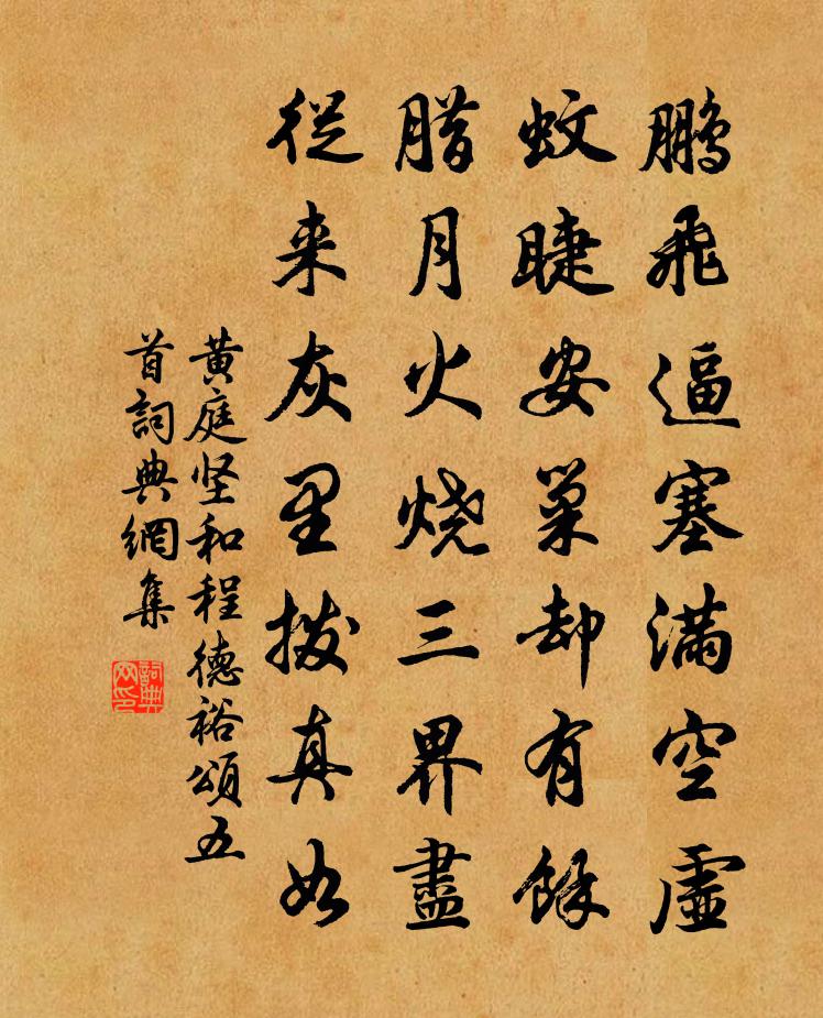 詩詞名句歷史字典書法欣賞書法字典國語詞典說文解字康熙字典古漢語字典標 題 作 者 詩 句 和程德裕頌五首作者:黃庭堅 朝代:宋代和程德裕頌五首原文鵬飛逼塞滿空虛,蚊睫安巢卻有餘。臘月火燒三界盡,從來灰里撥真如。詩詞問答問:和程德裕頌五首的作者是誰?答:黃庭堅問:和程德裕頌五首寫於哪個朝代?答:宋代問:黃庭堅的名句有哪些?答:黃庭堅名句大全黃庭堅和程德裕頌五首書法欣賞和程德裕頌五首書法作品詩詞推薦江如練/蝶戀花賀鑄〔宋代〕睡鴨鱸寒熏麝煎。寂寂歌梁,無計留歸燕。十二曲闌閒倚遍。一杯長待何人勸。不識當年桃葉面。吟詠佳詞,想像劉禪奴彈琵琶歌(感相國韓公夢)顧況〔唐代〕樂府只傳橫吹好,琵琶寫出關山道。羈雁出塞繞黃雲,邊馬仰天嘶白草。明妃愁中漢使回,蔡琰愁處胡笳哀。鬼神追和賈浪仙古鏡徐夤〔唐代〕誰開黃帝橋山冢,明月飛光出九泉。狼藉蘚痕磨不盡,黑雲殘點污秋天。奉陪黃帥機訪問元夕戰場歸途見人家園池花木曹彥約〔宋代〕為渠著姓黃山谷,結友齊名杜審言。領略殘膏沾沔我,強書酬唱入坡門。送僧南遊方乾〔唐代〕三秋萬里五溪行,風裡孤雲不計程。若念猩猩解言語,放生先合放猩猩。封州鄭剛中〔宋代〕莫道封州是小州,封州雖小客何愁。荔枝受暑色方好,茉莉背風香更幽。得醉便眠尋夢蝶,俗行還立看沙鷗。向非春宵有感八首白玉蟾〔宋代〕月落知何處,夜長無了時。幽人春自感,鶯燕亦何如。清河道中雜詠乾隆〔清代〕迎鑾黎庶聚猶多,雨里那曾笠與蓑。愛敬真如子於父,可無惠保計如何。題中元觀次黎才翁韻胡寅〔宋代〕掛了衣冠卻問農,幾回欹枕聽晨鐘。壯懷了與浮雲渺,宿疹猶資大藥功。想像濠梁寧有趣,追尋風馭豈無蹤。道人秋山李廌〔宋代〕山色帶晴雲,雲山遠莫分。寒林迥蕭散,秀氣自氤氳。定有丘園士,彼同麋鹿群。弓旌訪岩谷,誰為上方聞。琴茶白居易〔唐代〕兀兀寄形群動內,陶陶任性一生間。自拋官後春多醉,不讀書來老更閒。琴里知聞唯淥水,茶中故舊是蒙山。窮通清風十韻劉筠〔宋代〕閶闔重門啟,飛簾別館深。歊蒸全已卻,雅興可能任。雲起汾河詠,旌搖楚國心。過簫添爽籟,拂野盪層陰。夕勁建節後偶作楊汝士〔唐代〕拋卻弓刀上砌台,上方台榭與雲開。山僧見我衣裳窄,知道新從戰地來。題趙致道茅齋高斯得〔宋代〕三百年前茅屋歌,誰其繼者茅齋銘。杜陵憂世何其切,鶴山觀物何其精。兩詩妙處均不朽,吾能合異融其真。綺櫳登石台山聯句周仲卿〔宋代〕詩見本書胡融名下。清江引馬致遠〔元代〕西村日長人事少,一個新蟬噪。恰待葵花開,又早蜂兒鬧,高枕上夢隨蝶去了。秋夜集李式西齋趙湘〔唐代〕澤國秋光淡,詩家夜會清。雨余逢月色,風靜得琴聲。小徑幽蟲絕,寒階落葉並。嘗茶不擬睡,自起繞池行。水調歌頭(紫微觀石牛)呂頤浩〔宋代〕一片蒼崖璞,孕秀自天鍾。渾如暖煙堆里、乍放力猶慵。疑是犀眠海畔,貪玩爛銀光彩,精魄入蟾宮。潑墨陰雲妒寄戚子云仇遠〔宋代〕七不有堪一不成,閒雲自恨出山輕。柳枝駱馬愛心斷,蓴菜鱸魚歸興生。薄宦棲棲留泮水,故人渺渺隔台城。對床賀新郎吳潛〔宋代〕說著成淒楚。正塵飛、岷峨灩澦,兔嗥孤舞。頗牧禁中留不住,彈壓征西幕府。便一舸、月汀煙渚。四塞三關天樣名句推薦報答春光知有處,應須美酒送生涯。杜甫《江畔獨步尋花七絕句》 素衣莫起風塵嘆,猶及清明可到家。陸游《臨安春雨初霽》 失意還獨語,多愁只自知。張籍《薊北旅思 / 送遠人》 白雲千里萬里,明月前溪後溪。劉長卿《謫仙怨·晴川落日初低》 鳥之將死,其鳴也哀;人之將死,其言也善。孔子弟子《論語·泰伯篇》 不忍覆余觴,臨風淚數行納蘭性德《菩薩蠻·催花未歇花奴鼓》 此心隨去馬,迢遞過千峰。方乾《送從兄郜 / 韋郜 / 途中別孫璐》 曉戰隨金鼓,宵眠抱玉鞍。李白《塞下曲六首·其一》 野火燒不盡,春風吹又生。白居易《草 / 賦得古原草送別》 聞名不如見面,見面勝似聞名。施耐庵《水滸傳·第三回》