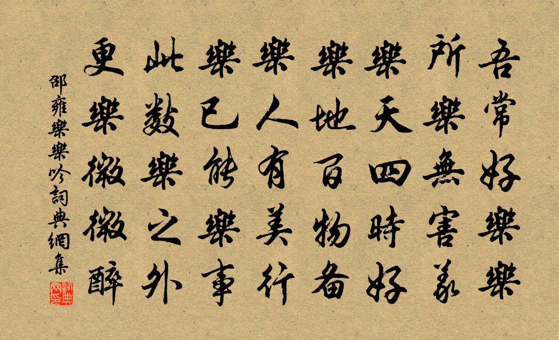 詩詞名句歷史字典書法欣賞書法字典國語詞典說文解字康熙字典古漢語字典標 題 作 者 詩 句 樂樂吟作者:邵雍 朝代:宋代樂樂吟原文吾常好樂樂,所樂無害義。樂天四時好,樂地百物備。樂人有美行,樂已能樂事。此數樂之外,更樂微微醉。詩詞問答問:樂樂吟的作者是誰?答:邵雍問:樂樂吟寫於哪個朝代?答:宋代邵雍樂樂吟書法欣賞樂樂吟書法作品詩詞推薦聞南軒張先生下世感忱有作孫應時〔宋代〕玉山已失舊端明,何事令人骨屢驚。拆石有聲傳建業,隕星無處吊南刑。春風未作山川暖,江水何心日夜頃。淚落會昌元年春五絕句。病後喜過劉家白居易〔唐代〕忽憶前年初病後,此生甘分不銜杯。誰能料得今春事,又向劉家飲酒來。留別東郡諸僚友梅摯〔宋代〕霽雨浮空漲海流,蟲沙龍蜃各優遊。津涯浩蕩雖難測,不見驚瀾曾覆舟。途中逢故人話西山讀書早曾遊覽杜牧〔唐代〕西岩曾到讀書堂,穿竹行莎十里強。湖上夢餘波灩灩,嶺頭愁斷路茫茫。經過事寄煙霞遠,名利塵隨日月長。莫道始生之日石子壽以詩所以相屬這意再三甚厚飲鄭剛中〔宋代〕五月居山書清永,槐度微風舞疏影。兒童喜我懸弧長,灑掃庭除具盤皿。烹鳧雋鵠未易辨,餚核隨時享桃杏。頗當游仰山謁小釋迦塔,訪孚惠二王遺蹟,贈長老范成大〔宋代〕堵田溪淵清洄洄,梅洲問路寒雲堆。連空磴道虯尾滑,竹輿直上無梯階。蒼官來迎夾道立,相逢無言心眼開。翠微同大孫狀元送楊甫之薄中魏野〔宋代〕薄本舜都州,君思獨去游。雲分五老頂,河噴二妃樓。雨足禾初熟,霜遲葉尚稠。此行貧莫嘆,飲餞是三頭。送考功崔郎中赴闕白居易〔唐代〕稱意新官又少年,秋涼身健好朝天。青雲上了無多路,卻要徐驅穩著鞭。和胡經仲中秋吳芾〔宋代〕平生惡晻昧,虛空光陸離。心與此月同,不容一毫疵。恨月有圓缺,不得常清奇。每欲語天公,仍斫此桂枝。青冥句尤袤〔宋代〕歸裝見說渾無物,添得新詩數百篇。將渡江張斛〔金代〕無數飛花委路塵,不堪重醉楚城春。明朝回首江南岸,煙雨昏昏不見人。南康縣用東坡留題韻戴復古〔宋代〕鏡中雙鬢已非鴉,身在江湖心在家。道路飄零如柳絮,山川迤邐近梅花。客行有債頻沽酒,老怕無眠戒飲茶。昨夜金人捧露盤高觀國〔宋代〕楚宮閒,金成屋,玉為闌。斷雲夢、容易驚殘。驪歌幾疊,至今愁思怯陽關。清音恨阻,抱哀箏、知為誰彈。年華任仲微閱世亭張耒〔宋代〕志士抱奇策,常苦不得伸。及其利害出,倏已亡其人。今古同此恨,愚智竟誰分。哀哉老任公,英魄久已淪。惟余歲日作(一作歲日口號)顧況〔唐代〕不覺老將春共至,更悲攜手幾人全。還丹寂寞羞明鏡,手把屠蘇讓少年。謁金門(為韓漕無咎壽)丘崈〔宋代〕槐陰綠。簾卷翠屏山曲。照眼冰壺寒並玉。賜衣便霧縠。熊夢又驚初卜。好在掖垣梧竹。應訝人歸猶未速。已頒新偈頌二百零五首釋正覺〔宋代〕輕煙羃羃衲僧家,節物迎春氣象華。流水落華無限意,游山訊息付長沙。偈頌一百零一首釋慧性〔宋代〕不知立處高多少,回頭四顧白雲低。等閒移步毗顱頂,拽轉南辰安向西。龍潭陳師道〔宋代〕清淵下無際,落日迴風瀾。凜然毛髮直,敢以笑語乾。坡陀百尺台,蔥翠萬木蟠。驚飆振積葉,清霜作朝寒。水旱句李公異〔宋代〕海門礙日山雙聳,江北迎人樹幾行。名句推薦博厚,所以載物也。高明,所以覆物也。悠久,所以成物也。子思《中庸·第二十六章》 思牽今夜腸應直,雨冷香魂吊書客。李賀《秋來》 自是荷花開較晚,孤負東風。幼卿《浪淘沙·極目楚天空》 春眠不覺曉,處處聞啼鳥。孟浩然《春曉》 故鄉遙,何日去。家住吳門,久作長安旅。周邦彥《蘇幕遮·燎沉香》 三山半落青天外,二水中分白鷺洲李白《登金陵鳳凰台》 可能無意傳雙蝶,盡付芳心與蜜房。宋祁《落花》 畫樓春早,一樹桃花笑。凌廷堪《點絳唇·春眺》 世事漫隨流水,算來一夢浮生。李煜《烏夜啼·昨夜風兼雨》 雁柱十三弦,一一春鶯語。歐陽修《生查子·含羞整翠鬟》