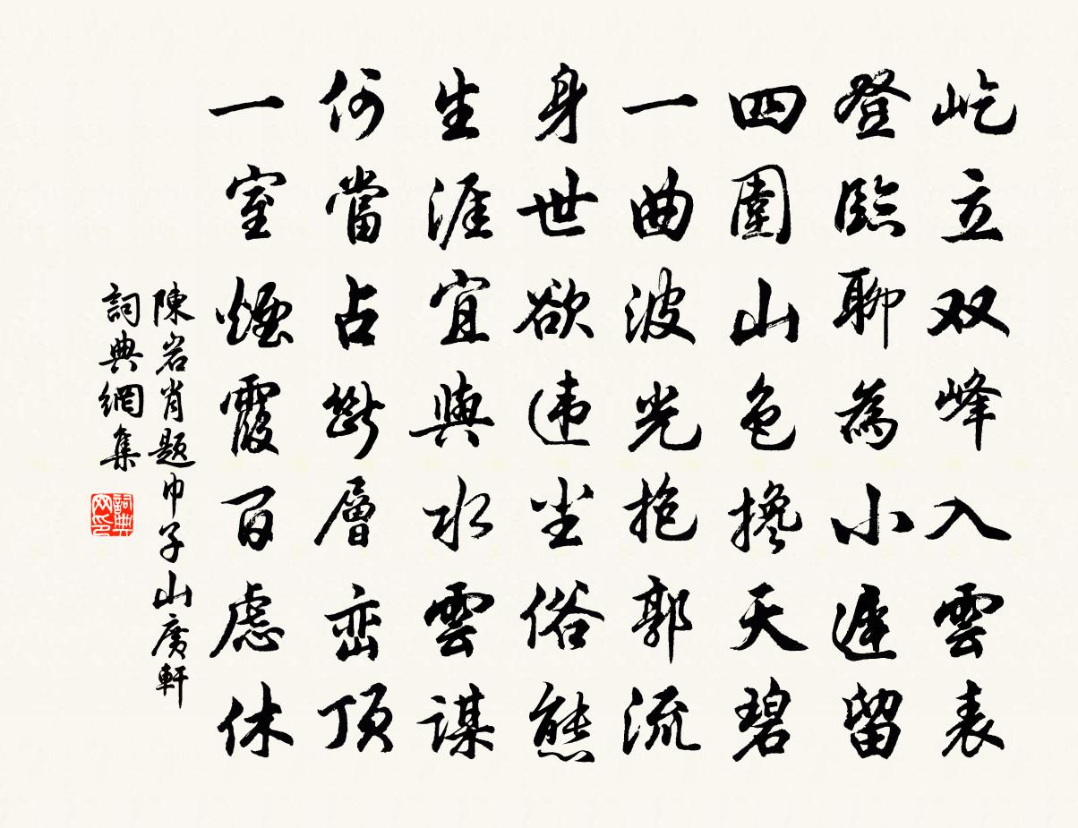 詩詞名句歷史字典書法欣賞書法字典國語詞典說文解字康熙字典古漢語字典標 題 作 者 詩 句 題巾子山廣軒作者:陳岩肖 朝代:宋代題巾子山廣軒原文屹立雙峰入雲表,登臨聊為小遲留。四圍山色攙天碧,一曲波光抱郭流。身世欲違塵俗態,生涯宜與水雲謀。何當占斷層巒頂,一室煙霞百慮休。詩詞問答問:題巾子山廣軒的作者是誰?答:陳岩肖問:題巾子山廣軒寫於哪個朝代?答:宋代陳岩肖題巾子山廣軒書法欣賞題巾子山廣軒書法作品詩詞推薦白芍藥塞爾赫〔清代〕瓊簾入夜卷瓊鉤,謝女懷香倚玉樓。風暖月明嬌欲墮,依稀殘夢在揚州。鹿鳴燕次韻和權師湯提刑時二弟皆預鄉薦項安世〔宋代〕使家親勸駕,賤子辱同升。曉月鴒原聚,秋空雁字凌。燕山慚五桂,西海繼三鵬。況藉吹噓力,扶搖正可乘。邵武葉祖洽〔宋代〕江南煙雨蔽征輪,行近樵陽景漸真。鳥語乍聞如夢寐,林光初見長精神。洞仙歌趙長卿〔宋代〕有岩桂數畝,至秋日花開月滿,攜壺來賞,如到廣寒宮殿,因賦此廣寒宮殿,不在人間世。分付天香與岩桂。向西題張博士新居賈島〔唐代〕青楓何不種,林在洞庭村。應為三湘遠,難移萬里根。鬥牛初過伏,菡萏欲香門。舊即湖山隱,新廬葺此原。和元少尹新授官白居易〔唐代〕官穩身應泰,春風信馬行。縱忙無苦事,雖病有心情。厚祿兒孫飽,前驅道路榮。花時八入直,無暇賀元兄。頌古五首釋原妙〔宋代〕涅槃地獄本無差,只為從來被眼遮。三腳瞎驢才{左足右孛}跳,鑊湯爐炭即吾家。次韻宋尚書山居十五詠金沙荼靡徑方岳〔宋代〕露浥晴光對洗妝,柔條無力不成行。阿環淡佇阿嬌麗,一種風流各自香。十月十七日大椿堂小集胡從周季懷以予目疾皆周必大〔宋代〕畏疾甚畏威,目昏口止酒。爾來時一中,免使論薄厚。儀康業廢祀,釀具散莫糾。採藥山已焚,種秫時轉後。門稀病起寫懷周文璞〔宋代〕夕陽蔽天涯,望望不見家。牛半象緯微,咄咄空嗟咨。此時將細碎,說與枝上花。西樓子/相見歡蔡伸〔宋代〕樓前流水悠悠。駐行舟。滿目寒雲衰草、使人愁。多少恨,多少淚,謾遲留。何似驀然拚舍、去來休。訴衷情曾覿〔宋代〕晚妝初試蕊珠宮。隨步異香濃。檀槽緩垂鸞帶,纖指拈春蔥。鶯語巧,上林中。正嬌慵。暫教花下,簾影微開,多人有畫花中四倫者偶記毗陵舊詩即題其上家鉉翁〔宋代〕萬紅深處一花王,猶帶姚家宮樣黃。物物有君還有佐,殿春須屬召公棠。渡北河詩薛道衡〔隋代〕連旌映潊浦。疊鼓拂沙洲。桃花長新浪。竹箭下奔流。塞雲臨遠艦。胡風入陣樓。劍拔蛟將出。驂驚黿欲浮。鴈書懷南遊道友釋智圓〔宋代〕曾聞飛錫入南閩,鶴態雲蹤不可親。靜夜獨吟空對月,昔年聚話更無人。波濤路阻書難到,泉石房閒夢自頻。未省明皇祀圜丘樂章。豫和佚名〔唐代〕大號成命,思文配天。神光肸蠁,龍駕言旋。眇眇閶闔,昭昭上玄。俾昌而大。於斯萬年。十二月初六日抵儀真廨舍次日即出護使客天氣虞儔〔宋代〕王式當年本不來,那堪歲晚犯塵埃。淮分南北誰為梗,路適東西意自哀。錦纜千艘分玉帛,冰河萬處碎瓊瑰。只消寄敦夫弟李若水〔宋代〕秋風秀庭槐,舉子勤朝課。丹詔日邊下,收攬不貲貨。小陸富才藻,振筆追楚些。朱絲有知音,白雪定寡和。銳氣雜曲歌辭蘇摩遮張說〔唐代〕摩遮花本出海西花胡,琉璃花寶服紫髯鬍。聞道皇恩遍宇宙,來時歌舞助歡娛。繡裝帕額寶花冠,夷歌騎舞借人看滿庭芳晁端禮〔宋代〕天與疏慵,人憐憔悴,分甘拋棄簪纓。有時乘興,波上葉舟輕。十里橫塘過雨,荷香細、苹末風清。真如畫,殘霞名句推薦上善若水,水善利萬物而不爭。老子《老子·道經·第八章》 從今若許閒乘月,拄杖無時夜叩門。陸游《游山西村》 前經洛陽陌,宛洛故人稀。王維《送魏郡李太守赴任》 我最憐君中宵舞,道男兒到死心如鐵。辛棄疾《賀新郎·同父見和再用韻答之》 善惡到頭終有報,只盼來早與來遲。佚名《增廣賢文·上集》 芳原綠野恣行事,春入遙山碧四圍。程顥《郊行即事》 西施若解傾吳國,越國亡來又是誰。羅隱《西施》 逢流星兮問路,顧我指兮從左。王逸《九思》 望君煙水闊,揮手淚沾巾。劉長卿《餞別王十一南遊》 遠去不逢青海馬,力窮難拔蜀山蛇。李商隱《詠史二首·其二》