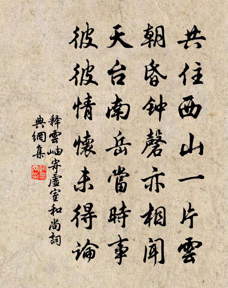 詩詞名句歷史字典書法欣賞書法字典國語詞典說文解字康熙字典古漢語字典標 題 作 者 詩 句 寄虛室和尚作者:釋雲岫 朝代:宋代寄虛室和尚原文共住西山一片雲,朝昏鐘磬亦相聞。天台南嶽當時事,彼彼情懷未得論。詩詞問答問:寄虛室和尚的作者是誰?答:釋雲岫問:寄虛室和尚寫於哪個朝代?答:宋代釋雲岫寄虛室和尚書法欣賞寄虛室和尚書法作品詩詞推薦挽張幾道方惟深〔宋代〕吳郡聲名顧與張,龍門當日共升堂。青衫始見登華省,丹旐俄聞入故鄉。含淚孤兒生面垢,斷腸慈母滿頭霜。嗟君題宇文子友所藏薛公鶴陸游〔宋代〕仙人騏驥絕世稀,卵生凡禽似而非。宮保妙筆窮化機,縞衣玄裳真令威;千年華表聊一歸,回首幸脫乘軒譏。喙吞宮詞一百首岳珂〔宋代〕殿前舞罷聽傳宣,新學霓裳小絳仙。取賜契約教請寶,御書新樣鑄金錢。上元日駕回登樓二首張耒〔宋代〕長街十二遠相通,閶闔峨峨彩霧紅。天白華燈交皓月,樓寒朱幕盪春風。車頭笑語歸時醉,城下傳呼夜向中。自古再用奴字韻寄李廷吉王之道〔宋代〕霜余菊暗荷葉枯,千頭喜見君家奴。離離丹實照綠葉,不減五松官大夫。邇來萬木凍欲死,東君信到梅花須。一枝和駱華分水嶺詩林致誠〔宋代〕一自端明去外台,修途松蓋屬誰栽。仁心既許推仁政,玉筍清班趁早排。賞牡丹謝枋得〔宋代〕蘭佩蓉裳骨相寒,山中何日鼎成丹。春深富貴花如此,一笑尊前醉眼看。次韻李元老柬王令周簿喜雨陳棣〔宋代〕山色雲容潑墨深,隨車甘澍濕衣襟。神龍應禱方施力,虐魃為殃漫有心。洗出篔簹無滯暑,養成{禾罷}稏有餘陰折刑部海棠戲贈聖俞二首歐陽修〔宋代〕搖搖牆頭花,笑笑弄顏色。荒涼眾草間,露此紅的皪。草木本無情,及時如自得。青春不可恃,白日忽已昃。繞之山茶花張鎡〔宋代〕翠翼高攢葉,朱纓澹拂花。來從山塹側,開稱畫檐牙。影薄誰停繡,香清似煮茶。幾多輕斂態,月動夾窗紗。畫鶴虞集〔元代〕薛公少保昔畫鶴,毛羽蕭條向寥廓。通泉縣壁久微茫,故物都非況城郭?長鳴闊步貌閒暇,解寫高情亦奇作。田中宴崔駙馬玉山別業錢起〔唐代〕金榜開青瑣,驕奢半隱淪。玉簫惟送酒,羅袖愛留賓。竹館煙催暝,梅園雪誤春。滿朝辭賦客,儘是入林人。悶題華岳〔宋代〕此心忠義出天資,奴隸兒童莫強為。燕雀不知鴻鵠志,牛羊徒節虎狼皮。事當桀石吠堯日,書在塞鴻歸漢時。拔劍固城湖陽枋〔宋代〕溪平岸闊柳侵沙,潑潑游鱗弄月華。柔櫓數聲深夜悄,漁人相喚隔蘆葭。送邢孟貞還石臼顧夢遊〔清代〕月當分手夜,分外冷高秋。蟲響坐來歇,林風相與幽。到家收晚稻,攜子上湖舟。莫戀衡門好,遲君上酒樓。次陝郊宋祁〔宋代〕驚風吹客夢,西落劍南天。自問何為爾,官牒見嬰纏。遽傳非久舍,黎明徒御喧。俯輪千仞底,仰轡百尋巔。憑高寄題王才臣山居陸游〔宋代〕王子自少無他娛,求佳山林結草廬。頭童齒豁已衰矣,衣弊屢空常晏如。出遊恥懷禰衡刺,歸臥盡讀倚相書。它日次韻高安撫雄楚樓餞別項安世〔宋代〕醉擘鳥絲寫玉欄,坐分鸞{左月右榷去木}膾龍肝。已知全楚風流在,更覺將軍禮數寬。一日樓成供燕餞,明朝岸次韻趙帥四首陳造〔宋代〕北歸客子謾貪忙,河欲生冰野覆霜。他日鸛鵝常避敵,即今竿木又逢場。思遲正坐相如渴,文好知熏武仲香。妙語次韻劉景文見寄蘇軾〔宋代〕淮上東來雙鯉魚,巧將書信渡江湖。細看落墨皆松瘦,想見掀髯正鶴孤。烈士家風安用此,書生習氣未能無。莫因名句推薦見賢思齊焉,見不賢而內自省也。孔子弟子《論語·里仁篇》 秋至搗羅紈,淚滿未能開。江淹《悼室人》 只要你見性志誠,念念回首處,即是靈山。吳承恩《西遊記·第二十四回》 醉月頻中聖,迷花不事君李白《贈孟浩然》 夕陽西下,塞雁南飛,渭水東流。康與之《訴衷情令·長安懷古》 思君若汶水,浩蕩寄南征。李白《沙丘城下寄杜甫》 春陰垂野草青青,時有幽花一樹明。蘇舜欽《淮中晚泊犢頭》 露下旗濛濛,寒金鳴夜刻。李賀《塞下曲》 父之讎,弗與共戴天。兄弟之讎不反兵。交遊之讎不同國。戴聖《禮記·曲禮上》 蠶娘洗繭前溪淥,牧童吹笛和衣浴。貫休《春晚書山家屋壁二首》