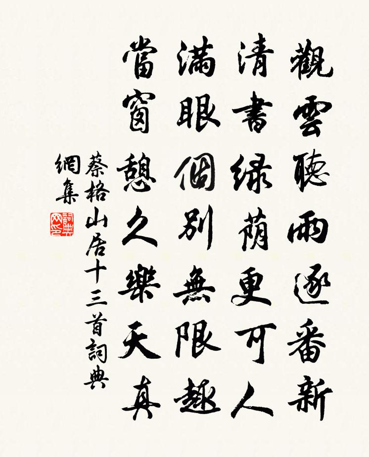 詩詞名句歷史字典書法欣賞書法字典國語詞典說文解字康熙字典古漢語字典標 題 作 者 詩 句 山居十三首作者:蔡格 朝代:宋代山居十三首原文觀雲聽雨逐番新,清書綠蔭更可人。滿眼個別無限趣,當窗憩久樂天真。詩詞問答問:山居十三首的作者是誰?答:蔡格問:山居十三首寫於哪個朝代?答:宋代問:山居十三首是什麼體裁?答:七絕蔡格山居十三首書法欣賞山居十三首書法作品詩詞推薦雪鴣釋斯植〔宋代〕風吹蘆葦鳴,殘雪滿橋板。不見棹回人,愁立沙汀晚。農謠釋文珦〔宋代〕斗種播良田,可收三十石。天予人奪之,耕夫每無食。謝人賀生子卓田〔宋代〕古雲錦被無兒息,此語從來太沒情。熊夢方慚徒吉葉,弧門尚冀或成功。拙軀增累何須慶,寒舍添丁未是榮。不意品令李廌〔宋代〕唱歌須是,玉人檀口,皓齒冰膚。意傳心事,語嬌聲顫,字如貫珠。老翁雖是解歌,無奈雪鬢霜須。大家且道,是郊廟歌辭。祭太社樂章。舒和佚名〔唐代〕神道發生敷九稼,陰極乘仁暢八埏。緯武經文隆景化,登祥薦祉啟豐年。送友人宰湘陰李端〔唐代〕從宦舟行遠,浮湘又入閩。蒹葭無朔雁,檉栝有蠻神。傳吏閒調象,山精暗訟人。唯須千樹橘,暫救李衡貧。奉陪段相公晚夏登張儀樓姚向〔唐代〕秦相駕群材,登臨契上台。查從銀漢落,江自雪山來。儷曲親流火,凌風洽小杯。帝鄉如在目,欲下盡裴回。賀杜清獻入相戴木〔宋代〕玉陛傳呼宰相來,歡騰海內翕如雷。律身清介祁公操,佐主謀謨如晦才。夢弼已知符眾望,生賢益信應三台。從容扶南曲歌詞五首王維〔唐代〕翠羽流蘇帳,春眠曙不開。羞從面色起,嬌逐語聲來。早向昭陽殿,君王中使催。堂上青弦動,堂前綺席陳。齊歌送李城門罷官歸嵩陽(城門院在遺補院東)權德輿〔唐代〕與君相識處,吏隱在牆東。啟閉千門靜,逢迎兩掖通。罷官多暇日,肄業有儒風。歸去塵寰外,春山桂樹叢。相和歌辭。長信怨王諲〔唐代〕飛燕倚身輕,爭人巧笑名。生君棄妾意,增妾怨君情。日落昭陽殿,秋來長信城。寥寥金殿里,歌吹夜無聲。張漕行部過湘岸有作因次其韻陳傅良〔宋代〕春晚得新霽,草木日夜綠。陽光初蔽虧,野暝或單復。美人浮湘波,領此入蓬屋。故放歸帆遲,更呼漁火續。窮探江城子莫蒙〔宋代〕秋堂風露月初弦。望靈源。隱珠躔。曾許東皇,遊戲了塵緣。四海聲名收不得,麾玉節,下清關。相逢只說好江山雜述林泳〔宋代〕竺仟論五百劫,蒙叟夸八千春。但聞堯舜氏作,誰識羲黃上人。木蘭花慢張孝祥〔宋代〕紫簫吹散後,恨燕子,只空樓。念璧月長虧,玉簪中斷,覆水難收。青鸞送碧雲句,道霞扃霧鎖不堪優。情與文梭陪郡侯出郊勸農六絕洪咨夔〔宋代〕勸農冠蓋出江乾,馬上東風觱栗寒。珍重春衫唾花碧,畫眉狼籍道傍看。太常引丘崈〔宋代〕憎人虎豹守天關。嗟蜀道、十分難。說與沐猴冠。這富貴、於人怎謾。忘形尊俎,能言桃李,日日在東山。不醉有示郡南二孫李石〔宋代〕虞初秘府六百本,老子柱下五千言。吾家道學天生種,端有斯文示子孫。觀畫史彌寧〔宋代〕江山梅竹好精神,漁父畦丁也帶真。終是有些堪恨處,畫中更欠著詩人。淳熙四年二月既望靜江守臣張某奉詔勸農於郊張栻〔宋代〕俾一其心,服我訓言。擊鼓坎坎,自古有年。名句推薦都道是金玉良姻,俺只念木石前盟。曹雪芹《終身誤》 橋成漢渚星波外,人在鸞歌鳳舞前。晏幾道《鷓鴣天·當日佳期鵲誤傳》 錦瑟無端五十弦,一弦一柱思華年。李商隱《錦瑟》 潮平兩岸闊,風正一帆懸。王灣《次北固山下》 輕淘起,香生玉塵,雪濺紫甌圓。米芾《滿庭芳·詠茶》 羨青山有思,白鶴忘機。湯恢《八聲甘州·摘青梅薦酒》 秋鬢含霜白,衰顏倚酒紅。尹式《別宋常侍》 暗昧處見光明世界,此心即白日青天。王永彬《圍爐夜話·第七八則》 豹死留皮,人死留名。歐陽修《新五代史·列傳·死節傳第二十》 水滿田疇稻葉齊,日光穿樹曉煙低。徐璣《新涼》