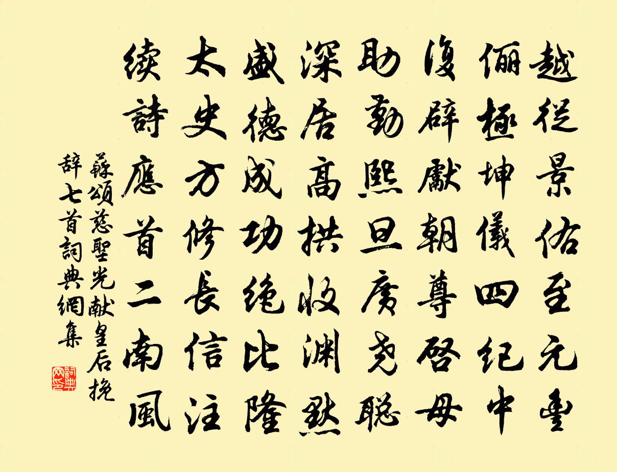 詩詞名句歷史字典書法欣賞書法字典國語詞典說文解字康熙字典古漢語字典標 題 作 者 詩 句 慈聖光獻皇后輓辭七首作者:蘇頌 朝代:宋代慈聖光獻皇后輓辭七首原文越從景佑至元豐,儷極坤儀四紀中。復辟先朝尊啟母。助勤熙旦廣堯聰。深居高拱收淵默,盛德成功絕比隆,太史方修長信注,續詩應首二南風。詩詞問答問:慈聖光獻皇后輓辭七首的作者是誰?答:蘇頌問:慈聖光獻皇后輓辭七首寫於哪個朝代?答:宋代蘇頌慈聖光獻皇后輓辭七首書法欣賞慈聖光獻皇后輓辭七首書法作品詩詞推薦清平樂辛棄疾〔宋代〕清詞索笑。莫厭銀杯小。應是天孫新與巧。剪恨裁愁句好。有人夢斷關河。小窗日飲亡何。想見重簾不捲,淚痕滴虞美人胡文卿〔宋代〕香雲佳氣交盤結。又慶生申節,滿堂簪紱奉霞觴。瑞應台躔南極、見光芒。心田積累陰功足。來受人天福。從今幾金牛驛吳師孟〔宋代〕唱奇騰怪可刪修,爭奈常情勝謬悠。禹貢已書開蜀道,秦人安得糞金牛。萬重山勢隨坤順,一勺天波到海流。自哂見諸公唱和暮春詩軸次韻作九首晁說之〔宋代〕那識春將暮,山頭躑躅紅。潮生芳草遠,鳥滅夕陽空。烏賊家家飯,槽船面面風。三吳窮海地,客恨極難窮。句諶祜〔宋代〕雁寒景落三山月,騎俊神通萬里城。辰十月八日同希周掃松靈石晚步松下愴然有懷謝直〔宋代〕老樹誰所栽,及茲上交蓋。崢嶸仰巨樟,秀髮憐稚檜。悠然攪心思,慨我百年外。我懷引以長,天色慘欲晦。投休又書畫船五首孫嵩〔宋代〕切莫清狂更隱淪,浮家泛宅斷知聞。明朝我欲觀書畫,何處將詩寄水雲。問梅方蒙仲〔宋代〕夜月玉堂前,春風紫蓋邊。想君都看破,寧與我周旋。寄碧瀾趙右之顧逢〔宋代〕交遊歲月深,彼此各知音。佳句不離口,可人長在心。多愁悲白玉,一笑棄黃金。流高同山樂,床頭自有琴。呈胡舍人二首釋寶曇〔宋代〕官閒無事只深禪,齋戒何曾廢客煙。總是老夫貪佛日,未妨天眼識公年。江湖滿意藏詩笥,鷗鳥無心傍客船。參井賦竹居文樽熊瑞〔宋代〕郫筒對峙玉清圓,絕勝當年碧筩蓮。傾釀尚侔春楚楚,開樽猶帶雨涓涓。昔遺溪上晉六處,今入飲中唐八仙。一榻自鹹平至太康鞍馬間得十小詩寄懷晏叔原並問黃庭堅〔宋代〕春色挾曙來,惱人似官酒。酬春無好語,懷我文章友。偈頌五十一首釋道沖〔宋代〕摩竭提國,親行此令。盡大地人,喪身失命。秋思陸游〔宋代〕烏柏微丹菊漸開,天高風送雁聲哀。詩情也似並刀快,翦得秋光入捲來。海棠樓鑰〔宋代〕海棠昨日始萌芽,一夜驚雷發萬葩。老眼恍然何所得,凌雲庵外見桃花。建康道中方回〔宋代〕土入江東厚,民方浙右醇。疏鬆岡路雪,晴麥野田春。往事更離亂,衰年厭苦辛。興亡不須嘆,請看石麒麟。夜夢遇老人於松石間若舊嘗從其游者再拜敘間陸游〔宋代〕遼海曾從化鶴丁,百年塵土污巾瓶。萬山深處遇行李,再拜起時如醉醒。綠樹岩前開藥笈,白驢背上指丹經。雲霄詠史詩長安胡曾〔唐代〕關東新破項王歸,赤幟悠揚日月旗。從此漢家無敵國,爭教彭越受誅夷。傷懷贈故人孟雲卿〔唐代〕稍稍晨鳥翔,淅淅草上霜。人生早罹苦,壽命恐不長。二十學已成,三十名不彰。豈無同門友,貴賤易中腸。驅馬贈張聽聲李石〔宋代〕人言鼻聽無如龍,聽不以耳乃反聾。未若水母本無目,隔水回響相鳴雄。我持此理問張瞍,廢目任耳偏能聰。忍聞名句推薦淮水東邊舊時月,夜深還過女牆來。劉禹錫《金陵五題·石頭城》 白水明田外,碧峰出山後。王維《新晴野望》 長夏村墟風日清,檐牙燕雀已生成。張耒《夏日三首·其一》 留連戲蝶時時舞,自在嬌鶯恰恰啼。杜甫《江畔獨步尋花·其六》 升沉應已定,不必問君平。李白《送友人入蜀》 庭樹不知人去盡,春來還發舊時花。岑參《山房春事二首》 羊腸白道穿雲出,雁齒紅橋亞水低。許德溥《西橋柳色》 大江流日夜,客心悲未央。謝朓《暫使下都夜發新林至京邑贈西府同僚》 晚食以當肉,安步以當車劉向《戰國策·齊四·齊宣王見顏斶》 仁則榮,不仁則辱。今惡辱而居不仁,是猶惡濕而居下也。孟子《孟子·公孫丑章句上·第四節》
