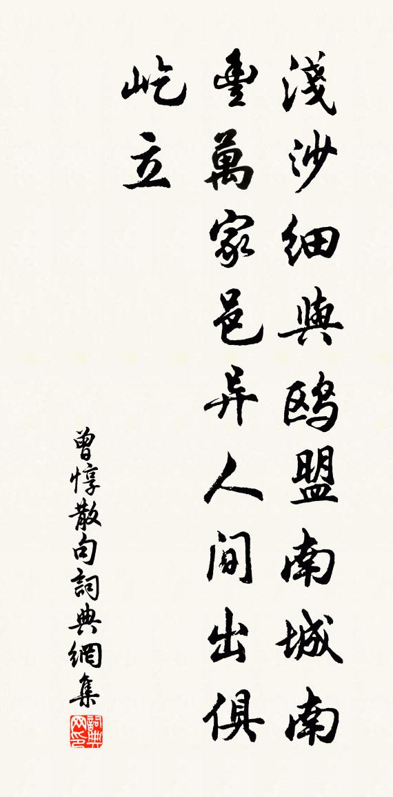 詩詞名句歷史字典書法欣賞書法字典國語詞典說文解字康熙字典古漢語字典標 題 作 者 詩 句 句作者:曾惇 朝代:宋代句原文淺沙細與鷗盟。南城南豐萬家邑,異人間出俱屹立。詩詞問答問:句的作者是誰?答:曾惇問:句寫於哪個朝代?答:宋代曾惇句書法欣賞句書法作品詩詞推薦水調歌頭(橫山閣對月)李彌遜〔宋代〕清夜月當午,軒戶踏層冰。樓高百尺,縹緲天闕敞雲扃。萬里風搖玉樹,吹我衣裾零亂,寒入骨毛輕。徑欲乘之去摘得新皇甫松〔唐代〕摘得新,枝枝葉葉春。管弦兼美酒,最關人。平生都得幾十度,展香茵。次韻參寥三首秦觀〔宋代〕長安仕路與雲齊,倦仆羸驂不可躋。但得玄暉曾折簡,何須平子更安題。雨後過瑪瑙寺陳俞〔宋代〕借屋傍精廬,無事數來往。披草通泉流,刻樹記筍長。微風四山落,小立領松響。詎名息諸緣,暫喜脫塵網。太真入宮圖二首趙文〔宋代〕未舞霓裳寶髻斜,流蘇帳里再盤鴉。君王細看春風面,終是香雲減一些。讀呂舍人詩追次其韻陸游〔宋代〕少壯如昨日,忽已及耄期。舊友散莫收,亦復少新知。言歸鏡湖上,日日醉東籬。自笑如寒蠂,裴回殘菊枝。偈頌一百三十六首釋惟一〔宋代〕馬師一喝大雄峰,直得三日只耳聾。今日松山聾更甚,半年不復聞鼓鍾。依俙鈍鐵,彷佛頑銅。只好投之火聚中,次韻楊君貴來訪陳著〔宋代〕雲自悠悠日自長,棲棲破屋七峰陽。危時不死風潮泡,耄境猶生石火光,銜袖殷勤迂客旆,聯珠錯落照山場。逍遙詠宋太宗〔宋代〕清靜常清靜,緣來盡可行。道高麋鹿性,庸識歲年輕。日昃相依勢,花開觸處明。是非論巧拙,達外福蒼生。留滯高安四年有餘忽得信聞當除官真揚間偶成蘇轍〔宋代〕數間茅屋久蹉跎,四見秋風入薜蘿。北棹偶然追雁羽,南公誰復伴漁蓑。三年賈傅驚吾老,九歲劉郎愧爾多。此去次韻楊廷秀郎中游西湖十絕喻良能〔宋代〕憶昔孤山和靖家,光風霽月總輸他。幾多水草連菸草,無限苹花雜藕花。奉和幸新豐溫泉宮應制武平一〔唐代〕秦王登碣石,周后襲崑崙。何必在遐遠,方稱萬宇尊。我皇順時豫,星駕動軒轅。雄戟交馳道,清笳度國門。回輿減字木蘭花 題雄州驛蔣興祖女〔宋代〕朝雲橫度,轆轆車聲如水去。白草黃沙,月照孤村三兩家。 飛鴻過也,百結愁腸無晝夜。漸近燕山,回首鄉關歸立春方岳〔宋代〕詩儻窮人莫送窮,但窮詩亦不須工。銀幡雪柳人何似,翠縷瓊絲菜則同。百事到頭惟早白,一年彈指又春紅。漁溪春日遣懷王炎〔宋代〕感懷細數十年事,養拙略無終日閒。景物自新春稍稍,吾親漸老發斑斑。豈曾有夢到天上,且任此生浮世間。願約送始安王方略入關蕭衍〔南北朝〕如何吾幼子。勝衣已別離。十日無由宴。千里送遠垂。秋日泛鏡中憩千秋觀陸游〔宋代〕病起重來理釣絲,扁舟迨及素秋時。舊交猶有青山在,幽趣唯應白鳥知。冉冉年光行老矣,茫茫世路欲何之?秦皇魚上冰王季則〔唐代〕北陸收寒盡,東風解凍初。冰消通淺溜,氣變躍潛魚。應節似知化,揚鬐任所如。浮沉非樂藻,沿泝異傳書。結網夏日田園雜興范成大〔宋代〕中秋全景屬潛夫,棹入空明看太湖。身外水天銀一色,城中有此月明無。陪郡侯出郊勸農六絕洪咨夔〔宋代〕山青未了曉光開,鳩喚鳩應雨又催。消得犢車泥滑滑,此行不為杏花來。名句推薦漠漠秋雲起,稍稍夜寒生。白居易《微雨夜行》 夫君子愛口,孔雀愛羽,虎豹愛爪,此皆所以治身法也。劉向《說苑·雜言》 早是他鄉值早秋,江亭明月帶江流。王勃《秋江送別二首》 愚而好自用,賤而好自專。生乎今之世,反古之道。如此者災及其身者也。子思《中庸·第二十八章》 彌傷孤舟夜,遠結萬里心。權德輿《月夜江行 / 旅次江亭》 無由持一碗,寄與愛茶人。白居易《山泉煎茶有懷》 剛待不思量,吹一片、簫聲過牆。項鴻祚《太常引·客中聞歌》 世間行樂亦如此,古來萬事東流水。李白《夢遊天姥吟留別 / 別東魯諸公》 春日遲遲,卉木萋萋。佚名《出車》 迎醉面,暮雪飛花,幾點黛愁山暝。吳文英《十二郎·垂虹橋》