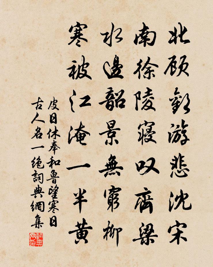 詩詞名句歷史字典書法欣賞書法字典國語詞典說文解字康熙字典古漢語字典標 題 作 者 詩 句 奉和魯望寒日古人名一絕作者:皮日休 朝代:唐代奉和魯望寒日古人名一絕原文北顧歡游悲沈宋,南徐陵寢嘆齊梁。水邊韶景無窮柳,寒被江淹一半黃。詩詞問答問:奉和魯望寒日古人名一絕的作者是誰?答:皮日休問:奉和魯望寒日古人名一絕寫於哪個朝代?答:唐代皮日休奉和魯望寒日古人名一絕書法欣賞奉和魯望寒日古人名一絕書法作品注釋全唐詩:卷616-23詩詞推薦水龍吟(寄竹西)呂渭老〔宋代〕五湖春水茫茫,夢魂夜逐楊花去。汀花岸草,佳人微笑,眼波橫注。借問劉郎,心期則甚,一成無據。自春來淚滿即事二首王安石〔宋代〕雲從無心來,還向無心去。無心無處尋,莫覓無心處。蝶二首楊公遠〔宋代〕磔索銀須細,翩翩粉翅柔。百花巡已遍,入夢戲莊周。訪韓司空不遇李嘉祐〔唐代〕圖畫風流似長康,文詞體格效陳王。蓬萊對去歸常晚,叢竹閒飛滿夕陽。自合浦還清湘寄虛中弟陳瓘〔宋代〕行徹天涯萬里山,月明方照海珠還。瘴鄉來往渾閒事,聊為清湘一破顏。游西山趙善漮〔宋代〕古廟嵯峨占地靈,四山環抱聳螺青。松壇鶴去雲無伴,石洞龍歸雨亦腥。弛擔樵歌屯別徑,倚蓬漁笛起前汀。箇中皇太后合春帖子六首蘇頌〔宋代〕蓬萊殿里春開宴,長樂宮中帝奉親。婦順母慈流美化,萬方歌頌讚娥莘。雲門寺訪靈一上人劉長卿〔唐代〕所思勞日夕,惆悵去西東。禪客知何在,春山到處同。獨行殘雪裡,相見白雲中。請近東林寺,窮年事遠公。長亭怨慢·雁朱彝尊〔清代〕結多少悲秋儔侶,特地年年,北風吹度。紫塞門孤,金河月冷,恨誰訴?回汀枉渚,也只戀江南住。隨意落平沙,憶匡一師李商隱〔唐代〕無事經年別遠公,帝城鍾曉憶西峰。爐煙消盡寒燈晦,童子開門雪滿松。贈徐希仁石硯別盧仝〔唐代〕靈山一片不靈石,手斫成器心所惜。鳳鳥不至池不成,蛟龍乾蟠水空滴。青松火煉翠煙凝,寒竹風搖遠天碧。今日讀道書潘牥〔宋代〕道人清曉炷爐薰,嵐重衣巾濕露痕。課罷楞嚴經一卷,小窗徙倚候啼猿。旅泊新津卻寄一二知己溫庭筠〔唐代〕維舟息行役,霽景近江村。並起別離恨,似聞歌吹喧。高林月初上,遠水霧猶昏。王粲平生感,登臨幾斷魂。苦雨施樞〔宋代〕何期一雨成三日,約客行山竟未能。春到分時陰不解,夜當深處氣猶凝。檐低卷箔看飄灑,礎潤添香散鬱蒸。想見句釋曉瑩〔宋代〕發興真成繼庾公。題海昌安國寺蘇舜元〔宋代〕書堂三月初三日,絮撲紗窗燕拂檐。蓮子數杯賞泠酒,柘枝一曲試新衫。階臨池面勝看鏡。屋映花叢當下簾。誰倚送陸三出尉錢起〔唐代〕春草晚來色,東門愁送君。盛才仍下位,明代負奇文。且樂神仙道,終隨鴛鷺群。梅生寄黃綬,不日在青雲。句錢世雄〔宋代〕黃泥坂西春欲回,雪堂萬木連雲栽。桐柏觀趙師秀〔宋代〕山深地忽平,縹緲見殊庭。瀑近春風濕,松多曉日青。石壇遺鸛羽,粉壁剝龍形。道士玉靈寶,輕強滿百齡。和清湘驛頤齋韻李曾伯〔宋代〕天與粵相接,嶺由秦始開。隔林禽散亂,尋壘禽散亂,尋壘燕驚猜。芳草無盡其,長亭人幾來。山川昨時雨,萬里名句推薦素衣莫起風塵嘆,猶及清明可到家。陸游《臨安春雨初霽》 田野荒而倉廩實,百姓虛而府庫滿,夫是之謂國蹶。荀子《荀子·富國》 聞賢而不舉,殆;聞善而不索,殆;見能而不使,殆管仲《管子·法法》 主闇於上,臣詐於下,滅亡無日荀子《荀子·君道》 手攜稚子夜歸院,月冷空房不見人。白居易《為薛台悼亡》 觀書老眼明如鏡,論事驚人膽滿軀辛棄疾《送湖南部曲》 坐愁群芳歇,白露凋華滋。李白《秋思》 一丈夫兮一丈夫,千生氣志是良圖。李泌《長歌行》 錢財如糞土,仁義值千金。馮夢龍《醒世恆言·卷十七》 長恨去年今夜雨,灑離亭。晏幾道《愁倚闌令·花陰月》