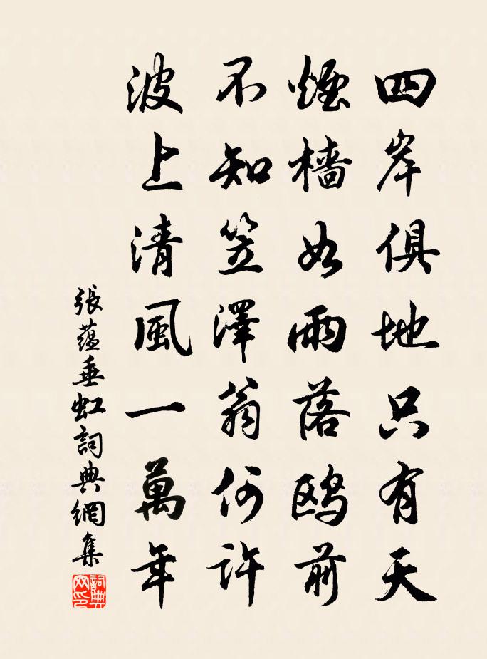 詩詞名句歷史字典書法欣賞書法字典國語詞典說文解字康熙字典古漢語字典標 題 作 者 詩 句 垂虹作者:張蘊 朝代:宋代垂虹原文四岸俱地只有天,煙檣如雨落鷗前。不知笠澤翁何許,波上清風一萬年。詩詞問答問:垂虹的作者是誰?答:張蘊問:垂虹寫於哪個朝代?答:宋代張蘊垂虹書法欣賞垂虹書法作品詩詞推薦曹源和尚贊釋道沖〔宋代〕遭密庵罵,恨入骨髓。此恨難忘,充塞天地。四海五湖無處避,能有幾人著它底。著它底,冤冤相報無窮已。十日徐璣〔宋代〕十日清溪路,新春細雨天。綠波隨棹起,白鳥望舟眠。麥秀初如草,雲濃半是煙。明朝可遵陸,還憶此江邊。龜山寺納涼呈宗衍師孔武仲〔宋代〕寶洞然香罷,山堂問話中。日將秋共淡,心與境渾空。彈指看浮世,披襟納遠風。因知宴坐者,白首樂無窮。清平樂劉因〔元代〕山翁醉也。欲返黃茅舍。醉里忽聞留我者。說道群花未謝。脫巾就掛松龕。覺來酒興方酣。欲借白云為筆,淋漓灑句來鵠〔唐代〕回眸綠水波初起,合掌白蓮花未開。贈靈殿僧道寧一洲上人顧逢〔宋代〕高誼如師果是稀,寺中扶策病翁歸。西風吹我肌生粟,便對西風解一衣。送杜挺之郎中知虔州梅堯臣〔宋代〕大庾嶺邊無臘雪,惟有梅花與明月。月光如水來向人,太守得閒杯耳熱。吹香入酒望梁宋,正是苦寒綿可折。亦當送張敬夫栻以追送不作遠為韻賦詩五章藉手言孫應時〔宋代〕軒冕付儻來,良貴應自有。若人出處間,與世揭山斗。雅宜踐高門,斷國極可不。臨風耿予思,霧雨深稂莠。凜然夜宴安樂公主宅沈佺期〔唐代〕濯龍門外主家親,鳴鳳樓中天上人。自有金杯迎甲夜,還將綺席代陽春。上官昭容書樓歌呂溫〔唐代〕漢家婕妤唐昭容,工詩能賦千載同。自言才藝是天真,不服丈夫勝婦人。歌闌舞罷閒無事,縱恣優遊弄文字。玉樓風中琴盧仝〔唐代〕五音六律十三徽,龍吟鶴響思庖羲。一彈流水一彈月,水月風生松樹枝。酹江月舒頔〔元代〕三槐氏胄,早榮升大府,展施才調。應欲濡須兵革後,幾度愁紆懷抱。翦燭寒更,催科春晚,諸事安排了。簿書叢送寒岩歸士徐凝〔唐代〕不掛絲纊衣,歸向寒岩棲。寒岩風雪夜,又過岩前溪。訴衷情晏幾道〔宋代〕長因蕙草憶羅裙綠腰沉水熏闌乾曲處人靜曾共倚黃昏風有韻,月無痕暗消魂擬將幽恨試寫殘花寄與朝雲內閣孫侍郎生辰紀德宋祁〔宋代〕鳳琯凝姑律,奎鉤誕佐臣。祥標六蓬矢,家盛十朱輪。變道齊成魯,端朝甫及申。禁中朝夕誨,帝右老成人。遍讀頌證道歌證道歌釋印肅〔宋代〕獅子吼,無畏說,直言恰似翻成拙。問渠何處住居家,遙指前坡無處訣。次韻巴陵羅簿送行二首王炎〔宋代〕旌陽峰下水成淵,可約鳧鷗共一川。種秫漸營浮蟻瓮,結茅重理蠹魚編。敢期晤晤方傾蓋,遽有新詩當贈鞭。仰望塞上曲送元美李攀龍〔明代〕白羽如霜出塞寒,胡烽不斷接長安。城頭一片西山月,多少征人馬上看。頌古釋道顏〔宋代〕楊岐老人瑣口訣,萬里長城一條鐵。斫牌禪客如到來,不動金槌腦門裂。治安疏海瑞〔明代〕戶部雲南清吏司主事臣海瑞謹奏;為直言天下第一事,以正君道、明臣職,求萬世治安事: 君者,天下臣民萬名句推薦紅橋路,正一派、畫船蕭鼓中流住。納蘭性德《摸魚兒·午日雨眺》 綠葉紫裹,丹莖白蒂。宋玉《高唐賦》 大江東去,浪淘盡,千古風流人物。蘇軾《念奴嬌·赤壁懷古》 風雨替花愁。風雨罷,花也應休。趙秉文《青杏兒·風雨替花愁》 花開又被風吹落,月皎那堪雲霧遮。施耐庵《水滸傳·第一百一十二回》 三載重陽菊,開時不在家。文森《九日》 喧啾百鳥群,忽見孤鳳凰。韓愈《聽穎師彈琴》 浩氣清英,仙材卓犖,下土難分別丘處機《無俗念·靈虛宮梨花詞》 高節志凌雲,不敢當滕六。環山樵《薛寶釵·雪竹》 至鷺鷥林,則雪深泥滑,不得前矣。辛棄疾《賀新郎·把酒長亭說》