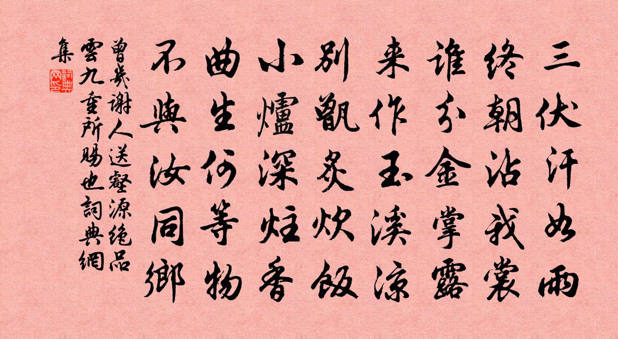 詩詞名句歷史字典書法欣賞書法字典國語詞典說文解字康熙字典古漢語字典標 題 作 者 詩 句 謝人送壑源絕品雲九重所賜也作者:曾幾 朝代:宋代原文三伏汗如雨,終朝沾我裳。誰分金掌露,來作玉溪涼。別甑炙炊飯,小爐深炷香。曲生何等物,不與汝同鄉。詩詞問答問:《謝人送壑源絕品雲九重所賜也》的作者是誰?答:曾幾問:該詩寫於哪個朝代?答:宋代問:曾幾的名句有哪些?答:曾幾名句大全書法欣賞謝人送壑源絕品雲九重所賜也書法作品詩詞推薦奉和張舍人閣中直夜思聞雅琴因書事通簡僚友呂溫〔唐代〕迢遞天上直,寂寞丘中琴。憶爾山水韻,起予仁智心。凝情在正始,超想疏煩襟。涼生子夜後,月照禁垣深。遠風次韻鮮于子駿游九曲池蘇轍〔宋代〕天高山近海,春盡草生池。禾黍多新恨,川原自昔時。花存故苑麗,樵出舊城墮。莫望瓜洲渡,曾經駐佛狸。和兗弟與梁況之學士同作四絕句右呈況之常蘇頌〔宋代〕偶陪嘉約出重闉,自覺超然隔世塵。若欲遍游山下寺,直須經歲駐征輪。秋興王柏〔宋代〕巷底蕭蕭絕市塵,供愁疎雨打黃昏。悠然一曲泉鳴調,燒了夜香深閉門。清平樂石孝友〔宋代〕醉紅宿翠。髻嚲烏雲墜。管是夜來不得睡。那更今朝早起。春風滿搦腰枝。階前小立多時。恰恨一番雨過,想應濕阮郎歸佚名〔宋代〕及妝時結薄衫兒。蒙金艾虎兒。畫羅領抹纈裙兒。盆蓮小景兒。香袋子,搐錢兒。胸前一對兒。繡簾妝罷出來時。九曲櫂歌十首白玉蟾〔宋代〕三十六峰真絕奇,一溪九曲碧漣漪。白雲遮眼不知處,誰道神仙在武夷。牡丹李鹹用〔唐代〕少見南人識,識來嗟復驚。始知春有色,不信爾無情。恐是天地媚,暫隨雲雨生。緣何絕尤物,更可比妍明。玉山枕(仙呂調)柳永〔宋代〕驟雨新霽。盪原野、清如洗。斷霞散彩,殘陽倒影,天外雲峰,數朵相倚。露荷煙芰滿池塘,見次第、幾番紅翠。謁金門徐珌〔宋代〕春欲半。重到寂寥山館。修竹連山青不斷。誰家門可款。紅暈花梢未半。綠蘸柳芽猶短。金縷香消春不管。素蟾光余方悼亡適山圃牡丹芍藥盛開賦長句姜特立〔宋代〕白巾對紅艷,哀樂自不同。緬彼古之人,拔去體法中,親喪至嘔血,悲涕固無從。不哭即飲酒,陶然醉為鄉。吾愛劍歌行次韻王冕〔元代〕先輩匣中三尺水,斬蛟曾入吳潭裡。提歸未肯策奇勳,軒冕泥塗真戲耳。雞林削鐵不足比,昆吾百鍊安可齒?淬花和弟景盧月台詩洪遵〔宋代〕築台結閣兩爭華,便覺流涎過麴車。戶小難禁竹葉酒,睡多須藉菊苗茶。寄呈東甽先生曹侍郎宋伯仁〔宋代〕芝書催覲已多時,底事歸班似懶歸。諸老正緣無定說,先生只得暗知機。柳花樽俎春千點,竹屋雲山綠四圍。東甽雨臥舟中鄧深〔宋代〕不許反頭逢底下,僅容舒膝簟中間。聽風聽雨聽灘浪,才得晴時出看山。送悟侍者參育王偃溪和尚釋紹曇〔宋代〕茂陰深處擊寒冰,洗得娘生兩耳清。塞斷不聽呼小玉,順風來聽偃溪聲。第四回回前詩曹雪芹〔清代〕捐軀報國恩,未報身猶在。眼底物多情,君恩或可待。禪人並化主寫真求贊釋正覺〔宋代〕性了有餘,體含太虛。心空歷歷,道契如如。答響神居谷,隨緣井覷驢。向道塵塵住三昧,何妨觸處卷而舒。奉題胡宗偉推官攬秀堂范成大〔宋代〕城外屏峰雲百疊,城裡看雲笏拄頰。山靈自與人爭秀,明滅煙霏難應接。南鄰范叔骨相寒,不如騎曹知愛山。晨霞梅花絕句陸游〔宋代〕南村花已繁,北塢殊未動。更賒一月期,待我醉春瓮。名句推薦湖闊兼雲霧,樓孤屬晚晴。杜甫《陪裴使君登岳陽樓》 山無陵,江水為竭。佚名《上邪》 夜雨做成秋,恰上心頭。納蘭性德《浪淘沙·夜雨做成秋》 久廢山行疲犖确,尚能村醉舞淋浪。蘇軾《捕蝗至浮雲嶺山行疲苶有懷子由弟二首·其二》 鳥飛反鄉,兔走歸窟,狐死首丘,寒將翔水,各哀其所生。劉安及其門客《淮南子·說林訓》 蘭陵美酒鬱金香,玉碗盛來琥珀光。李白《客中行 / 客中作》 願君多採擷,此物最相思。王維《相思》 長恨此身非我有,何時忘卻營營。蘇軾《臨江仙·夜飲東坡醒復醉》 置酒長安道,同心與我違。王維《送綦毋潛落第還鄉 / 送別》 夢後樓台高鎖,酒醒簾幕低垂。晏幾道《臨江仙·夢後樓台高鎖》