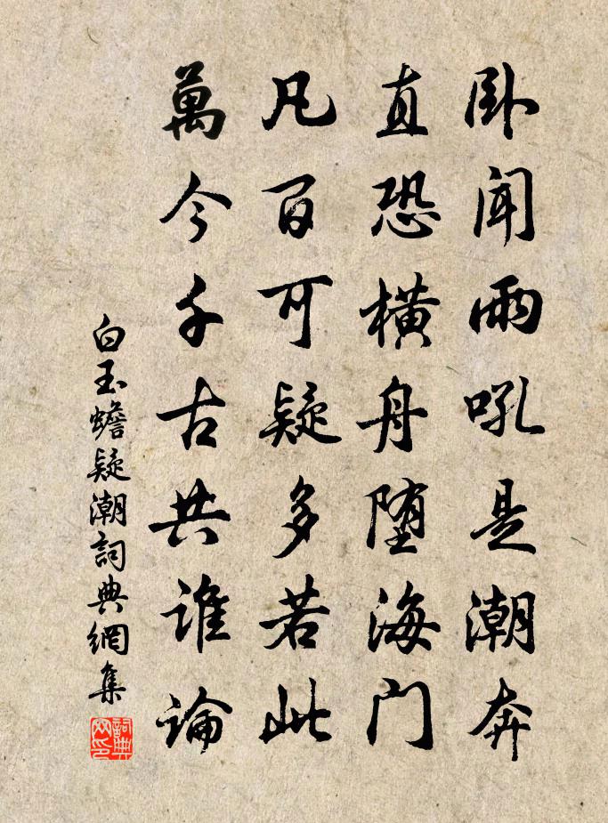 詩詞名句歷史字典書法欣賞書法字典國語詞典說文解字康熙字典古漢語字典標 題 作 者 詩 句 疑潮作者:白玉蟾 朝代:宋代疑潮原文臥聞雨吼是潮奔,直恐橫舟墮海門。凡百可疑多若此,萬今千古共誰論。詩詞問答問:疑潮的作者是誰?答:白玉蟾問:疑潮寫於哪個朝代?答:宋代問:疑潮是什麼體裁?答:七絕白玉蟾疑潮書法欣賞疑潮書法作品詩詞推薦登澤州城北樓宴陳子昂〔唐代〕平生倦遊者,觀化久無窮。復來登此國,臨望與君同。坐見秦兵壘,遙聞趙將雄。武安君何在,長平事已空。且歌春光好·頻葉軟和凝〔五代〕頻葉軟,杏花明,畫船輕。雙浴鴛鴦出綠汀,棹歌聲。春水無風無浪,春天半雨半晴。紅粉相隨南浦晚,幾含情。偈頌四首釋惟一〔宋代〕臘月二十 * ,家家戶戶盡有。不是北禪露地牛,便是清源白家酒。羅旬杯盤,同歡共笑。天津感事二十六首邵雍〔宋代〕三千里外名荒服,一百年來號太平。爭似洛川無事客,佑須列土始為榮。歲晚陸游〔宋代〕扶藤據幾久支離,敢料駸駸迫耄期。面槁自丹天所借,齒搖復住力何施?花前鯨吸猶堪酒,窗底蟬嘶未廢詩。浮世句張唐卿〔宋代〕一舉首登龍虎榜,十年身到鳳凰池。次韻夢得見示之什洪邁〔宋代〕居楚求齊音,美惡不同土。諠豗俗物華,鮮復有佳處。時從玉璧人,商略窮萬古。詩如粟牛戲,誤得摩頂許。望道游龍門詩十二首西溪韓維〔宋代〕我從南嶺來,引轡下雲木。不知溪流處,但見翠滿谷。涼葉覆山泉,脩篁醫茅屋。句林無隱〔唐代〕雪浦二月江湖闊,花發千山道路香。鷓鴣天(癸酉吉陽用山谷韻)胡銓〔宋代〕夢繞松江屬玉飛。秋風蓴美更鱸肥。不因入海求詩句,萬里投荒亦豈宜。青箬笠,綠荷衣。斜風細雨也須歸。崖州重九山陽儀真兩使君送酒陳造〔宋代〕酒會文期興尚濃,佳辰一笑坐天窮。兩州各遣六從事,九日俄成一病翁。詩不受催空急雨,帽無緣落任西風。明朝句黃景說〔宋代〕臨風長作南枝想。送王和甄竇公瑞歸魚洞晁公溯〔宋代〕壁掛凝塵榻,苔生嘯月樓。喜聞佳客至,能為故人留。雨積山川暝,風傳鼓角秋。沙邊晚相別,留眼送歸舟。拾寶岩陳岩〔宋代〕梵王住在光明殿,萬寶真同瓦礫看。玉塊金沙隨地有,好來擷取入中單。冬至日作蘇轍〔宋代〕羲和飛轡留不住,小兒逢節喜欲舞。人言老翁似小兒,烝豚釀酒多為具。潁川本自非吾鄉,鄰里十年成舊故。誰令感秋六首鄭獬〔宋代〕軒軒蒼角鷹,殺氣凌高秋。一息一萬里,獨與長風游。獵騎走霹靂,落臂無虛投。古冢白鼻狐,立死不得留。飛霜扇子詩李石〔宋代〕裊裊腰枝翠拂眉,河東柳家嬌女兒。江南煙雨樓百尺,樓上何人題好詩。別王十後遣京使累路附書杜牧〔唐代〕重關曉度宿雲寒,羸馬緣知步步難。此信的應中路見,亂山何處拆書看?早春遊望司空曙〔唐代〕東風春未足,試望秦城曲。青草狀寒蕪,黃花似秋菊。壯將歡共去,老與悲相逐。獨作游社人,暮過威輦宿。松聲楊萬里〔宋代〕喔詩口角恰微鳴,喚得風從月脅生。端為先生醒醉耳,繞山搜出萬松聲。名句推薦人珍我棄、人棄我取沈復《浮生六記·浪遊記快》 人而無儀,不死何為?佚名《相鼠》 時見歸村人,沙行渡頭歇。孟浩然《秋登蘭山寄張五》 士不以利移、不為患改。劉向《說苑·談叢》 願春暫留,春歸如過翼。周邦彥《六醜·落花》 東武望餘杭,雲海天涯兩渺茫。蘇軾《南鄉子·和楊元素時移守密州》 落日心猶壯,秋風病欲疏。杜甫《江漢》 憑畫檻,雨洗秋濃人淡。厲鶚《謁金門·七月既望湖上雨後作》 窮則變,變則通,通則久。佚名《易傳·繫辭傳下·第二章》 香爐瀑布遙相望,回崖沓嶂凌蒼蒼。李白《廬山謠寄盧侍御虛舟》