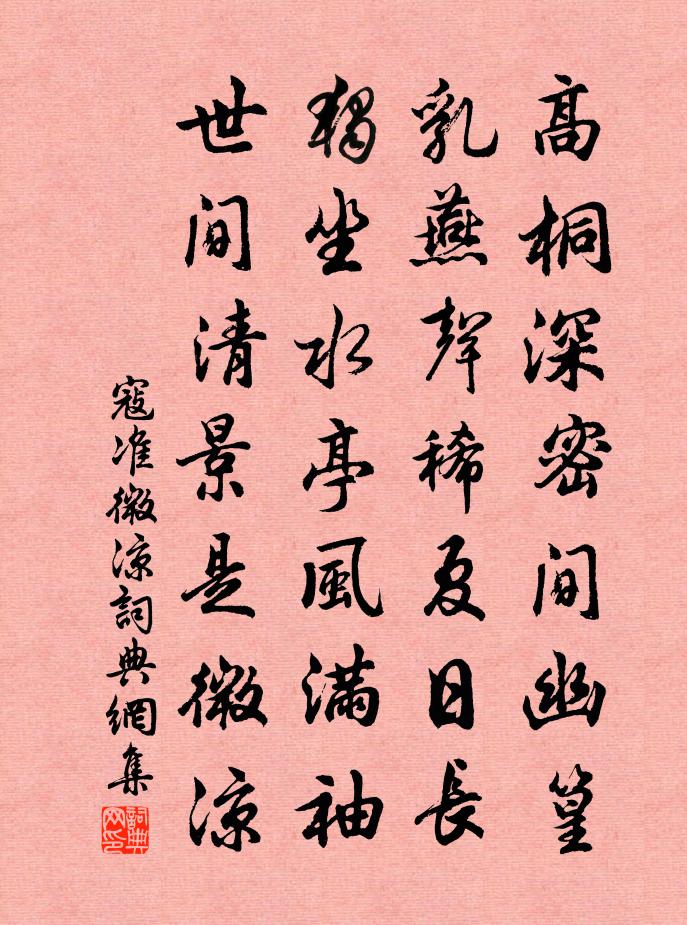 詩詞名句歷史字典書法欣賞書法字典國語詞典說文解字康熙字典古漢語字典標 題 作 者 詩 句 微涼作者:寇準 朝代:宋代微涼原文高桐深密間幽篁,乳燕聲稀夏日長。獨坐水亭風滿袖,世間清景是微涼。詩詞問答問:微涼的作者是誰?答:寇準問:微涼寫於哪個朝代?答:宋代問:寇準的名句有哪些?答:寇準名句大全寇準微涼書法欣賞微涼書法作品詩詞推薦政和元年正月一日作晁說之〔宋代〕元年元日日甲子,從自漢歷來有三。總把皇恩調玉燭,今朝獨更覺春酣。題城侍者峴山圖陸游〔宋代〕漢水沉碑安在哉?千年峴首獨崔嵬。平生不作羊公計,但欲無名死草萊。海棠張煒〔宋代〕楊妃睡未足,西子妝太華。余妖媚東君,化為枝上花。嬌羞沁紅玉,裊娜揉春霞。少陵恐添愁,不欲詩句夸。聞歌竹枝蔣吉〔唐代〕巡堤聽唱竹枝詞,正是月高風靜時。獨向東南人不會,弟兄俱在楚江湄。洛陽道五首獻呂四郎中儲光羲〔唐代〕洛水春冰開,洛城春水綠。朝看大道上,落花亂馬足。劇孟不知名,千金買寶劍。出入平津邸,自言嬌且艷。大道句朱浚〔宋代〕海燕故人意,杜鵑遊子心。次邦憲宣德紅梅詩韻吳頤〔宋代〕年來惱亂探花人,裂盡陶公漉酒巾。傅粉早工欺白雪,施朱更欲媚陽春。衣冠未怪多儕俗,花木無情亦喪真。他日和張原齋見寄丘葵〔宋代〕昔磨鐵硯已成空,今掉孤舟作釣翁。百丈依依牽夜月,一絲裊裊弄秋風。夢回牧笛樵歌裹,身寄鷗沙犢草中。獨把題扇二十四首曹勛〔宋代〕松篁交翠入幽深,道院蕭閒每遣心。一炷清香宜燕坐,數聲鐘磬有餘音。爇心香 寄柳巨濟學錄馬鈺〔元代〕奉勸書生。早悟浮生。舍榮華、物外遊行。無思無慮,無愛無憎。便縱閒心,尋霞友,訪雲朋。常處常真,常淨常上袁文昌知平江五首劉過〔宋代〕欲上姑蘇望虎丘,小邦寧有此風流。山川形勢今三輔,人物英雄古列侯。華屋鱗鱗冠蓋里,畫橋曲曲管弦樓。金陵赤城李丹士王鎡〔宋代〕頻年游岳洞,靈跡記無差。學得長生術,常留鍛死砂。笛吹蒼島月,鞋踏赤城霞。又欲騰空去,尋仙到九華。五羊食荔枝龍眼曾豐〔宋代〕素聞嶺南風,今假嶺南館。窮秋余夏蒸,初臘借春暖。披衣汗流衣,握簡汗流簡。似登頭痛山,而坐身熱坂。誰其贈程巽山人毛滂〔宋代〕十年貧賤欲如餳,愧客殷勤話此生。試與宋君尋卜肆,長安東市雨新晴。西湖舊夢汪元量〔宋代〕芙蓉照水桂香飄,車馬紛紛度六橋。錦幔籠船人似玉,隔花相對學 * 。沉醉東風盧摯〔元代〕掛絕壁松枯倒倚,落殘霞孤鶩齊飛。四周不盡山,一望無窮水,散西風滿天秋意。夜靜雲帆月影低,載我在瀟湘畫頌古五十七首釋道昌〔宋代〕法身說法,肉眼看物。大智如愚,大辯如訥。拈起簸箕別處舂,推出枕子露眼床,劍忍上事放毫光。詩一首黃端〔宋代〕虎脊初終梟獍飛,龍髯半落鬼神疑。行人二月登廬嶺,點點驪珠欲灑碑。寄題王亞夫檢正不啻足齋楊萬里〔宋代〕既得宮隴,復望宮蜀,未求宮寶劍先求玉。秦相後車一千谷,唐相宮八百斛。黃金肘邛駕黃鵠,身前佞佛身後福。春暮佚名〔宋代〕三月名園草色青,夢回猶聽賣花聲。春光不管人慌悴,飛絮紛紛弄晚晴。名句推薦一番荷芰生池沼,檻前風送馨香。尹鶚《臨江仙·一番荷芰生池沼》 北方有佳人,絕世而獨立。李延年《李延年歌》 黃河之水天上來,奔流到海不復回。李白《將進酒》 出南門即大海,一日兩潮,如萬丈銀堤破海而過。沈復《浮生六記·浪遊記快》 墜粉飄香,日日喚愁生。盧祖皋《江城子·畫樓簾暮卷新晴》 採得百花成蜜後,為誰辛苦為誰甜。羅隱《蜂》 害人之心不可有,防人之心不可無,此戒疏於慮者。洪應明《菜根譚·概論》 楚王好細腰,宮中多餓死。佚名《無題》 後庭花一曲,幽怨不堪聽。劉禹錫《金陵懷古》 人無禮則不生,事無禮則不成,國家無禮則不寧。荀子《荀子·修身》
