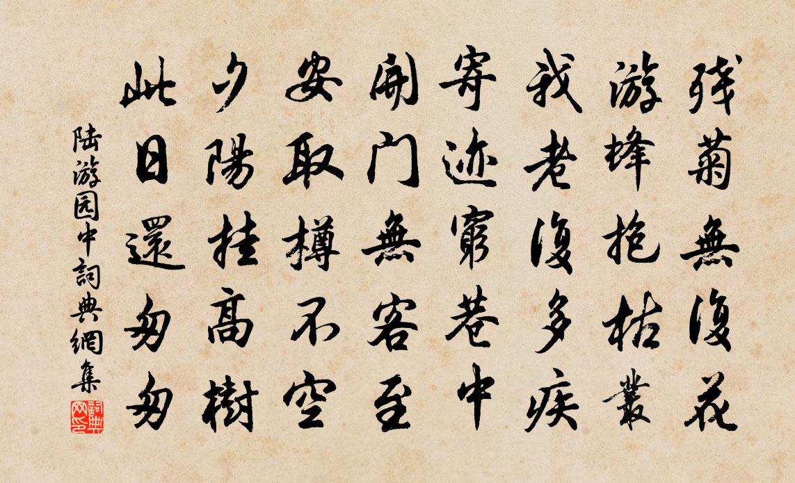 詩詞名句歷史字典書法欣賞書法字典國語詞典說文解字康熙字典古漢語字典標 題 作 者 詩 句 園中作者:陸游 朝代:宋代園中原文殘菊無復花,游蜂抱枯叢。我老復多疾,寄跡窮巷中。開門無客至,安取樽不空。夕陽掛高樹,此日還匆匆。詩詞問答問:園中的作者是誰?答:陸游問:園中寫於哪個朝代?答:宋代問:陸游的名句有哪些?答:陸游名句大全陸遊園中書法欣賞園中書法作品詩詞推薦山居雜詩九十首曹勛〔宋代〕海棠盛西蜀,豪壓春風塗。三月浣花溪,遊人鄙金珠。少陵時居瀼,詩史切太虛。獨不被品藻,此理端何如。湖上眾禽盡以俗呼為題提葫蘆文同〔宋代〕花開已堪鏡,半綠卷如杯。誰為迴風力,清香滿面來。與韓撫乾大倫八首袁燮〔宋代〕年幾五十無知已,乘興將為劍閣行。從此與君尤隔絕,興懷疇昔若為情。壽丞相王邁〔宋代〕翼戴三朝冕有蟬,歸來今作地行仙。且看宮闕蕭何第,未泛江湖范蠡船。老境已憐周尚父,慶門方似漢韋賢。一杯解剡回家過陳公嶺陳著〔宋代〕漫仕當閒游,歸程更自留。嶺高雲送腳,路險石垂頭。家近聽鄉語,山分認水流。溪橋聊小憩,雙鷺去悠悠。同尹子漸王幾道訪郭生別墅不遇梅堯臣〔宋代〕秋野已澄曠,偶來幽興多。茨居隔寒水,柴戶蔭喬柯。看竹曾留鳳,攜朋不為鵝。人歸碧苔徑,應識履痕過。與太常丞丁晦甫敖陶孫〔宋代〕負昔嘗為李公客,坐覺金氣肅東南。鉤間棘句護帖妥,獨立卻視何巘巘。此公行世有步里,十不五試驚愚凡。尺書歲庚午予過來鳳驛觀壁間碑刻火池事嘗賦詩今李流謙〔宋代〕東西燕鴻長差池,二十五年車載脂。觀河性在故應爾,化鶴人歸空自疑。年來於道覺差近,此心頗已忘欣慍。吾兒十一月九日新灘李□示余開禧三年四月九日所魏了翁〔宋代〕憶從筮仕歲涒灘,三十餘年閱暑寒。撫事無成人潦倒,懷人有夢涕汍瀾。家山擾擾膠膠里,廟社禧禧出出間。欲上贛上食蓮有感黃庭堅〔宋代〕蓮實大如指,分甘念母慈。共房頭(左角右咠)(左角右咠),更深兄弟思。實中有麼荷,拳如小兒手。令我憶眾送王以通之官金陵釋永頤〔宋代〕芳辰早失意兼衰,不擬君來重舉杯。雲暗月牆花氣重,蠟殘風幕鳥聲催。醉鄉人有江東役,乘船從闕下回。明日沙秋風嘆四首吳潛〔宋代〕長鯨海上來,壯士田間起。登城復何悲,禾稼秋風裡。挽蔡祭酒詩二首曹彥約〔宋代〕昔締金昆好,慈恩有舊題。及今如社燕,與子共朝雞。未見星常北,相逢日易西。定應湖上路,塞色黯招提。奉和幸長安故城未央宮應制趙彥昭〔唐代〕夙駕移天蹕,憑軒覽漢都。寒煙收紫禁,春色繞黃圖。舊史遺陳跡,前王失霸符。山河寸土盡,宮觀尺椽無。崇高馬都官行之惠黃柑荔枝醋壺梅堯臣〔宋代〕染霜胡甘熟,烘日荔枝美。橘柚未為精,葡萄安可擬。郭生始能贊,魏文何謬比。二果皆世珍,乃遺及賤士。而復依綠亭黃庚〔宋代〕數椽瀟灑瞰清漪,蕩漾煙霏欲濕衣。闌角寒光搖翡翠,檐牙倒影浸琉璃。荷邊鼓瑟游魚聽,柳外敲棋睡鷺飛。洗尺題妙庭觀陸楠〔宋代〕聞說瑤池事渺然,那知此地有飛仙。玉皇妙曲人何在,金鼎靈丹世莫傳。漫寫風姿□俗眼,空餘窟室奉爐煙。何時正月二日大雪虞儔〔宋代〕東風欲動管灰飛,剪彩工夫莫恨遲。殘臘竟呈三白瑞,新春元與六花期。羊羔酒好浮瓊液,牛尾狸堪削玉肌。欲就紹興以後蜡祭四十二首佚名〔宋代〕筆社備祀,教民美報。時和峁豈,奉本以告。惟照臨功,等於載燾。酌獻雲初,明神所勞。題黃嗣深家所蓄惠崇秋晚畫曾幾〔宋代〕叢蘆受風低,積潦得霜淺。沙勻洲渚淨,水澹鳧鴨遠。禪扉掩晝夜,短紙開秋晚。欲問此間詩,半山呼不返。名句推薦夜深知雪重,時聞折竹聲。白居易《夜雪》 願妾身為紅菡萏。年年生在秋江上。歐陽修《漁家傲·近日門前溪水漲》 寒雨連江夜入吳,平明送客楚山孤。王昌齡《芙蓉樓送辛漸》 洞庭青草,近中秋,更無一點風色。張孝祥《念奴嬌·過洞庭》 密雲雙鳳,初破縷金團。米芾《滿庭芳·詠茶》 仁義禮善之於人也,辟之若貨財粟米之於家也。荀子《荀子·大略》 三年遇寒食,盡在洛陽城。白居易《洛橋寒食日作十韻》 思歸未可得,書此謝情人。李白《送郄昂謫巴中》 稻根科斗行如塊,田水今年一尺寬。范成大《夏日田園雜興》 知者不惑,仁者不憂,勇者不懼。孔子弟子《論語·子罕篇》