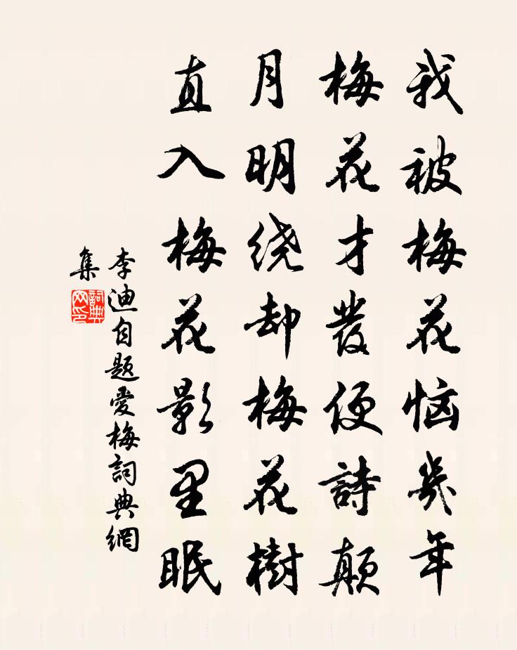 詩詞名句歷史字典書法欣賞書法字典國語詞典說文解字康熙字典古漢語字典標 題 作 者 詩 句 自題愛梅作者:李迪 朝代:宋代自題愛梅原文我被梅花惱幾年,梅花才發便詩顛。月明繞卻梅花樹,直入梅花影里眠。詩詞問答問:自題愛梅的作者是誰?答:李迪問:自題愛梅寫於哪個朝代?答:宋代李迪自題愛梅書法欣賞自題愛梅書法作品詩詞推薦寄萬先輩釋清壹〔宋代〕歸從衡岳此身清,老校群書眼倍明。白屋有田供伏臘,青雲無夢到公卿。頻挑野菜招僧至,少著深衣入郭行。早歲同羅季能章成父張子直登樊城制勝樓李曾伯〔宋代〕避愁聊復上層樓,上到層樓轉更愁。杳杳青煙榆夾塞,鱗鱗翠浪麥平疇。山連楚甸三千里,地隔中原四百州。立盡送龐婆釋子淳〔宋代〕剎剎西來意,塵塵古佛心。眉毛為道侶,鼻孔作知音。借問牛頭何處去,銜花幽鳥杳難尋。郊廟歌辭。漢宗廟樂舞辭。顯仁舞佚名〔唐代〕運極金行謝,天資水德隆。禮神鄜畤館,布政未央宮。詰旦備明祀,登歌答茂功。雲軒臨降久,星俎薦陳豐。靄靄句杜圭〔宋代〕鹿頭幾立青疑染,龍渡橫飛勢欲來。秋山顧炎武〔清代〕秋山復秋山,秋雨連山殷。昨日戰江口,今日戰山邊。已聞右甄潰,復見左拒殘。旌旗埋地中,梯衝舞城端。一朝九誦河伯鮮于侁〔宋代〕清秋方初兮淫雨降無時,舊坊弗治兮河水泛濫而為災。潏汩沸渭兮澎湃奔波而沛來,崩騰覆溺兮夫豈河伯不仁。汗法會堂前蒲萄一架每時日至其上廚人輒報飯具鄭剛中〔宋代〕灶下斧聲成菜糝,階前日影上蒲萄。頑僮不用催人飯,每食焉知愧爾曹。和晚醉金樓趙希逢〔宋代〕少年曾客帝王州,醉倒不知何處樓。厭飲清嘆成逐夜,時邀明月入簾鉤。己亥雜詩龔自珍〔清代〕瓊林何不積緡泉?物自低昂人自便。我與徐公籌到此,朱提山竭亦無權!望江南/憶江南陳朴〔宋代〕日精滿,陰魄化無形。每遇月圓開北戶,神龜時飲碧瑤玲。形魄豈能停。陽砂赤,陰粉色微青。粉換肉肌砂換骨,和魏僕射還鄉張說〔唐代〕富貴還鄉國,光華滿舊林。秋風樹不靜,君子嘆何深。故老空懸劍,鄰交日散金。眾芳搖落盡,獨有歲寒心。壽馬裕齋觀文右東山,二章,章四句陳著〔宋代〕我徂東山,以敖以游。彼采葛兮,謂我何求。送楊瑗尉南海岑參〔唐代〕不擇南州尉,高堂有老親。樓台重蜃氣,邑里雜鮫人。海暗三山雨,花明五嶺春。此鄉多寶玉,慎莫厭清貧。木樨吟金朋說〔宋代〕月窟移來種異常,金英玉糝散天香。年年八月中秋節,賞盡詩翁酒幾缸。支提禪寺徐夢發〔宋代〕來謁支提古道場,幾年袍錦韻猶香。芙蓉夢裡僧趺坐,檐蔔林中佛放光。禪語了參一宿覺,塵緣頓悟半生忙。若分曉入南山孟浩然〔唐代〕瘴氣曉氛氳,南山復水雲。鯤飛今始見,鳥墜舊來聞。地接長沙近,江從汨渚分。賈生曾吊屈,余亦痛斯文。乙未春初解漕幕兼職訪秋壑西湖探韻得柳字趙孟堅〔宋代〕浮生恍流萍,聚難別易久。經年稀會面,感嘆兩執手。競夸摛錦文,雄騁翻河口。主人金叵羅,頗費黃封酒。環坐別持上人張良臣〔宋代〕藏竹永和字,浣花天寶詩。清江入舟楫,忍淚別僧持。憶第蔡襄〔宋代〕清溪曲曲抱山斜,繞溪十里薔薇花。春風吹香襲人骨,乾紅淡白相交加。眼睛眩晃不能視,爛如赤日凌朝霞。時有名句推薦人間有味是清歡。蘇軾《浣溪沙·細雨斜風作曉寒》 用舍由時,行藏在我,袖手何妨閒處看。蘇軾《沁園春·孤館燈青》 便覺眼前生意滿,東風吹水綠參差。張栻《立春偶成》 掛席幾千里,名山都未逢。孟浩然《晚泊潯陽望廬山》 燕雁無心,太湖西畔隨雲去。姜夔《點絳唇·丁未冬過吳松作》 但夢想、一枝瀟灑,黃昏斜照水周邦彥《花犯·小石梅花》 江南自是離愁苦,況游驄古道,歸雁平沙。王沂孫《高陽台·和周草窗寄越中諸友韻》 吾言甚易知,甚易行。天下莫能知,莫能行。老子《老子·德經·第七十章》 禁里疏鍾官舍晚,省中啼鳥吏人稀。王維《酬郭給事 / 贈郭給事》 五更櫪馬靜無聲。鄰雞猶怕驚。吳文英《醉桃源·元日》