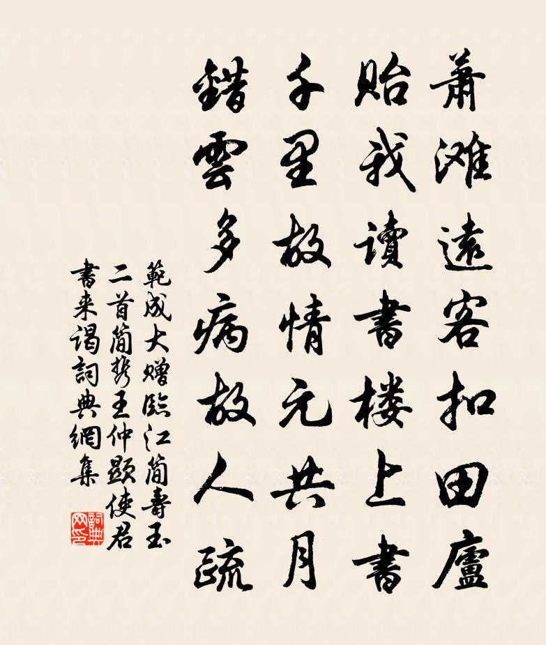詩詞名句歷史字典書法欣賞書法字典國語詞典說文解字康熙字典古漢語字典標 題 作 者 詩 句 贈臨江簡壽玉二首。簡攜王仲顯使君書來謁,作者:范成大 朝代:宋代原文蕭灘遠客扣田廬,貽我讀書樓上書。千里故情元共月,錯雲多病故人疏。詩詞問答問:《贈臨江簡壽玉二首。簡攜王仲顯使君書來謁,》的作者是誰?答:范成大問:該詩寫於哪個朝代?答:宋代問:范成大的名句有哪些?答:范成大名句大全書法欣賞贈臨江簡壽玉二首。簡攜王仲顯使君書來謁,書法作品詩文賞析【原題】:贈臨江簡壽玉二首。簡攜王仲顯使君書來謁,並示孔毅甫夢蟾圖,今廟堂五府皆有題字詩詞推薦堤上柳戴叔倫〔唐代〕垂柳萬條絲,春來織別離。行人攀折處,閨妾斷腸時。雜興四首林逋〔宋代〕湖上山林畫不如,霜天時候屬園廬。梯斜晚樹收紅柿,筒直寒流得白魚。石上琴尊苔野淨,籬陰雞犬竹叢疏。一關送靈岩道光大師蔡冠卿〔宋代〕僧讀儒書舉世稀,惟師精學出塵機。上都香火安禪久,東國林泉徇眾歸。道在莫從形相索,身間都覺利名非。靈岩十日發祁陽項安世〔宋代〕自矜重九苦吟處,寫出浯溪真畫圖。安排秀句待石鼓,指點江神迎彩櫓。小雨已休朝復作,寒流忽漲夜仍枯。篷聲幽居即事陸游〔宋代〕古人在山林,躬自事樵汲。我雖迫耄期,勤慎亦在習。掃地拂幾硯,何遽力弗給。卻笑杜陵翁,多臥少行立。贈一壺天李日者文天祥〔宋代〕汝南市人眼,壺小天地大。誰知賣藥翁,壺寬天地隘。李君血肉身,大化中一芥。天度三百餘,滿腔粲蓍蔡。仙翁思佳客(春感)陳亮〔宋代〕花拂闌乾柳拂空,花枝綽約柳蓬鬆。蝶翻淡碧低邊影,鶯囀濃香杪處風。深院落,小簾櫳,尋芳猶憶舊相逢。橋邊好事近管鑒〔宋代〕列炬照梅花,仰看滿空春雪。翠幕沈沈天淨,掛一鉤新月。微風不動暖光融,金杯墮瓊屑。仿佛暗香吹夢,醉廣寒題江郎廟六絕陳淳〔宋代〕禮學無人發世蒙,正神流弊與妖同。既非氣類相求者,豈解精誠妙感通。春燕劉兼〔唐代〕多時窗外語呢喃,只要佳人卷繡簾。大廈已成須慶賀,高門頻入莫憎嫌。花間舞蝶和香趁,江畔春泥帶雨銜。棲息八月二十日曉起方回〔宋代〕夜闌不能寐,雞鳴垂欲三。起步秋月影,寒發何毿毿。斗柄落山北,參旗掛庭南。三五忽四五,蛙蚓眾喙緘。獨有餞唐州高使君赴任崔湜〔唐代〕芳春桃李時,京都物華好。為岳豈不貴,所悲涉遠道。遠道不可思,宿昔夢見之。贈君雙佩刀,日夕視來期。年老逢春十三首邵雍〔宋代〕年老逢春雨乍晴,雨晴況復近清明。天低宮殿初長日,風暖園林未囀鶯。花似錦時高閣望,草如茵處小車行。東君雜言寄杜羔趙氏〔唐代〕君從淮海游,再過蘭杜秋。歸來未須臾,又欲向梁州。梁州秦嶺西,棧道與雲齊。羌蠻萬餘落,矛戟自高低。已念初寒無衾買紙被以紓急作四絕趙蕃〔宋代〕平生結得楮生緣,覓句抄書日費捐。只有夜窗宜暫舍,也須包裹伴幽眠。早梅王炎〔宋代〕似無還有暗香來,知是春風到早梅。一歲一番花似玉,老人見得幾番開。梅花喜神譜欲開八枝宋伯仁〔宋代〕燈火迫新涼,志士功名重。十年窗下愁,會見金蓮寵。念奴嬌(壽洪雲岩)佚名〔宋代〕山之天目,蔚岧山堯、第一最佳泉石。見說老龍高臥處,正擁深深寒碧。獨D335雲扉,人思霖雨,未許無心出端午內中帖子詞太上皇后閣王珪〔唐代〕池邊草色迎人綠,庭下榴花照地紅。曉獻瑤觴千萬壽,鳴梢聲入寶慈宮。勉兒子韋莊〔唐代〕養爾逢多難,常憂學已遲。辟疆為上相,何必待從師。名句推薦出政施教,賞善罰暴。墨子《墨子·37章 非命(下)》 願得此身長報國,何鬚生入玉門關。戴叔倫《塞上曲二首·其二》 三春已暮花從風,空留可憐與誰同。蕭衍《東飛伯勞歌》 雪暗凋旗畫,風多雜鼓聲。楊炯《從軍行》 鼎湖流水清且閒,軒轅去時有弓劍,古人傳道留其間李白《飛龍引二首·其二》 新帖繡羅襦,雙雙金鷓鴣。溫庭筠《菩薩蠻·小山重疊金明滅》 去年人在鳳凰池,銀燭夜彈絲薩都剌《小闌乾·去年人在鳳凰池》 宮中彩女顏如花,飄然揮手凌紫霞,從風縱體登鸞車。李白《飛龍引二首·其一》 猶記得、當年深隱,門掩兩三株。張炎《渡江雲·山陰久客一再逢春回憶西杭渺然愁思》 窗含西嶺千秋雪,門泊東吳萬里船。杜甫《絕句》