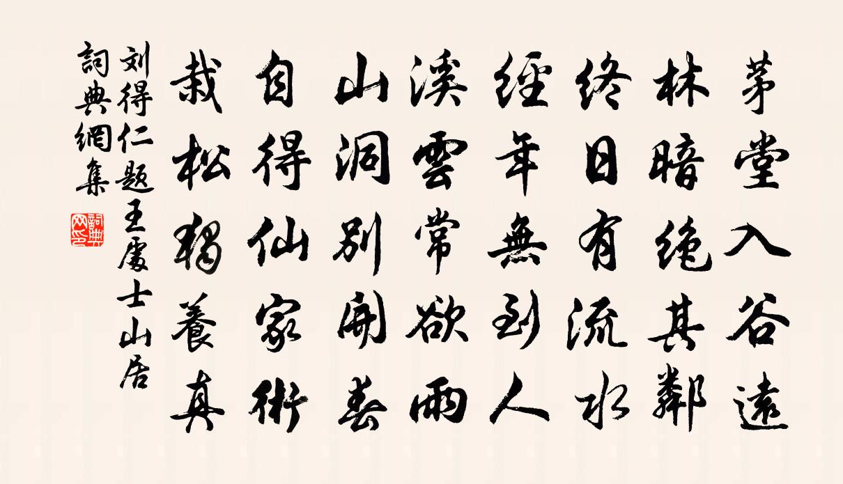 詩詞名句歷史字典書法欣賞書法字典國語詞典說文解字康熙字典古漢語字典標 題 作 者 詩 句 題王處士山居作者:劉得仁 朝代:唐代題王處士山居原文茅堂入谷遠,林暗絕其鄰。終日有流水,經年無到人。溪雲常欲雨,山洞別開春。自得仙家術,栽松獨養真。詩詞問答問:題王處士山居的作者是誰?答:劉得仁問:題王處士山居寫於哪個朝代?答:唐代問:題王處士山居是什麼體裁?答:五律劉得仁題王處士山居書法欣賞題王處士山居書法作品注釋全唐詩:卷544-8詩詞推薦題東山子李適碑陰二首徐彥伯〔唐代〕隴嶂縈紫氣,金光赫氛氳。美人含遙靄,桃李芳自薰。圖高黃鶴羽,寶奪驪龍群。忽驚薤露曲,掩噎東山雲。回也元夕二首項安世〔宋代〕墮劍遺弓未乾,斷蓬漂梗不知寒。月明正在行宮上,猶作瑤墀舊夢看。十二月二十一日迎春楊萬里〔宋代〕星淡孤螢月一梳,迎春早起正愁予。土牛隻解催人老,春氣自來何事渠。官柳野梅殘雪後,金幡玉勝曉光初。卻思高僧石陳岩〔宋代〕柏根翻動一爐香,白足高僧禮梵王。還了十方行腳債,卻來山頂放圓光。春日即事四絕王炎〔宋代〕著人春氣濃於酒,老眼倦看深淺紅。只有睡魔降未得,銅瓶魚眼沸松風。緣識宋太宗〔宋代〕玉殿金扉百道光,迴旋隱密對朝陽。世人不悟幽深理,卻說浮生事久長。答郭仲微以予記注見慶之作宋祁〔宋代〕曉趁霞暾立殿螭,翠凹濡墨慶逢時。褚生徒記為郎事,方朔猶慚待詔飢。目極天關趨窈窱,步依宮柞蔭華滋。故人慶佳節(雙調)張先〔宋代〕莫風流。莫風流。風流後、有閒愁。花滿南園月滿樓。偏使我、憶歡游。我憶歡游無計奈,除卻且醉金甌。醉了醒金山李建勛〔唐代〕不嗟白髮曾游此,不嘆征帆無了期。盡日憑闌誰會我,只悲不見韓垂詩。白紵歌二首王建〔唐代〕天河漫漫北斗璨,宮中烏啼知夜半。新縫白紵舞衣成,來遲邀得吳王迎。低鬟轉面掩雙袖。玉釵浮動秋風生。酒多和黃德欽韻贈公路二孫劉子翬〔宋代〕佩{蝶蟲換角}趨蹌政妙年,階庭蘭玉固天然。人間百世皆由學,惟有讀書如子賢。送張五員外東歸楚州錢起〔唐代〕纓珮不為美,人群寧免辭。杳然黃鵠去,未負白雲期。此別清興盡,高秋臨水時。好山枉帆僻,浪跡到家遲。他日句董傳〔宋代〕古來風義遺才少,近世公卿薦士稀。和蕭太秀中秋月言內事陳杰〔宋代〕每番昏見甲,茲夕兌中天。金水光初滿,山河影正全。娥曾分大藥,兔敢笑華顛。還見乘槎使,重來犯斗年。王伯玉兄弟皆用叔文韻作詩見示答之趙蕃〔宋代〕春芳凋兮瘖杜宇,留得鳴鳩呼渴雨。誰能使我病斯愈,矻矻深思誦詩許。朝來剝啄有扣戶,亟起褰裾犯塵土。三王次韻陳庭藻赴天申燕詩二首王之望〔宋代〕天申上壽開明堂,群公祝聖多新章。不論南山成帶礪,要看東海生禾桑。君恩中台燕百辟,金罍兕觥雕玉觴。飯抄清心鏡 得遇馬鈺〔元代〕遇風仙,論長便。棄掉妻男,不宜再面。向物外、坦蕩逍遙,離眾生識見。大丈夫,志勇猛。肯為酒色,財氣荏苒頌古九十八首釋印肅〔宋代〕帶識髑髏撥死屍,箇中許道實難為。任渠碎我骨消散,終須不賺釋迦兒。春貼子詞皇后閣五首司馬光〔宋代〕樛木猶藏葉,夭桃未作花。六宮歌逮下,四海詠宜家。臨江仙張弘范〔元代〕愛煞林泉風物好,羨他歸去來兮。世緣相挽又還思。功名當壯歲,疏懶記當時。肝膽自知塵輩異,鳳池麟閣須期。名句推薦借問此何時?春風語流鶯。李白《春日醉起言志》 木蘭舟上珠簾卷,歌聲遠,椰子酒傾鸚鵡盞。李珣《南鄉子·山果熟》 雪虐風饕愈凜然,花中氣節最高堅。陸游《落梅》 五馬如飛龍,青絲結金絡。李白《陌上桑》 桃花春水淥,水上鴛鴦浴。韋莊《菩薩蠻》 過雨西風,數葉井梧愁舞。吳文英《荔枝香近·七夕》 金吾不禁夜,玉漏莫相催。蘇味道《正月十五夜》 芳原綠野恣行事,春入遙山碧四圍。程顥《郊行即事》 江漢思歸客,乾坤一腐儒。杜甫《江漢》 過頭飯好吃,過頭話難聽!佚名《增廣賢文·下集》