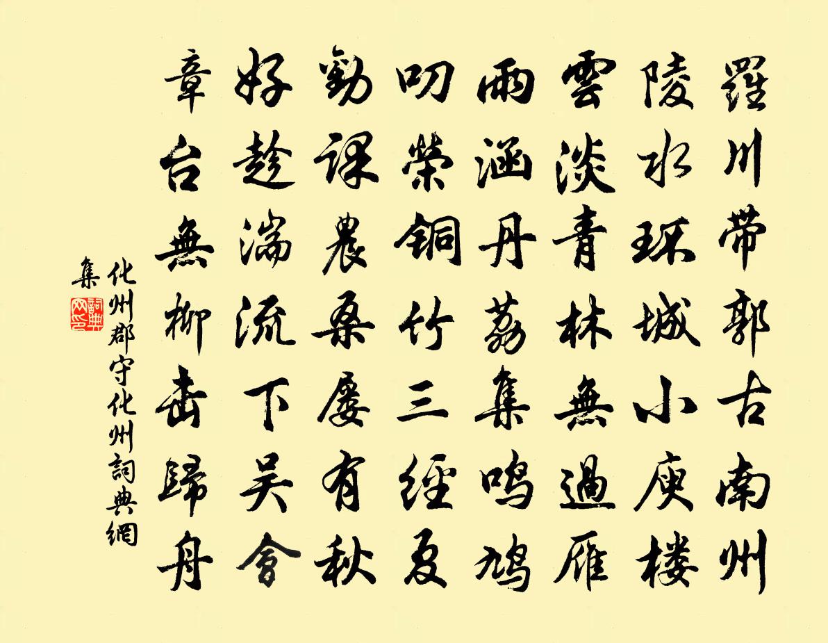詩詞名句歷史字典書法欣賞書法字典國語詞典說文解字康熙字典古漢語字典標 題 作 者 詩 句 化州作者:化州郡守 朝代:宋代化州原文羅川帶郭古南州,陵水環城小庾樓。雲淡青林無過雁,雨涵丹荔集鳴鳩。叨榮銅竹三經夏,勸課農桑屢有秋。好趁湍流下吳會,章台無柳擊歸舟。詩詞問答問:化州的作者是誰?答:化州郡守問:化州寫於哪個朝代?答:宋代化州郡守化州書法欣賞化州書法作品詩詞推薦書向耐軒張煒〔宋代〕薌林一譜傳清白,以耐名軒更出奇。修竹護窗梅夾路,歲寒訊息獨君知。寒峽杜甫〔唐代〕行邁日悄悄,山谷勢多端。雲門轉絕岸,積阻霾天寒。寒硤不可度,我實衣裳單。況當仲冬交,溯沿增波瀾。野人四用韻十首楊公遠〔宋代〕捲起黃紬被,何消道放衙。瓦盆常貯酒,雪水旋煎茶。但得詩聯穩,從教竹屋斜。助儂高興處,索笑共梅花。題會蠡亭王洋〔宋代〕御兒南望越王城,相國勤勞乾國情。料得功成身去後,扁舟猶憶此經行。九日奉呈同僚四絕句陳傅良〔宋代〕小雨廉纖僅滑泥,強隨年少更攀躋。欲憑最上浮圖望,晚稻如今齊未齊。神宗皇帝輓詞三首黃庭堅〔宋代〕文思昭日月,神武用雷霆。製作深垂統,憂勤減夢齡。孫謀開二聖,末命對三靈。今代誰班馬,能書汗簡青。玉山道中時赴掌故之命裘萬頃〔宋代〕麥苗堆綠菜花黃,一簇人家古道傍。酒熟不妨邀里老,年豐贏得事農桑。世情只說宦遊好,客里那知歸興長。我有憶昔陸游〔宋代〕憶昔輕裝萬里行,水郵山驛不論程。屢經漢帝燒余棧,曾宿唐家雪外城。壯志可憐成昨夢,殘年惟有事春耕。西窗洞仙歌呂直夫〔宋代〕征鞍帶月,濃露沾襟袖。馬上輕衫峭寒透。望翠峰深淺,憶著眉兒,腰枝裊,忍看風前細柳。別時頻囑付,早寄書浣溪沙張翥〔元代〕一點芳心兩翠蛾。惱人離緒不勝多。尊前忍聽渭城歌。花落鳥啼春去也,水長天遠客愁何。此情何處托微波。見率齋王簾使劉鑒〔宋代〕漢唐禮樂成三代,南北車書又一家。鳴鹿歌詩將意厚,臣忠端出自賓嘉。寄會稽刁景純學士張伯玉〔宋代〕雨後稽山紫翠毫,使君千騎壓雲鰲。樓台日暖花木麗,河漢夜涼絲竹高。瀛館久淹騏驥足,越人今識鳳凰毛。江南重遊練湖懷舊許渾〔唐代〕西風渺渺月連天,同醉蘭舟未十年。鵩鳥賦成人已沒,嘉魚詩在世空傳。榮枯盡寄浮雲外,哀樂猶驚逝水前。日暮過蠡湖牟融〔唐代〕東湖煙水浩漫漫,湘浦秋聲入夜寒。風外暗香飄落粉,月中清影舞離鸞。多情袁尹頻移席,有道喬仙獨倚闌。幾度詠美人騎馬佚名〔宋代〕駿馬嬌仍穩,春風灞岸晴。促來金鐙短,扶上玉人輕。帽束雲鬟亂,鞭籠翠袖明。不知從此去,何處更傾城。偈頌一百零四首釋紹曇〔宋代〕雲收麥壟,水足秋田。繭繰白雪,鶯弄朱弦。無象太平還有象,蕢桴土鼓樂堯年。誰知聲色里,心印是渠傳。秋日感憤二首王令〔宋代〕擊劍高砍四顧遐,男兒何事系如瓜。蛟龍不是池中物,燕雀烏知隴上嗟。命有儻來猶末耳,天徒生我使窮耶。謝安詠史下苻登陳普〔宋代〕南安怒氣塞長安,羌運如氐淚暗潸。舍卻存亡論理義,江東不似馬毛山。再謝見寄胡寅〔宋代〕非關糧盡不能興,自嘆車中蹭蹬鱗。詩客頗能憐逐客,饔人知復受鮫人。為憐飛箸千條玉,不忘牽潭百尺綸。腹似題翠波亭朱翌〔宋代〕天垂疊巘翠相交,風展文漪碧半篙。勝日難逢宜樂此,好山多買不為饕。了無嘆息同登峴,忽有會心如有濠。更看名句推薦蘇小門前柳萬條,毿毿金線拂平橋。溫庭筠《楊柳八首·其三》 列德而尚賢。雖在農與工肆之人,有能則舉之。墨子《墨子·08章 尚賢(上)》 天涯失鄉路,江外老華發。李白《江南春懷》 明主之道,必明於公私之分韓非及後人《韓非子·飾邪》 江燕話歸成曉別,水花紅減似春休。西風梧井葉先愁。吳文英《浣溪沙·秋情》 立身之道何窮,只得一敬字,便事事皆整。王永彬《圍爐夜話·第一六三則》 明月何皎皎,照我羅床幃。佚名《明月何皎皎》 舉頭望雲林,愧聽慧鳥語。王冕《墨萱圖·其一》 有耳莫洗潁川水,有口莫食首陽蕨李白《行路難三首》 秋娘渡與泰娘橋,風又飄飄,雨又蕭蕭。蔣捷《一剪梅·舟過吳江》