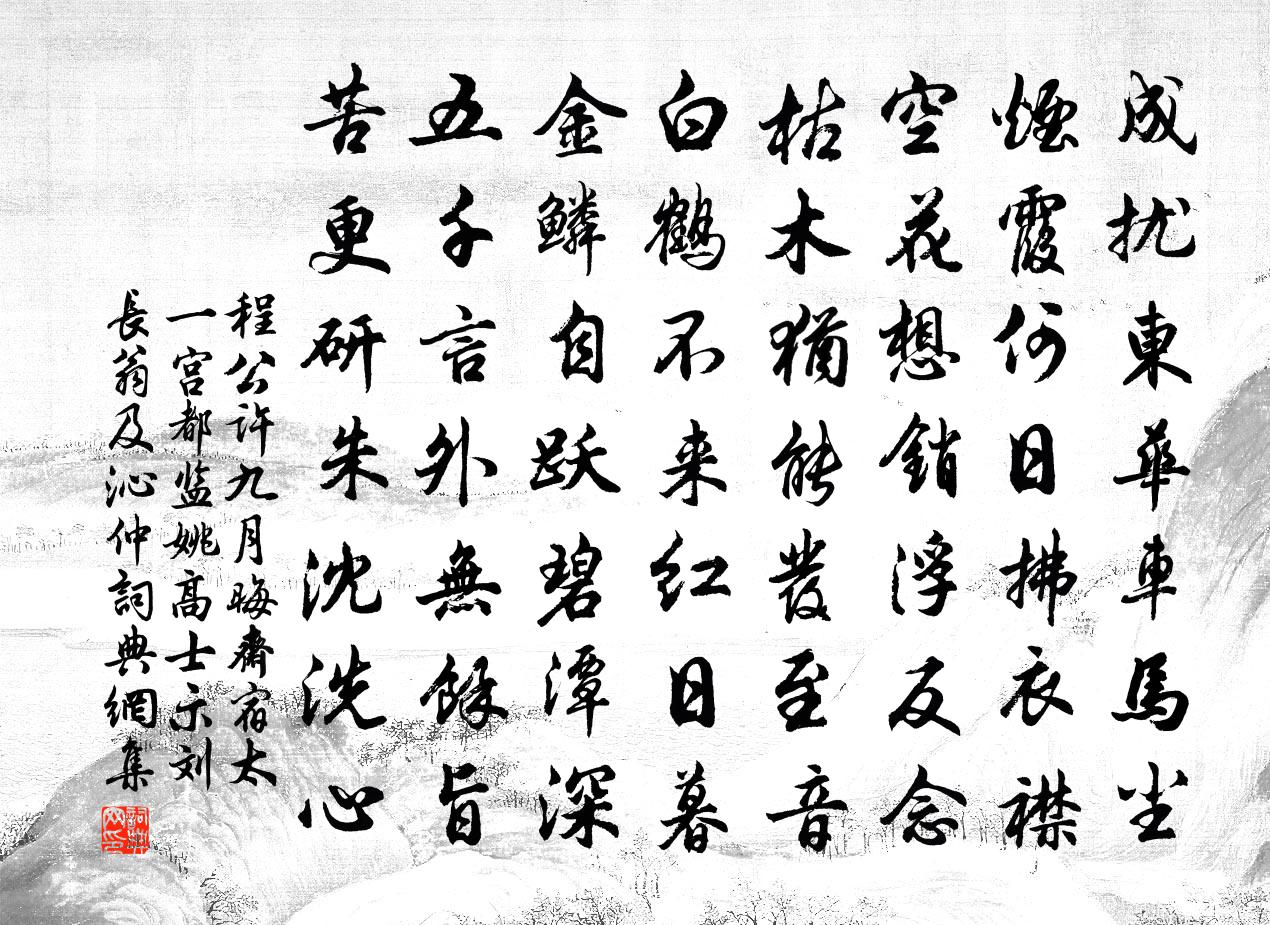 詩詞名句歷史字典書法欣賞書法字典國語詞典說文解字康熙字典古漢語字典標 題 作 者 詩 句 九月晦齋宿太一宮都監姚高士示劉長翁及沁仲作者:程公許 朝代:宋代原文成擾東華車馬塵,煙霞何日拂衣襟。空花想銷浮反念,枯木猶能發至音。白鶴不來紅日暮,金鱗自躍碧潭深。五千言外無餘旨,苦更研朱沈洗心。詩詞問答問:《九月晦齋宿太一宮都監姚高士示劉長翁及沁仲》的作者是誰?答:程公許問:該詩寫於哪個朝代?答:宋代書法欣賞九月晦齋宿太一宮都監姚高士示劉長翁及沁仲書法作品詩文賞析【原題】:九月晦齋宿太一宮都監姚高士示劉長翁及沁仲能諸公唱酬詩軸因和韻二首詩詞推薦步出夏門行 冬十月曹操〔魏晉〕孟冬十月,北風徘徊,天氣肅清,繁霜霏霏。鵾雞晨鳴,鴻雁南飛,鷙鳥潛藏,熊羆窟棲。錢鎛停置,農收積場。蜀道汪元量〔宋代〕蜀道難行高接天,秦關勒馬望西川。峨眉崒嵂知何處,劍閣崔巍若箇邊。題西門亭陳律〔宋代〕吾家四正峰前住,射策君門亦快哉。三島路從天外去,一枝香折月中來。鯉魚晴躍桃花浪,鸚鵡春傾竹葉杯。預宴落葉王令〔宋代〕暮秋木落剝霜紅,俄覺平林一夜空。茂遂本憑枝幹力,卻辭枝幹逐西風。金陵雜興二百首蘇泂〔宋代〕三山摻別是前年,除夜還家翁已仙。少小知憐今老矣,每因得句輒潸然。糟淮鮊梅堯臣〔宋代〕寒潭縮淺瀨,空潭多鮊魚。網登肥且美,糟漬奉庖廚。昔聞漁父賢,嘗勉楚人餔。楚人懷沙死,葬腹千歲余。今茲壁間古畫精絕未聞有賞音者賦此林用中〔宋代〕老樹參橫傍古陰,濃煙淡月試追尋。自來無會丹青意,可惜良工苦片心。題金山宋孝宗〔宋代〕屹然山立枕中流,彈壓東南二百州。狂虜來臨須破膽,何勞平地戰貔貅。十月十五日失舟李流謙〔宋代〕船頭飽鈑看揚舲,忽作翻漿不反瓶。萬死一生真是幸,九江三峽未嘗經。尚收棄物乾坤大,薄恃陰功祖考靈。憂患柳梢青袁去華〔宋代〕草底蟲吟。煙橫水際,月澹松陰。荷近香濃,竹深涼早,銷盡煩襟。發稀渾不勝簪,更客里、吳霜暗侵。富貴功名吳建初寺楊備〔宋代〕僧會西來始布金,常聞鐘磬伴潮間。江南古寺知多少,此寺獨應年最深。留別博州官楊丹張詠〔宋代〕郊亭欲別時,霜葉翻空日。男兒志在乘長風,去便離憂慘顏色。鏌鋣煌煌對尊酒,醉舞不成空握手。恥唱悠悠易水古意釋惠璉〔宋代〕杏花枝頭蛺蝶飛,似郎遊冶忘歸時。杏花落盡蛺蝶去,郎不歸來向底嬉。和故舊招館張明中〔宋代〕牢落詩盟寒欲灰,非君懷抱若為開。未闌樽酒論文意,拂榻應須有待來。題月禪師方丈蔣堂〔宋代〕我到雲房是有緣,坐移蓮刻聽禪詮。江邊異日人應記,吏部曾來見大顛。偈頌一百零二首釋慧遠〔宋代〕如是如是,腦門著地。不是不是,叉手長跪。是與不是,轉無巴鼻。北人運至南方,貨易獲其厚利。錫杖泉張士遜〔宋代〕靈蹤遺幾載,卓錫在高岑。妙法歸何地,清泉流至今。苔花生細細,雲葉映沈沈。桂魄皎清夜,分明六祖心。題元錄事開元所居劉長卿〔唐代〕幽居蘿薜情,高臥紀綱行。鳥散秋鷹下,人閒春草生。冒風歸野寺,收印出山城。今日新安郡,因君水更清。朝陽穿破衲釋師範〔宋代〕橫片豎片胡亂搭,長針短針信意聯。但見日頭東畔出,不知塵世是何年。書陳處士屋壁二首貫休〔唐代〕有叟傲堯日,發白肌膚紅。妻子亦讀書,種蘭清溪東。白雲有奇色,紫桂含天風。即應迎鶴書,肯羨於洞洪。高步名句推薦霖雨泥我塗,流潦浩縱橫。曹植《贈白馬王彪·並序》 王母歡闌瓊宴罷,仙人淚滿金盤側。文天祥《滿江紅·代王夫人作》 鳧脛雖短,續之則憂;鶴脛雖長,斷之則悲。莊子《莊子·外篇·駢拇》 他鄉逢七夕,旅館益羈愁。孟浩然《他鄉七夕》 淚彈不盡臨窗滴。就硯旋研墨。晏幾道《思遠人·紅葉黃花秋意晚》 手種堂前垂柳,別來幾度春風?歐陽修《朝中措·送劉仲原甫出守維揚》 自誠明,謂之性;自明誠,謂之教。子思《中庸·第二十一章》 夜聞歸雁生鄉思,病入新年感物華。歐陽修《戲答元珍》 四面邊聲連角起,千嶂里,長煙落日孤城閉。范仲淹《漁家傲·秋思》 新啼痕壓舊啼痕,斷腸人憶斷腸人。王實甫《十二月過堯民歌·別情》
