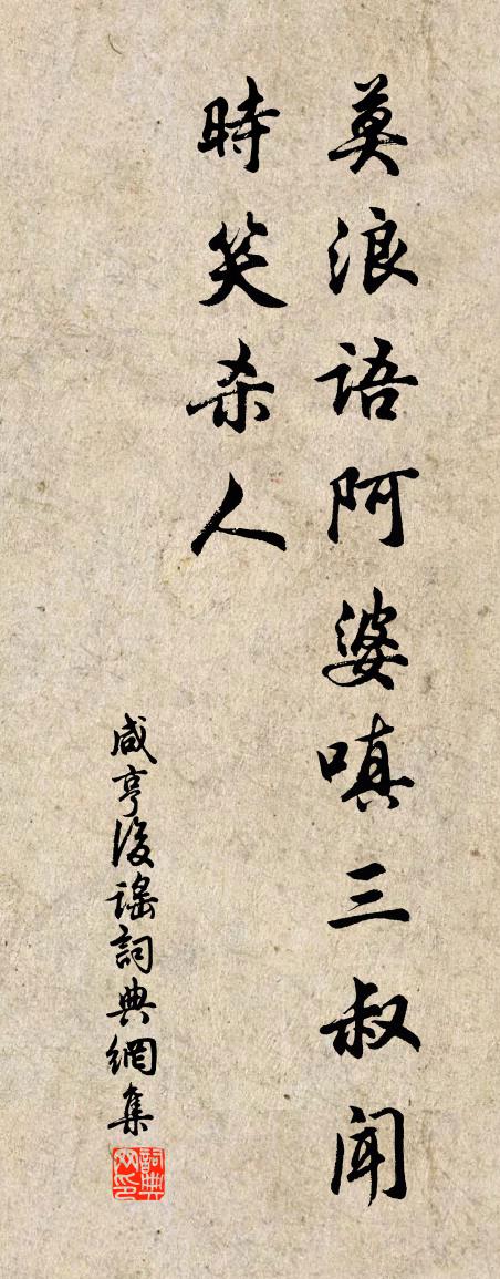 詩詞名句歷史字典書法欣賞書法字典國語詞典說文解字康熙字典古漢語字典標 題 作 者 詩 句 鹹亨後謠作者:佚名 朝代:唐代鹹亨後謠原文莫浪語,阿婆嗔,三叔聞時笑殺1/1人。詩詞問答問:鹹亨後謠的作者是誰?答:佚名問:鹹亨後謠寫於哪個朝代?答:唐代問:佚名的名句有哪些?答:佚名名句大全佚名鹹亨後謠書法欣賞鹹亨後謠書法作品詩詞推薦滿江紅慢姬翼〔元代〕萬論千經,俱涉獵、欲求真覺。驗古今行跡,移在口頭渾錯。不向心中團練就,多生浩劫空牢落。會本真、神口未次高季應韻林季仲〔宋代〕杖屨相從秋水濱,便將公作社中人。酒行苦要深浮白,醉去那知倒著巾。把手共憐江國月,回頭休憶野堂春。太平游惠山蘇軾〔宋代〕薄雲不遮山,疏雨不濕人。蕭蕭松徑滑,策策芒鞋新。嘉我二三子,皎然無淄磷。勝游豈殊昔,清句仍絕塵。弔古廣府胡尚書頻寄詩因答絕句白居易〔唐代〕尚書清白臨南海,雖飲貪泉心不回。唯向詩中得珠玉,時時寄到帝鄉來。再得華侍御書,聞巴中臥病(一作疾)錢起〔唐代〕芳信來相續,同心遠更親。數重雲外樹,不隔眼中人。夢寐花驄色,相思黃鳥春。更聞公幹病,一夜二毛新。減字木蘭花洪皓〔宋代〕蜂房餘液。寫就南枝凌正色。折乾垂芳。點綴如生秘暗香。壽陽妝樣。縴手拈來簪髻上。恍若還家。暫睹真花壓百木瓜花王令〔宋代〕簇簇紅葩間綠荄,陽和閒暇不須催。天教爾艷呈奇絕,不與夭桃次第開。題三昧泉李石〔宋代〕乳崖霜雪根,金地白蓮蕊。泉上碧眼師,秋月照清泚。玉籢開明鏡,肝膽兩冤鬼。若為人面創,如以佛手洗。遂解題沈知丞園壺弢〔宋代〕曲徑芳塘百畝園,更無煩暑礙風煙。留春庭院花如錦,迎月樓台柳舞綿。鄴架插書金屋底,秦箏度曲綠衣前。主人秋日田園雜興范成大〔宋代〕撥雪挑來踏地菘,味如蜜藕更肥醲。朱門肉食無風味,只作尋常菜把供。江南二首陸龜蒙〔唐代〕便風船尾香粳熟,細雨層頭赤鯉跳。待得江餐閒望足,日斜方動木蘭橈。村邊紫豆花垂次,岸上紅梨葉戰初。莫怪富樂山雍有容〔宋代〕當時四海一劉備,至此已堪悲失腳。出語翻為樂國想,是人止可偏方看。外戚世家序司馬遷〔兩漢〕自古受命帝王及繼體守文之君,非獨內德茂也,蓋亦有外戚之助焉。夏之興也以塗山,而桀之放也以末喜。殷之興雜言迎神詞二首迎神皇甫冉〔唐代〕啟庭戶,列芳鮮;目眇眇,心綿綿,因風托雨降瓊筵。紛下拜,屢加籩,人心望歲祈豐年。天開畫樓圖白玉蟾〔宋代〕層檐疊巘入蒼冥,千山萬山相送迎。晴雲一抹收未了,溪尾更濯餘霞明。化工朝暮費點染,丹青變態隨深淺。憑欄九日次韻斯遠去年是日同成父登半山亭見懷之趙蕃〔宋代〕去歲修途度此晨,今年抱疾更漳濱。官壺可醉難多致,城菊未開空屢巡。憶我有詩朝在手,思君何處暮傷神。遙知寄外丘氏〔宋代〕簾裹孤燈覺曉遲,獨眠留得宿妝眉。珊瑚枕上驚殘夢,認得蕭郎馬過時。和聖俞農具詩十五首其一田廬王安石〔宋代〕田父結田廬,聊容一身息。呼兒取茅竹,不借鄉人力。起行廬旁朝,歸臥廬下夕。悠悠各有願,勿笑田廬窄。東湖北崦人家釋文珦〔宋代〕柴門映石柟,茅屋似僧庵。蠶候家人熟,耕時父老諳。設罝當兔徑,添竹護魚潭。賽雨鳴簫鼓,迎神向水南。戊子六月十三日曝書得史院賜筆感懷晁補之〔宋代〕君王孝悌纂修意,丞相忠良典領宜。卻恨身為周柱史,不令人識漢官儀。當年請郡新進笑,今日曝書陳跡迷。猶有名句推薦怒濤卷霜雪,天塹無涯。柳永《望海潮·東南形勝》 淥水淨素月,月明白鷺飛。李白《秋浦歌十七首》 大堤欲上誰相伴,馬踏春泥半是花。竇鞏《襄陽寒食寄宇文籍》 南軒有孤松,柯葉自綿冪。李白《南軒松》 細影將圓質,人間幾處看。薛濤《月》 居高位者易驕,處佚樂者易侈。張廷玉《明史·列傳·卷二十四》 恨舊愁新。有淚無言對晚春。淮上女《減字木蘭花·淮山隱隱》 不知何處火,來就客心然。沈佺期《寒食》 離堂思琴瑟,別路繞山川。陳子昂《春夜別友人二首·其一》 蒂有餘香金淡泊,枝無全葉翠離披。曹雪芹《殘菊》