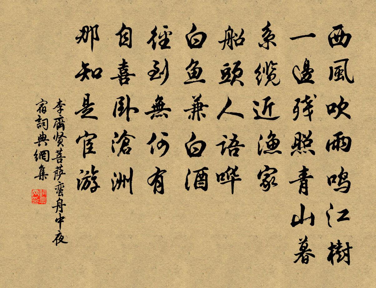 詩詞名句歷史字典書法欣賞書法字典國語詞典說文解字康熙字典古漢語字典標 題 作 者 詩 句 菩薩蠻 舟中夜宿作者:李齊賢 朝代:元代菩薩蠻 舟中夜宿原文西風吹雨鳴江樹。一邊殘照青山暮。系纜近漁家。船頭人語嘩。白魚兼白酒。逕到無何有。自喜臥滄洲。那知是宦遊。詩詞問答問:菩薩蠻 舟中夜宿的作者是誰?答:李齊賢問:菩薩蠻 舟中夜宿寫於哪個朝代?答:元代問:菩薩蠻 舟中夜宿是什麼體裁?答:詞李齊賢菩薩蠻 舟中夜宿書法欣賞菩薩蠻 舟中夜宿書法作品詩詞推薦行香子沈瀛〔宋代〕野叟愚痴。一向昏迷。笑呵呵、前事皆非。從前業債,今盡拼離。也不能文,不能酒,不能詩。屏除人事,閉卻門詠史下劉裕陳普〔宋代〕何事佛貍能度淮,中原千尺髑髏台。無巢燕子寧依樹,不入烏衣巷裹來。宿山家韋莊〔唐代〕山行侵夜到,雲竇一星燈。草動蛇尋穴,枝搖鼠上藤。背風開藥灶,向月展漁罾。明日前溪路,煙蘿更幾層。冬日郡齋書事張先〔宋代〕鈴索聲閒按牒稀,怯寒肌骨望春暉。凝雲垂地雪欲下,高樹無風葉自飛。水落淺沙魚隊聚,草枯幽隴鹿群歸。安人送王中父制乾東歸探韻得限字分韻用離別不堪度正〔宋代〕漢使東南來,幕府皆異產。英英江左家,浩浩富編簡。幾年翔學海,屢薦升士版。大焉合訏謨,小亦堪論譔。橫身頌古釋道顏〔宋代〕風頭稍硬難安立,暖氣才通瞌睡來。卻笑明招閒費力,無端兩處強差排。戊午元日讀書至夜分有感陸游〔宋代〕七十年來又四年,雨聲燈影故依然。未收浮世風漚夢,尚了前生蠹簡緣。老學辛勤那有補,舊聞零落恐無傳。先師訪疊彩岩登越亭朱晞顏〔宋代〕不到越亭久,榴花今幾紅。 江流寒瀉玉,山色翠浮空。 百越薰風裡,三湘夕照中。 行藏忠仗信,六合本同風又七言三首劉克莊〔宋代〕田翁有酒邀村飲,地主存羊餉節儀。不喜人題木居士,何曾鬼怕艾天師。和林丘二君會程坦之家二詩蘇頌〔宋代〕春晚寒不已,節候差季孟。木行怯初陽,水官恣餘橫。滂沱連月雨,愁嘆斯民病。已紊四時和,更傷群物性。園花山庭春日詩江總〔隋代〕洗沐花惟五日花。棲遲花在一丘花。古楂橫近澗。危石聳前洲。岸綠開河柳。池紅照海榴。野花寧待晦。山蟲詎識送張文昌帥豫章二首陳造〔宋代〕談間賓客重宣州,到後兒童敬細侯。薤本擊韁休領攬,棠陰問俗見風流。湖連市屋疑豐樂,江繞城闉似石頭。鷗鷺留別陳藏一釋行海〔宋代〕君住江西我浙東,偶然相識在吳中。知名彼此非今日,愛客情懷有古風。歷數山川游已遍,苦吟風月趣還同。不須寄崔之仁山人姚合〔唐代〕不得之仁訊息久,秋來體色復何如。苦將杯酒判身病,狂作文章信手書。官職卑微從客笑,性靈閒野向錢疏。幾時偈頌十六首釋如淨〔宋代〕金牛弄得爛銀蹄,耕破劫空田地開。不帶泥痕今古路,牧童疎笛入雲來。送師厚歸南陽會天大風遂宿高陽山寺明日同至梅堯臣〔宋代〕往日送子春風前,春風酣酣杏正妍。今來送歸秋風后,秋風搣搣沙滿川。馬鬣斜傾毛瑟縮,馭吏噤唫足後先。弊裘朝天宮成紀懷張德興〔宋代〕崒律千尋玉壘開,龍盤虎踞擁金台。雲中雙闕天顏近,塞山孤臣鐵騎回。砂壁朝疑烽火動,松風夜雜鼓笳哀。願將月夜江行寄崔員外宗之李白〔唐代〕飄飄江風起,蕭颯海樹秋。登艫美清夜,掛席移輕舟。月隨碧山轉,水合青天流。杳如星河上,但覺雲林幽。歸路相見歡李煜〔唐代〕無言獨上西樓,月如鉤,寂寞梧桐深院鎖清秋。[1]剪不斷,理還亂,是離愁,[2]別有一般滋味在心頭。[書懷示子遹陸游〔宋代〕平生山林幾緉屐,何意隨人戴朝幘!口言報國直妄耳,斷簡圍坐晨至夕。道山堂東直廬冷,手種疏篁半窗碧。但虞名句推薦蠶娘洗繭前溪淥,牧童吹笛和衣浴。貫休《春晚書山家屋壁二首》 煙霏雲斂;其容清明,天高日晶;歐陽修《秋聲賦》 淇園春竹美,軍宴日椎牛。司馬光《送龔章判官之衛州·新及第》 何當金絡腦,快走踏清秋。李賀《馬詩二十三首》 去年今日臥燕台,銅鼓中宵隱地雷王守仁《元夕二首》 夜來能有幾多寒,已瘦了、梨花一半。黃升《鵲橋仙·春情》 知人者智,自知者明。勝人者有力,自勝者強。老子《老子·道經·第三十三章》 水際輕煙,沙邊微雨。荷花芳草垂楊渡。劉將孫《踏莎行·閒遊》 脫鞍暫入酒家壚,送君萬里西擊胡岑參《送李副使赴磧西官軍》 綠桑高下映平川,賽罷田神笑語喧。歐陽修《田家》