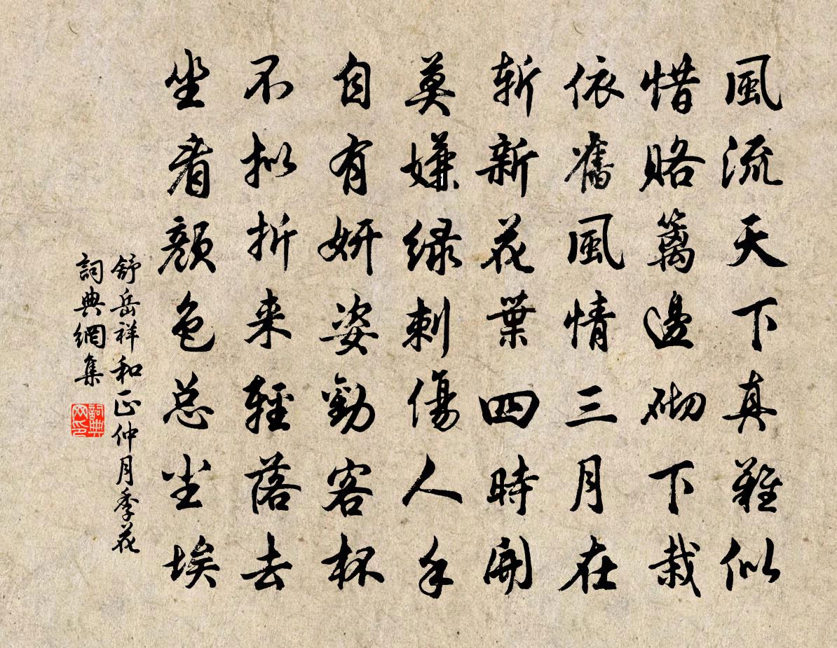 詩詞名句歷史字典書法欣賞書法字典國語詞典說文解字康熙字典古漢語字典標 題 作 者 詩 句 和正仲月季花作者:舒岳祥 朝代:宋代和正仲月季花原文風流天下真難似,惜賂籬邊砌下栽。依舊風情三月在,斬新花葉四時開。莫嫌綠刺傷人手,自有妍姿勸客杯。不擬折來輕落去,坐看顏色總塵埃。詩詞問答問:和正仲月季花的作者是誰?答:舒岳祥問:和正仲月季花寫於哪個朝代?答:宋代舒岳祥和正仲月季花書法欣賞和正仲月季花書法作品詩詞推薦春日雜書八首張耒〔宋代〕年長心益衰,讀書常苦忘。當其欲談說,散墜挽不上。詩書非真學,盡記未足尚。但憎心辜眼,不為謹守藏。書多再和龔帥所寄吳芾〔宋代〕聞道公庭白晝閒,更無夜犬吠江關。一時戾氣俱銷盡,千載淳風頓使還。但恐賜環來北闕,不容拄笏看西山。只今游龍隱岩陳叔信〔宋代〕幾年鱗甲蟄清淵,一旦飛騰石自穿。遺蹟漫存離舊隱,定應銜雨去朝天。洞口岩高著數椽,秋鈴聽法護金仙。騰身白門柳楊維楨〔元代〕步出白門柳,聞歌金縷衣。事生不事死,曩誓今已遺。空負地下心,百年以為期。向來媒佻鳩,寧為今日思?清平樂蔡伸〔宋代〕南窗月滿。繡被堆香暖。苦恨春宵更漏短。應訝郎歸又晚。征帆初落橋邊。迎門一笑嫣然。今夜流霞共酌,何妨金有感王冕〔元代〕三春多是雨,四月不聞雷。盡道龍宮悶,誰掀蟄戶開?郊原豐草木,城郭滿蒿萊。我老為時慮,無言思欲哀。採桑子·明月多情應笑我納蘭性德〔清代〕明月多情應笑我,笑我如今,孤負春心,獨自閒行獨自吟。近來怕說當時事,結編蘭襟。月淺燈深,夢裡雲歸何處明日午睡至暮複次前韻陸游〔宋代〕酒力醺然入四支,華胥稅駕不應遲。殘年已覺衰難強,萬事無如睡不知。幸有琴書供枕藉,安能冠帶更支持。紅爐愛碣山石劉叉〔唐代〕碣石何青青,挽我雙眼睛。愛爾多古峭,不到人間行。驀山溪(元夕詞)毛滂〔宋代〕梅花初謝,雪後寒微峭。誰送一城春,綺羅香、風光窈窕。插花走馬,天近寶鞭寒,金波上,玉輪邊,不是紅塵道沔水佚名〔先秦〕沔彼流水,朝宗于海。鴥彼飛隼,載飛載止。嗟我兄弟,邦人諸友。莫肯念亂,誰無父母?沔彼流水,其流湯湯。寄陸補闕(前年同登科)白居易〔唐代〕忽憶前年科第後,此時雞鶴暫同群。秋風惆悵須吹散,雞在中庭鶴在雲。劉晁之家園六詠梅澗姜特立〔宋代〕勝事人間少,芳堤盡種梅。橫枝出疏影,蠹卉長蒼苔。瀟灑依湍瀨,飄零落酒杯。戲魚時躍去,凍蝶忽飛來。宛似檢校金蓋別業周弼〔宋代〕獨棹一溪雲,山回景自分。露花藏岸勢,風葉亂泉紋。短箭催年急,微陽近草曛。斷猿將落木,清夜不堪聞。韓魏公輓歌詞二首曾鞏〔宋代〕錙銖赤舄無驕志,咳唾黃金有古風。覆冒荒遐知大度,委蛇艱急見孤忠。謀謨邴魏丹青力,擁立昭宣柱石功。御筆天柱峰陳岩〔宋代〕鬼爛神焦不救燃,豈知此柱固依然。九關嘗藉扶持力,肯信人間有杞天。新開望山處王建〔唐代〕新開望山處,今朝減病眠。應移千里道,猶自數峰偏。故欲遮春巷,還來繞暮天。老夫行步弱,免到寺門前。次晚洲杜甫〔唐代〕參錯雲石稠,坡陀風濤壯。晚洲適知名,秀色固異狀。棹經垂猿把,身在度鳥上。擺浪散帙妨,危沙折花當。羈離送劉景元觀察守襄陽韓維〔宋代〕荊州太守駕朱轓,寶筆題詩出御前。應厭笙歌消暇日,欲將才業效當年。千章翠木雲間寺,百丈清江雪後船。看取聽雨軒顧逢〔宋代〕此地偏於靜夜宜,爐香相對一編詩。幾回聞得敲窗響,不是開門落葉時。名句推薦聞道黃龍戍,頻年不解兵。沈佺期《雜詩三首·其三》 美人金梯出,素手自提筐。常建《春詞二首》 留戀海棠顏色、過清明。張輯《南歌子·柳戶朝雲濕》 素衣莫起風塵嘆,猶及清明可到家。陸游《臨安春雨初霽》 人間之水污濁,在野外者清潔,俱為一水,源從天涯,或濁或清,所在之勢使之然也。王充《論衡·卷二·率性篇》 這次第,算人間沒個並刀,剪斷心上愁痕。黃孝邁《湘春夜月·近清明》 驪山四顧,阿房一炬,當時奢侈今何處?張養浩《山坡羊·驪山懷古》 做弄得、酒醒天寒,空對一庭香雪。張炎《疏影·梅影》 繡帳已闌離別夢,玉爐空裊寂寥香。馮延巳《浣溪沙·春到青門柳色黃》 阿香秋夢起嬌啼,玉女傳幽素。吳文英《燭影搖紅·越上霖雨應禱》