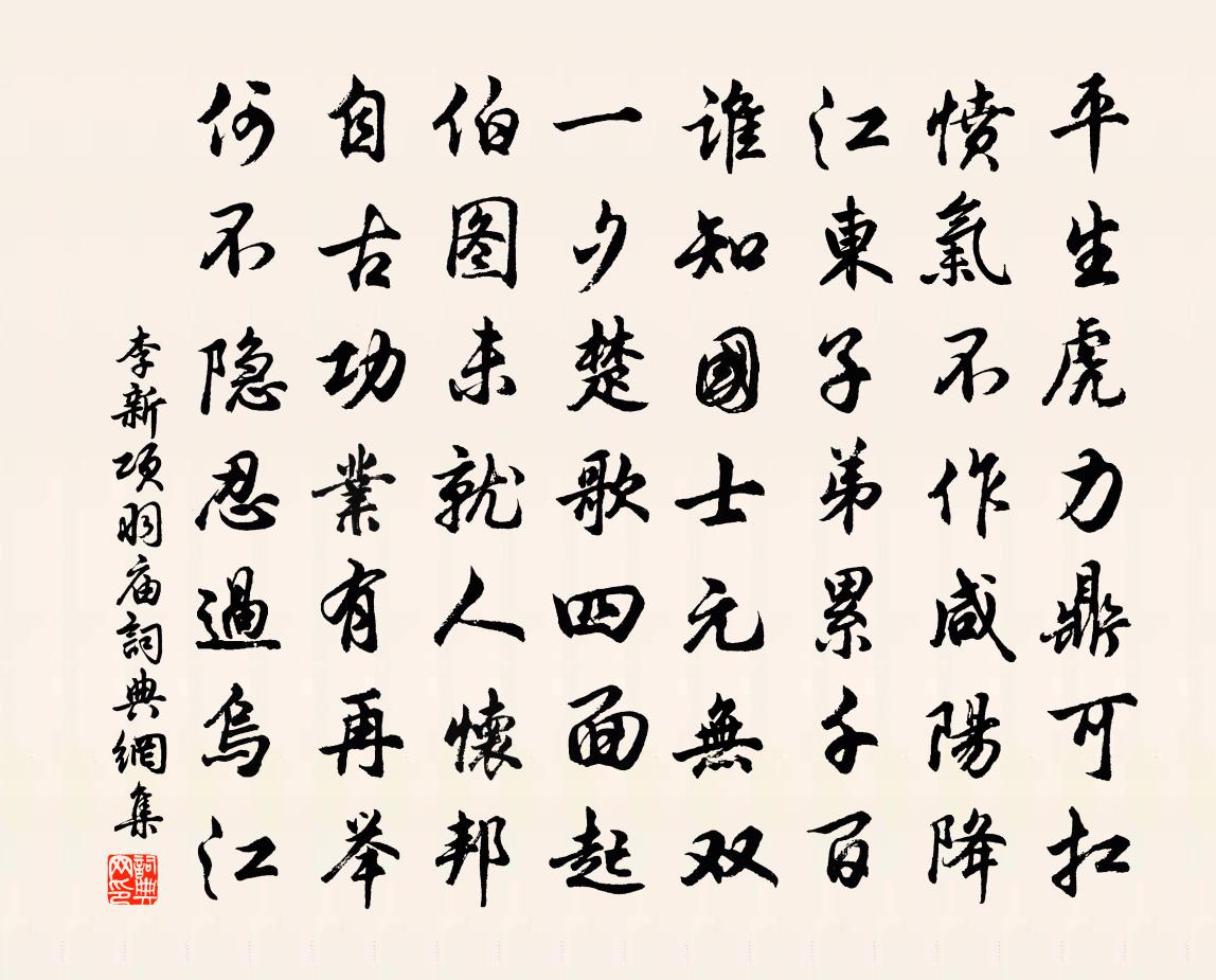 詩詞名句歷史字典書法欣賞書法字典國語詞典說文解字康熙字典古漢語字典標 題 作 者 詩 句 項羽廟作者:李新 朝代:宋代項羽廟原文平生虎力鼎可扛,憤氣不作鹹陽降。江東子弟累千百,誰知國士元無雙。一夕楚歌四面起,伯圖未就人懷邦。自古功業有再舉,何不隱忍過烏江。詩詞問答問:項羽廟的作者是誰?答:李新問:項羽廟寫於哪個朝代?答:宋代李新項羽廟書法欣賞項羽廟書法作品詩詞推薦舟宿南尉岸下夜夕不寐思丁老小山戲成長韻王洋〔宋代〕積少自成多,一元陶萬類。破大可作小,壺中有天地。果謂真無窮,百慮同一致。若曰一毫芒,萬 * 垂翅。變化道室試筆陸游〔宋代〕吾家學道今四世,世佩施真三住銘。一窗蘿月照孤詠,萬壑松風吹半醒。古風·其十九李白〔唐代〕西上蓮花山,迢迢見明星。(西上 一作:西嶽)素手把芙蓉,虛步躡太清。霓裳曳廣帶,飄拂升天行。邀我登雲和孫偉卿雜言十章陳傅良〔宋代〕好酒來誰家,明月得我心。把酒弄明月,醉臥盜不侵。木蘭李石〔宋代〕大渡河邊瘴霧濃,邛崍關下木蘭紅。得州自昔連江雨,此地仍多出竅風,一笑萱花親念遠,三生藜杖子心同,莫緣堂西夜坐李覯〔宋代〕炎蒸得避處,鋪席對西牆。有月樹陰黑,無風山氣涼。聚蚊妨袒裼,飲井當壺觴。妻子詎知我,笑言皆在傍。宿橫金延慶寺呂江〔宋代〕水路通城近,人家與寺連。西風漁市鼓,落日野橋船。塵土非吾事,湖山似去年。今宵禪榻夢,定是到鷗邊。再和項安世〔宋代〕望海亭前句遠,蓬萊閣上詩寒。老子向來椽筆,要題吉日斯乾。金剛隨機無盡頌尊重正教分第十二釋印肅〔宋代〕正教堪尊重,一法共不共。十八不共時,滅卻南柯夢。飲於梅山弟家醉書八首陳著〔宋代〕老我衰顏百念煎,梅山少我十三年。人生不問壽長短,得一日寬皆是仙。和祖擇之學士袁州慶豐堂十詠陳詵〔宋代〕園涉日成趣,窮詩嬾綴裝。梁間冰雪句,屈指幾華長。江山慶雲橋辛棄疾〔宋代〕斷崖老樹互撐拄,白水綠畦相灌輸。焉得溪南一邱壑,放船畫作歸來圖。送襄邑知縣杜君懿太博梅堯臣〔宋代〕霜落水未落,令君將度河。農耕休叱來,女織罷鳴梭。赤幘驅亭長,丹砂挈印窠。無慚浚儀政,才比陵雲多。宿長蘆寺下四絕鄭剛中〔宋代〕建鄴春江水拍天,趁潮先發六宮船。何時彤筆嚴清禁,縹緲金鋪生瑞煙。和主司王起(一作和主司酬周侍郎)戈牢〔唐代〕聖乾文德最稱賢,自古儒生少比肩。再啟龍門將二紀,兩司鶯谷已三年。蓬山皆美成榮貴,金榜誰知忝後先。正是題弘式和尚院兼呈杜使君貫休〔唐代〕二雅兼二密,愔愔只自怡。臘高雲屐朽,貌古畫師疑。塹蟻緣金錫,壚煙惹雪眉。仍聞有新作,只是寄相思。碧桃曲洪咨夔〔宋代〕草平不斷瑤池路,樓礙東風花滿樹。綠眉素頰澹裙裳,月華暖透三更露。雙成飛瓊妒高研,引梢搖月分嬋娟。雲璈別高子勉兄弟王銍〔宋代〕南北奔波歲月催,足間渾未洗塵埃。休將舊事從頭說,且喜新年入手來。千里遠同傳信雁,一枝同插未開梅。濁醪和胡運乾投贈楊萬里〔宋代〕詩似離騷與國風,一襟塵土為君空。來從月脅天心外,隨在冰甌雪碗中。判卻青燈窮活計,早歸紫禁策元功。面生宮詞張公庠〔宋代〕清旦宮中候上番,銀潢輕淡玉鉤殘。山茶破萼江梅發,盡倚朱欄還避寒。名句推薦山色遙連秦樹晚,砧聲近報漢宮秋。韓翃《同題仙遊觀》 綠暗汀州三月暮,落花風靜帆收。晁補之《臨江仙·綠暗汀洲三月暮》 女大不中留。馮夢龍《警世通言·卷三十八》 日月照之何不及此?惟有北風號怒天上來。李白《北風行》 寒雨連江夜入吳,平明送客楚山孤。王昌齡《芙蓉樓送辛漸》 彩雲易散,皓月難圓。馮夢龍《警世通言·卷十》 相逢一醉是前緣,風雨散、飄然何處。蘇軾《鵲橋仙·七夕》 昨夜風開露井桃,未央前殿月輪高。王昌齡《 * 曲》 木蘭舟上,何處吳娃越艷:藕花紅照臉。孫光憲《河傳·風颭》 好水好山看不足,馬蹄催趁月明歸。岳飛《池州翠微亭》