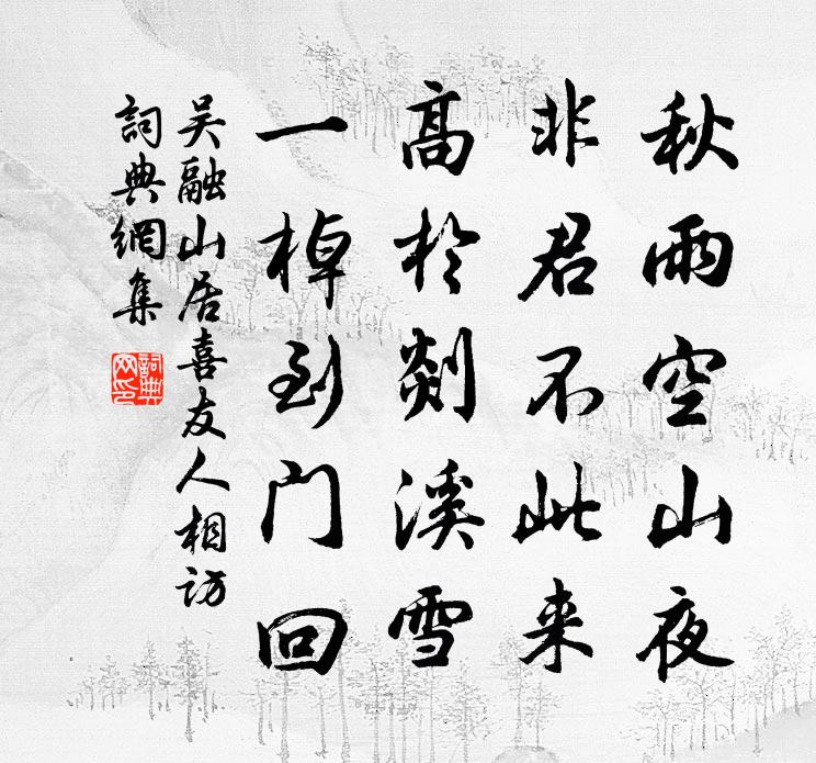 詩詞名句歷史字典書法欣賞書法字典國語詞典說文解字康熙字典古漢語字典標 題 作 者 詩 句 山居喜友人相訪作者:吳融 朝代:唐代山居喜友人相訪原文秋雨空山夜,非君不此來。高於剡溪雪,一棹到門回。詩詞問答問:山居喜友人相訪的作者是誰?答:吳融問:山居喜友人相訪寫於哪個朝代?答:唐代問:山居喜友人相訪是什麼體裁?答:五絕吳融山居喜友人相訪書法欣賞山居喜友人相訪書法作品注釋全唐詩:卷686-29詩詞推薦往舂陵作曾極〔宋代〕杖策行行訪楚囚,也勝流落嶠南州。鬢絲半是吳蠶吐,襟血全因蜀鳥流。徑窄不妨隨劃栗,路長那更聽鉤輈。家山南雪胡仲弓〔宋代〕半生道路困風沙,冰雪駸駸到海涯。鋤卻舊時桃與李,滿園多種木綿花。高郵陳直躬處士畫雁二首蘇軾〔宋代〕野雁見人時,未起意先改。君從何處看,得此無人態。無乃槁木形,人禽兩自在。北風振枯葦,微雪落璀璀。慘澹讀李憕碑張耒〔宋代〕自唐中微北方沸,胡馬長鳴飲清渭。李公守節陷賊庭,身死骷髏行萬里。百年事往誰復省,一丘榛莽無人祭。荒碑殘冬客次資陽江王嵒〔宋代〕淡雲殘雪簇江天,策蹇遲回客興闌。持缽老僧來咒水,倚船商女待搬灘。沙翹白鷺非真靜,竹映繁梅奈苦寒。阮籍用東坡武昌寒溪韻三篇朱槔〔宋代〕東坡謫官未放回,桃花不系玄都栽。機牙愛獨造物手,五見江雨肥江梅。扁舟一笑凌浩渺,瘦筇結伴登崔嵬。窪尊送劉立之著作歸長安因赴安定知縣文同〔宋代〕西郊晴霧曉霏霏,回首京塵一拂衣。上國莫嗟為客久,高堂初喜改官歸。洛城氣候花才動,灞水風光絮恰飛。恨不克復後登安國寺閣唐彥謙〔唐代〕千門萬戶鞠蒿藜,斷燼遺垣一望迷。惆悵建章鴛瓦盡,夜來空見玉繩低。慕巢尚書書雲室人慾為置一歌者非所安也…因而和之白居易〔唐代〕東川已過二三春,南國須求一兩人。富貴大都多老大,歡娛太半為親賓。如愁翠黛應堪重,買笑黃金莫訴貧。他日八月十四夜月下聞秋聲仇遠〔宋代〕中秋才一宿,此夜已圓明。星斗何曾見,雲煙不敢生。黃花千萬粟,白髮兩三莖。愁聽東南角,奔騰風雨聲。喜晴趙蕃〔宋代〕地雖湖北稻為鄉,歲比曾微一報稂。望望雨晴求屢告,欣欣守尉德俱良。共朝負籠爭晴割,敢愛當檠滴夜涼。更擬跋桂侄梅絕句劉克莊〔宋代〕老鶴收聲只自悲,夏然清唳警衰遲。不嫌汝伯無漆發,稍喜吾家有白眉。二尺檠邊能辦此,百花頭上更饒誰。隆乾南歌子向子諲〔宋代〕江左稱岩桂,吳中說木犀。水沈為骨鬱金衣。卻恨疏梅惱我、得香遲。葉借山光潤,花蒙水色奇。年年勾引賦新詩裴垍金朋說〔宋代〕竭誠佐理獎言司,先正君心帝者師。舉薦不為肓宰相,盡供乃職日孜孜。晚春書懷簡陳巽叔二首王炎〔宋代〕畏病不多酌,遣情時自吟。絮飛春漠漠,樹密午陰陰。壯縣今岑寂,微官有陸沉。青山啼杜宇,未斷故園心。中秋近願晴陳普〔宋代〕秋天連夕捲菸雲,似為蓬蒿有滯人。駟馬高車無夢想,中秋但借一冰輪。哭趙百微少蓬二首劉克莊〔宋代〕長君尤歲輩流稀,君直西垣我北扉。襆被本無桑下戀,聯鞍猶記柳邊歸。錦殘尚足邱遲用,斤妙曾看郢客揮。聞卜夏日晚霽與崔子登周襄故城梅堯臣〔宋代〕雨腳收不盡,斜陽半古城。獨攜幽客步,閒閱老農耕。寶氣無人發,陰蟲入夜鳴。余非避喧者,坐愛遠風清。湖村月夕陸游〔宋代〕誰持綠酒醉幽人?鶴氅筇枝發興新。今夜湖邊有奇事,青山缺處涌冰輪。侍宴安樂公主新宅應制武平一〔唐代〕紫漢秦樓敞,黃山魯館開。簪裾分上席,歌舞列平台。馬既如龍至,人疑學鳳來。幸茲聯棣萼,何以接鄒枚。名句推薦夔府孤城落日斜,每依北斗望京華。杜甫《秋興八首》 行到水窮處,坐看雲起時。王維《終南別業 / 初至山中 / 入山寄城中故人》 江海不擇小助,故能成其富。韓非及後人《韓非子·大體》 故鄉籬下菊,今日幾花開。江總《於長安歸還揚州九月九日行薇山亭賦韻 / 長安九日詩》 手種黃柑二百株,春來新葉遍城隅。柳宗元《柳州城西北隅種柑樹》 年年今夜,月華如練,長是人千里。范仲淹《御街行·秋日懷舊》 今春香肌瘦幾分?縷頻寬三寸。王實甫《十二月過堯民歌·別情》 燎沉香,消溽暑。周邦彥《蘇幕遮·燎沉香》 量入以為出戴聖《禮記·王制》 愁與西風應有約,年年同赴清秋。史達祖《臨江仙·閨思》