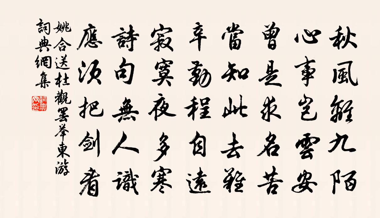 詩詞名句歷史字典書法欣賞書法字典國語詞典說文解字康熙字典古漢語字典標 題 作 者 詩 句 送杜觀罷舉東遊作者:姚合 朝代:唐代送杜觀罷舉東遊原文秋風離九陌,心事豈雲安。曾是求名苦,當知此去難。辛勤程自遠,寂寞夜多寒。詩句無人識,應須把劍看。詩詞問答問:送杜觀罷舉東遊的作者是誰?答:姚合問:送杜觀罷舉東遊寫於哪個朝代?答:唐代問:送杜觀罷舉東遊是什麼體裁?答:五律姚合送杜觀罷舉東遊書法欣賞送杜觀罷舉東遊書法作品注釋全唐詩:卷496-69詩詞推薦泊舟兜率寺呈王承可黃彥平〔宋代〕龍用中宵壯,風揚廣岸波。不堪簉鴛鷺,合作傍黿鼉。寂寂靈妃瑟,滔滔孺子歌。微君澄練手,如我布帆何。酹江月(賀楊誠齋)羅椿〔宋代〕郎星錦帳,忽翩然歸訪,南溪孤鶩。前日登高誰信道,壽酒重浮茱萸。風露杯寒,芙蓉帳冷,笑受長生籙。廣寒宮和鄭貳卿別賦王洋〔宋代〕病逐秋風至,年隨塞草衰。家如百年夢,身入四愁詩。北焙聯圭璧,南薰潤岳池。齋房多勝事,可但滑琉璃。中書夜直寄贈權德輿〔唐代〕通籍在金閨,懷君百慮迷。迢迢五夜永,脈脈兩心齊。步履疲青瑣,開緘倦紫泥。不堪風雨夜,轉枕憶鴻妻。次韻陳叔強見寄戴復古〔宋代〕識面者無數,論交要有緣。未聞蒼玉佩,先枉碧雲篇。采鳳騰詩筆,持螯泛酒船。山陰或乘興,何待菊花天。秋池二首白居易〔唐代〕身閒無所為,心閒無所思。況當故園夜,復此新秋池。岸暗鳥栖後,橋明月出時。菱風香散漫,桂露光參差。靜境賦素馨花舒岳祥〔宋代〕小蕊清香真有韻,柔條纖圳不勝春。承平時節移新主,離亂風塵見故人。淚得闌乾添婀娜,香殘篤耨駐絪緼。舊恩洞仙歌·舊交貧賤辛棄疾〔宋代〕舊交貧賤,太半成新貴。冠蓋門前幾行李。看匆匆西笑,爭出山來,憑誰問,小草何如遠志。悠悠今古事。得喪乘雨後二絕句趙蕃〔宋代〕疾風吹雨過前溪,留得余涼在竹扉。為我拂床仍置席,今朝夢穩故山歸。逍遙詠宋太宗〔宋代〕濟世勤行任百年,方知大道自昭宣。休夸爭變黃金術,誰信空磨白玉穿。智慧宜從高見識,陰功及物最彌堅。是非虞美人(詠海棠)劉辰翁〔宋代〕無花敢與姚黃比。對對鴛鴦起。讖他金帶萬釘垂。誰向麒麟楦里、卸猴緋。潛溪以上難為說。自是君恩別。後來西游清都觀尋沈道士得仙字劉孝孫〔唐代〕紛吾因暇豫,行樂極留連。尋真謁紫府,披霧覿青天。緬懷金闕外,遐想玉京前。飛軒俯松柏,抗殿接雲煙。滔滔望漢江宋祁〔宋代〕西導岷源闊,南浮楚望開。弄珠嫌蚌隱,投璧讓蛟回。岸翠山煙逼,波紅日影來。萬艘徒擾擾,誰是濟川材。菜食員興宗〔宋代〕員子一寒世無有,愛簇生盤如愛酒。菠韮鐵甲幾戟唇,老莧緋裳公染口。駢頭攢玉春試筍,掐指探金暮翻韮。達官贈別表兄韋卿權德輿〔唐代〕新讀兵書事護羌,腰間寶劍映金章。少年百戰應輕別,莫笑儒生淚數行。西池清暉亭許抗〔宋代〕亭號清暉闞碧漣,半連村落半神仙。青山剩得雲間日,明月饒分水底天。蠟梅楊巽齋〔宋代〕香蜜栽葩分外工,疏枝數點綴雛蜂。嬌黃染就宮妝樣,香暖猶宜愛日烘。富池寓懷董嗣杲〔宋代〕求佚徒將意揣摩,臨高又惜歲蹉跎。隔江山禿秋煙空,入樹風號夜浪多。童子得錢思遠引,鄰翁借酒強高歌。謾傳送聞上人游嵩山歐陽詹〔唐代〕二室峰峰昔願游,從雲從鶴思悠悠。丹梯石路君先去,為上青冥最上頭。春暮韋莊〔唐代〕一春春事好,病酒起常遲。流水綠縈砌,落花紅墮枝。樓高喧乳燕,樹密斗雛鸝。不學山公醉,將何自解頤?名句推薦瑤草一何碧,春入武陵溪。黃庭堅《水調歌頭·遊覽》 躞蹀御溝上,溝水東西流卓文君《白頭吟》 西山白雪三城戍,南浦清江萬里橋。杜甫《野望》 揚雲霓之晻藹兮,鳴玉鸞之啾啾。屈原《離騷》 曲終過盡松陵路,回首煙波十四橋。姜夔《過垂虹》 山中何所有,嶺上多白雲。陶弘景《詔問山中何所有賦詩以答》 遺民淚盡胡塵里,南望王師又一年。陸游《秋夜將曉出籬門迎涼有感》 既熟慣,則更覺親密;既親密,則不免一時有求全之毀,不虞之隙。曹雪芹《紅樓夢·第五回》 望處雨收雲斷,憑闌悄悄,目送秋光。柳永《玉蝴蝶·望處雨收雲斷》 捐軀赴國難,視死忽如歸!曹植《白馬篇》