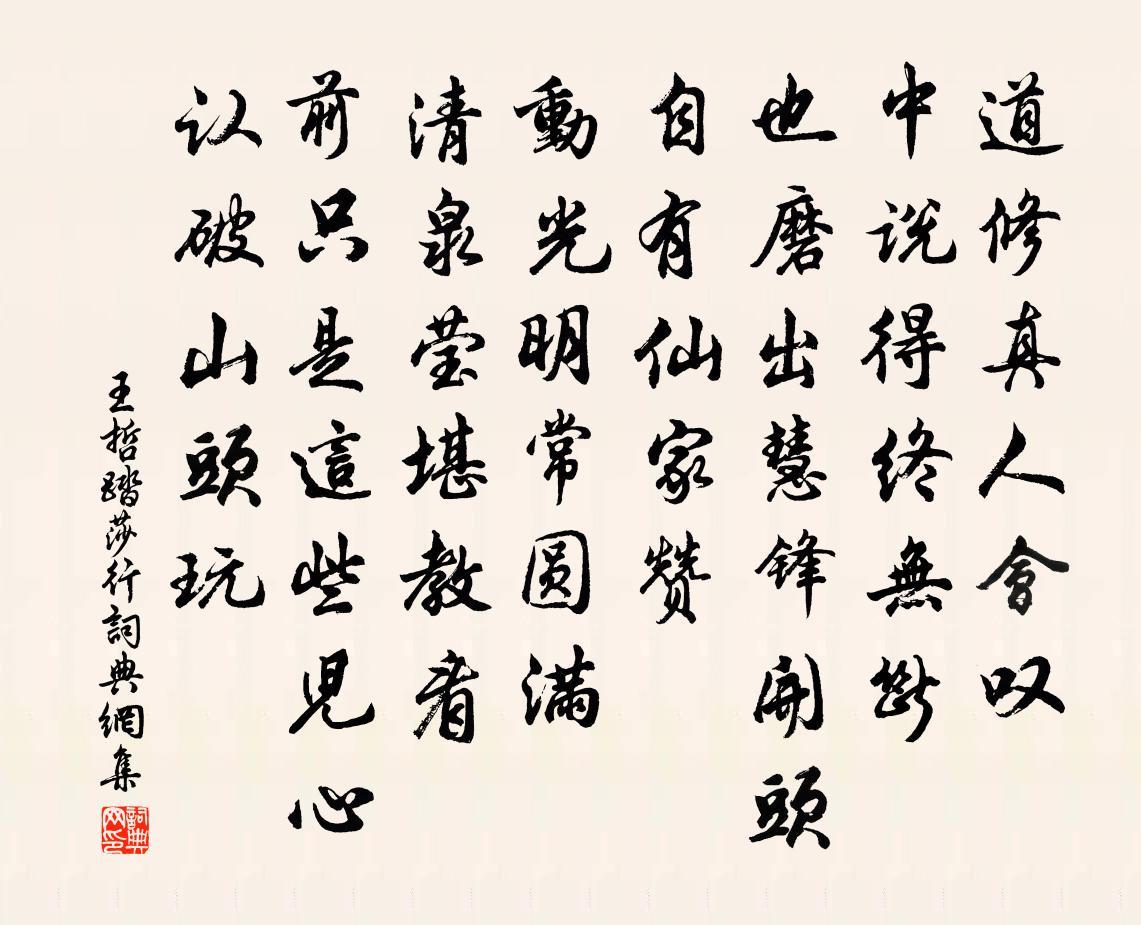 詩詞名句歷史字典書法欣賞書法字典國語詞典說文解字康熙字典古漢語字典標 題 作 者 詩 句 踏莎行作者:王哲 朝代:元代踏莎行原文道修真,人會嘆。中說得終無斷。也磨出慧鋒開,頭自有仙家贊。動光明,常圓滿。清泉瑩堪教看。前只是這些兒,心認破山頭玩。詩詞問答問:踏莎行的作者是誰?答:王哲問:踏莎行寫於哪個朝代?答:元代問:踏莎行是什麼體裁?答:詞王哲踏莎行書法欣賞踏莎行書法作品詩詞推薦明日出城愛其平沙淺水有錢塘西湖氣象借前韻衛博〔宋代〕花紅水綠斗春妍,長望江南憶樂天。黃栗留鳴山寂靜,野棠梨發樹蔫綿。樓台三竺將歸路,氣象西湖欲晚煙。風物自述九首錢時〔宋代〕山翁何處是便宜,正是憑欄晚眺時。忽地小桃當面笑,著何言句可酬伊。蝶戀花陳允平〔宋代〕落盡櫻桃春去後。舞絮飛綿,撲簌穿簾牖。異別情懷愁對酒。翠條折贈勞親手。繡幕深沉寒尚透。雨雨晴晴,妝點壽王通判五首吳勢卿〔宋代〕古稱半刺已翱翔,□壘迴旋舞袖長。賴有治齊清淨法,宏開壽哉海沂康。宿鄠郊贈羅處士李洞〔唐代〕川靜星高櫟已枯,南山落石水聲粗。白雲釣客窗中宿,臥數嵩峰聽五湖。春居雜興王禹偁〔宋代〕雨株桃杏映籬斜,妝點商山副使家。何事春風容不得,和鶯吹折數枝花。寄韋秀才李群玉〔唐代〕荊台蘭渚客,寥落共含情。空館相思夜,孤燈照雨聲。小鳥篇,上裴尹劉長卿〔唐代〕藩籬小鳥何甚微,翩翩日夕空此飛。只緣六翮不自致,長似孤雲無所依。西城黯黯斜暉落,眾鳥紛紛皆有托。獨立旅懷張詠〔宋代〕儒術精窮久,風塵鬢欲衰。知音豈易得,搔首獨何為。寓舍思親處,秋原墜葉時。樂天吟更苦,笑殺五陵兒。聞李六景儉自河東令授唐鄧行軍司馬,以詩賀之白居易〔唐代〕誰能淮上靜風波,聞道河東應此科。不獨文詞供奏記,定將談笑解兵戈。泥埋劍戟終難久,水借蛟龍可在多。四十雜詠一百首穆生劉克莊〔宋代〕決去先生勇,懷安二子慚。向令猶在坐,楚市赭衣三。登彼公堂燕貢士陳襄〔宋代〕登彼公堂,鴻飛戾止。君子燕湑,維其不已。菩薩蠻(侄壽伯)王紹〔宋代〕天正朔旦開新曆。吾家伯父長生日。蘭玉傍庭階。稱觴特地來。後年逢七十。今歲瞻南極。南極壽星宮。分明矍鑠梅花坡韓伯修〔宋代〕休問桃源路,尋梅暫往還。梅花有知己,何必定湖山。噫田操四章章六句寄呈王介甫王令〔宋代〕誰能采芹,不適有獲。果蓏樹之,則食其實。豈弟君子,孔敬且力。南歌子仲殊〔宋代〕解舞清平樂,如今說向誰。紅爐片雪上鉗錘。打就金毛獅子、也堪疑。木女明開眼,泥人暗皺眉。蟠桃已是著花遲秋晚高樓唐彥謙〔唐代〕松拂疏窗竹映闌,素琴幽怨不成彈。清宵霽極雲離岫,紫禁風高露滿盤。晚蝶飄零驚宿雨,暮鴉凌亂報秋寒。高樓憶王孫譚處端〔元代〕塵寰財色苦相縈。著愛浮華役此身。好悟靈源一點真。絕貪嗔。便是中秋有賦魏了翁〔宋代〕望舒與日元非敵,震受陽光巽成魄。六十四象不言月,三百五篇譏月出。古道貴陽不貴陰,賓禮卜晝不卜夕。世間臨江仙石敦夫〔宋代〕窺檐蟾影白,照坐燭花紅。名句推薦獨寫菖蒲竹葉杯,蓬城芳草踏初回。湯顯祖《午日處州禁競渡》 聖賢之所美,莫美乎聰明;聰明之所貴,莫貴乎知人。劉劭《人物誌·序》 丈夫貧賤應未足,今日相逢無酒錢。高適《別董大二首》 暗塵隨馬去,明月逐人來。蘇味道《正月十五夜》 閒來無事不從容,睡覺東窗日已紅。程顥《秋日》 一時寵利有盡,千秋青史難欺。張廷玉《明史·列傳·卷一百三十三》 論德而定次,量能而授官。荀子《荀子·君道》 正護月雲輕,嫩冰猶薄。辛棄疾《瑞鶴仙·賦梅》 香聞流水處,影落野人家。道源《早梅》 暖雨晴風初破凍,柳眼梅腮,已覺春心動。李清照《蝶戀花·暖雨晴風初破凍》