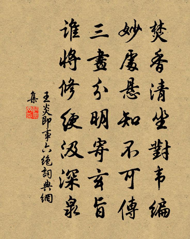 詩詞名句歷史字典書法欣賞書法字典國語詞典說文解字康熙字典古漢語字典標 題 作 者 詩 句 即事六絕作者:王炎 朝代:宋代即事六絕原文焚香清坐對韋編,妙處懸知不可傳。三畫分明寄玄旨,誰將修綆汲深泉。詩詞問答問:即事六絕的作者是誰?答:王炎問:即事六絕寫於哪個朝代?答:宋代王炎即事六絕書法欣賞即事六絕書法作品詩詞推薦賀新郎(送鄭材卿)劉學箕〔宋代〕莫向愁人說。嘆人生、不如意事,十常七八。是則中年傷懷抱,客里何堪送客。又添取、一襟淒咽。岸柳凋零秋容夜集作離合詩謝惠連〔南北朝〕四坐宴嘉賓。一客自遠臻。九言何所戒。十善故宜遵。達磨大師贊釋普濟〔宋代〕五一竺國,東震旦土。傳佛心宗,無本可據。無本據,一葦橫趨,大江東去。題李公麟山莊圖其十三泠泠谷蘇轍〔宋代〕層崖落飛泉,微風泛喬木。坐遣谷中人,家家有琴築。寓吳門十首陳造〔宋代〕平時觴詠妨生理,此去狂疏托上官。但使推敲貸沖節,不煩排日報平安。撲蝴蝶佚名〔宋代〕煙條雨葉,綠遍江南岸。思歸倦客,尋芳來較晚。岫邊紅日初斜,陌上飛花正滿。淒涼數聲羌管。怨春短。玉人應頌古三十八首釋從瑾〔宋代〕踏翻地軸地不動,推倒天關天更高。穩泛兒船歸少室,至今天下起風濤。登潤州城丘為〔唐代〕天末江城晚,登臨客望迷。春潮平島嶼,殘雨隔虹蜺。鳥與孤帆遠,煙和獨樹低。鄉山何處是,目斷廣陵西。梅花引 荊溪阻雪蔣捷〔宋代〕白鷗問我泊孤舟。是身留。是心留。心若留時、何事鎖眉頭。風拍小簾燈暈舞,對閒影,冷清清,憶舊遊。舊遊舊瑞鶴仙陸叡〔宋代〕濕雲黏雁影。望征路愁迷,離緒難整。千金買光景。但疏鍾催曉,亂鴉啼暝。花悰暗省。許多情、相逢夢境。便行蓬萊客馬鈺〔元代〕投玄急。投玄做個聰明客。聰明客。靜清心月,不教雲隔。死生生死無人測。效予入道能超溺。能超溺。虎蟠龍繞聽航船歌十首方回〔宋代〕四千五百魏塘船,結拆船牙解半千。一千修柁貫三米,三日盤纏無一錢。木蓮樹生巴峽山谷間巴民亦呼為黃心樹大者…題三絕句雲白居易〔唐代〕如折芙蓉栽旱地,似拋芍藥掛高枝。雲埋水隔無人識,唯有南賓太守知。紅似燕支膩如粉,傷心好物不須臾。山中次韻學士重陽雪中見招不赴前後十六首洪皓〔宋代〕支離已久懶申陳,枕上賡歌暫釋神。在戶厭聞蛩咽韻,隨陽空羨雁來賓。交情中絕慚張耳,國步主艱憶斬辛。七載和錢處和大資四首曹勛〔宋代〕迷雲公已性天開,雙澗相逢若再來。二老果能如洛下,固宜慧遠賦優哉。謁曹娥廟釋及浦〔宋代〕輟棹江頭謁孝娥,斷碑枯柏尚嵯峨。生為女子即如此,身是男兒又若何。千古美名昭日月,一軀靈骨葬藤蘿。沈魂觀傀儡易士達〔宋代〕刻出形骸假像真,一絲牽動便精神。堪嗤鼓笛收聲後,依舊當時木偶人。北山之高壽北山何先生金履祥〔宋代〕岩岩北山,其高極天。障此東南,利慾之瀾。敢拜稽首,天子萬年。允保四海,好德之端。敢拜夫子,眉壽無愆。黃無悔輓詞四首陳師道〔宋代〕玉箸凝潮後,絲桐藝業餘。遠塗憎早悟,曠度得中疏。子逝今何遽,吾生孰與居。豈無文士傳,未有茂陵書。過鄱陽湖華岳〔宋代〕北風翻雪鼓雷霆,舟子停蘭亦斷魂。看我金鱗三十六,為君一躍上龍門。名句推薦雨里雞鳴一兩家,竹溪村路板橋斜。王建《雨過山村》 屈指數春來,彈指驚春去。高觀國《卜運算元·泛西湖坐間寅齋同賦》 鳥向平蕪遠近,人隨流水東西。劉長卿《謫仙怨·晴川落日初低》 殷勤昨夜三更雨,又得浮生一日涼。蘇軾《鷓鴣天·林斷山明竹隱牆》 千年忠義氣,日星光。離騷讀罷總堪傷。舒頔《小重山·端午》 涕零雨面毀形顏,誰能懷憂獨不嘆。曹丕《燕歌行二首·其二》 樓上幾日春寒,簾垂四面,玉闌乾慵倚。李清照《念奴嬌·春情》 雨過橫塘水滿堤,亂山高下路東西。曾鞏《城南·雨過橫塘水滿堤》 迢迢新秋夕,亭亭月將圓。陶淵明《戊申歲六月中遇火》 眾里尋他千百度,驀然回首,那人卻在,燈火闌珊處。辛棄疾《青玉案·元夕》