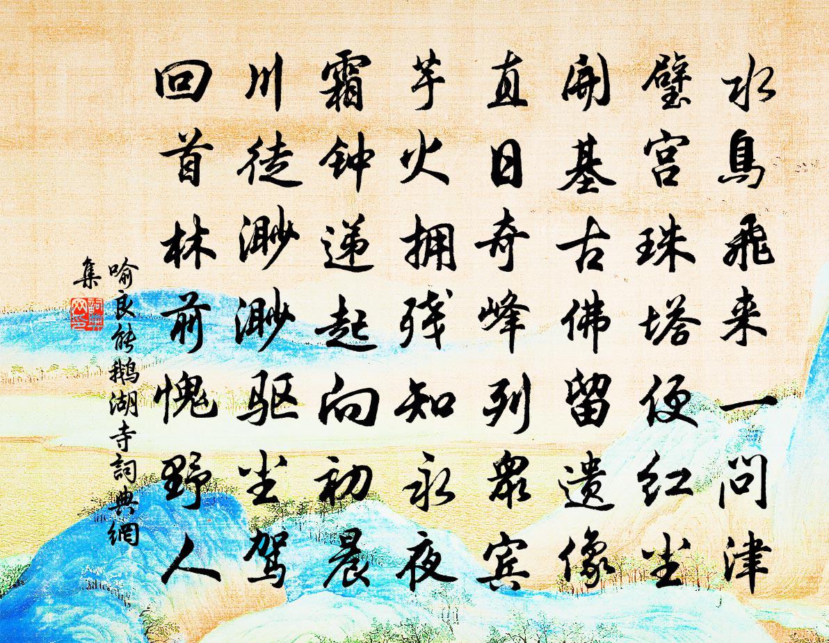 詩詞名句歷史字典書法欣賞書法字典國語詞典說文解字康熙字典古漢語字典標 題 作 者 詩 句 鵝湖寺作者:喻良能 朝代:宋代鵝湖寺原文水鳥飛來一問津,璧宮珠塔便紅塵。開基古佛留遺像,直日奇峰列眾賓。芋火擁殘知永夜,霜鍾遞起向初晨。川徒渺渺驅塵駕,回首林前愧野人。詩詞問答問:鵝湖寺的作者是誰?答:喻良能問:鵝湖寺寫於哪個朝代?答:宋代喻良能鵝湖寺書法欣賞鵝湖寺書法作品詩詞推薦歲暮雜感十首曾國藩〔清代〕芒鞋鎮日踏春還,殘臘將更卻等閒。三百六旬同逝水,四平塗里說家山。緇塵已自沾京雒,羌笛何須怨玉關。為報賢者之孝二百四十首南陔孝子林同〔宋代〕為養還相戒,南陔昔有詩。都盧這個意,焉用補亡為。同韓員外宿雲門寺嚴維〔唐代〕小嶺路難近,仙郎此夕過。潭空觀月定,澗靜見雲多。竹翠煙深鎖,松聲雨點和。萬緣俱不有,對境自垂蘿。雨中五首張耒〔宋代〕節物即自好,客心何落然。早寒清野市,夜雨濕江天。破屋疏茅滴,空廚濕葦煙。政須一杯酒,相與度殘年。游洞霄范寬之〔宋代〕征輪偷暇款琳宮,洞水浮花二月中。塵慮坐清歸意懶,渙襟高詠紫霄風。和吳警齋侍郎二首劉克莊〔宋代〕帝憫龍鍾許放還,夢魂尚記侍威顏。難陪貢禹王陽後,猶在申公轅固間。昔領群仙上蓬島,今為居士老香山。痴年小重山·春愁吳淑姬〔宋代〕謝了荼縻春事休。無多花片子,綴枝頭。庭槐影碎被風揉。鶯雖老,聲尚帶嬌羞。獨自倚妝樓。一川菸草浪,襯雲上雷御史李思衍〔宋代〕台上棲鳥顫曉寒,朱簾雲靜楚天寬。星芒搖動龍阿劍,霜氣橫陳廌角冠。苦透柏心風力勁,清臨梅影雪痕乾。渾源謙齋席間贈苔磯張煒〔宋代〕因合謙齋飲,新編得細喔。髯掀天地闊,足歷水雲多。才敏逢青眼,家成隱翠蘿。近聞詩債盛,老退欲停戈。出門王令〔宋代〕出門將何從,中道忽自思。彼懷與爾殊,亦合念子歸。樂有詩與書,游有山與陂。誰言竟無從,猶有影自隨。次韻秦觀秀才見贈秦與孫莘老李公擇甚熟將入蘇軾〔宋代〕夜光明月非所投,逢年遇合百無憂。將軍百戰竟不侯,伯郎一斗得涼州。翹關負重君無力,十年不入紛華域。故人與幼遐、君貺兄弟同游白家竹潭韋應物〔唐代〕清賞非素期,偶遊方自得。前登絕嶺險,下視深潭黑。密竹已成暮,歸雲殊未極。春鳥依谷暄,紫蘭含幽色。已將次韻潘都乾菊花六首項安世〔宋代〕暖風和日花時,不共人爭醜夷。自愛霜深月冷,累累金粟生肌。梓人傳柳宗元〔唐代〕裴封叔之第,在光德里。有梓人款其門,願傭隙宇而處焉。所職,尋、引、規、矩、繩、墨,家不居礱斫之器。問林夫人輓詞范成大〔宋代〕翰墨門闌正巋然,故應婉娩亦儒先。與聞古學三千禮,能誦家書四百篇。卜協媯姜占永世,夢呼辰已讖凋年。班姬和楊教授張栻〔宋代〕客少從蒿長,居深懶戶開。孤城歲雲莫,瘦馬子能來。長策憐葵向,新詩更雨催。相看前日事,此首忍重回。再和郭印〔宋代〕由來世間事,黑白忌太明。稍欲辨淄澠,開口咈眾情。青山有歸路,杖屨借遐征。寄語社中友,休苦釣時名。郊廟朝會歌辭建隆乾德朝會樂章二十八首佚名〔宋代〕銳旅慶迴旋,邊防盡晏然。鍵彙言偃武,飛將亦趲弦。震曜資平疊,文明協麗天。洸洸成大業,赫奕在青編。句顏棫〔宋代〕未厭殷勤達曙看。閨怨魚玄機〔唐代〕靡蕪盈手泣斜暉,聞道鄰家夫婿歸。別日南鴻才北去,今朝北雁又南飛。春來秋去相思在,秋去春來信息稀。扃閉名句推薦天平山上白雲泉,雲自無心水自閒。白居易《白雲泉》 紅粉佳人休使老,風流浪子莫教貧。佚名《增廣賢文·上集》 墜粉飄香,日日喚愁生。盧祖皋《江城子·畫樓簾暮卷新晴》 別來幾春未還家,玉窗五見櫻桃花。李白《久別離》 林外鳴鳩春雨歇,屋頭初日杏花繁。歐陽修《田家》 布穀飛飛勸早耕,舂鋤撲撲趁春睛。姚鼐《山行·布穀飛飛勸早耕》 墦間人散後,烏鳥正西東。范成大《清明日狸渡道中》 乘我大宛馬,撫我繁弱弓。張華《壯士篇》 積雪覆平皋,飢鷹捉寒兔。孟浩然《南歸阻雪》 關山正飛雪,烽火斷無煙。王維《隴西行》