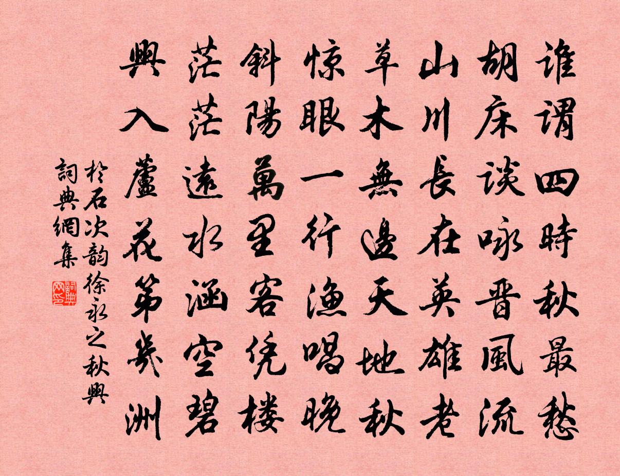 詩詞名句歷史字典書法欣賞書法字典國語詞典說文解字康熙字典古漢語字典標 題 作 者 詩 句 次韻徐永之秋興作者:於石 朝代:宋代次韻徐永之秋興原文誰謂四時秋最愁,胡床談詠晉風流。山川長在英雄老,草木無邊天地秋。驚眼一行漁唱晚,斜陽萬里客憑樓。茫茫遠水涵空碧,興入蘆花第幾洲。詩詞問答問:次韻徐永之秋興的作者是誰?答:於石問:次韻徐永之秋興寫於哪個朝代?答:宋代於石次韻徐永之秋興書法欣賞次韻徐永之秋興書法作品詩詞推薦次韻環翠亭鄭俠〔宋代〕天圍湖海淨團圞,水色山光四座寒。暗結濃陰森萬木,靜鋪遙碧擁千巒。共斟綠醑看浮蟻,遙見孤舟下遠湍。是處石湖山居顧逢〔宋代〕幽居入翠微,樂似在松時。野景俱成畫,山行總是詩。黠禽爭浴水,戲鵲倒懸枝。此意誰能識,徜徉只自知。同賦蚊孔武仲〔宋代〕生長雖微細,翾飛逐盛陽。吾身非鐵石,爾嘴太銛剛。戢戢朝藏壁,喧喧暮滿房。燈前已環繞,檐角尚悠揚。紗眼靈岩道中二首陳造〔宋代〕過盡南山過北山,幽花好鳥翠霏間。滿前風物牽詩興,可是平生馬上閒。題義門胡氏華林書院陳堯叟〔宋代〕旌闕書亭煥水鄉,四時煙景似滄浪。玉漿寒色連莎砌,金障秋陰覆草堂。田裡從來應遜畔,兒孫遊戲亦成行。吾君和雁湖先生病起自警八章程公許〔宋代〕三關中隱玉閣,七言味在蕊珠。妙得養生真訣,善刀四顧躊躇。荊江大雪鄭獬〔宋代〕長鯨戲浪噴滄海,北風吹乾成雪花。漫空傾下不暫住,三日不見金老鴉。天工鬧巧變物境,玉作荊州十萬家。須臾浪淘沙(中秋雨)蕭漢傑〔宋代〕愁似晚天雲。醉亦無憑。秋光此夕屬何人。貧得今年無月看,留滯江城。夜起候檐聲。似雨還晴。舊家誰信此時情窗前種小梅樹今年未著花但春來綠陰亂眼每過鄭剛中〔宋代〕水邊移得竹邊栽,樹小條新花未開。綠葉參差須細看,尚疑低處有青梅。蝶戀花周孚先〔宋代〕舟艤津亭何處樹。曉起瓏璁,回首 * 霧。江上離人來又去。飄零隻似風前絮。倦倚蓬窗誰共語。野草閒花,一一酬成賢良陳起〔宋代〕獻璞無成喜弄璋,世間得失事相參。劉蕡不得言時事,半為當時記朴庵。永遇樂(送春)洪瑹〔宋代〕歌雪徘徊,夢雲溶曳,欲勸春住。薄倖楊花,無端杜宇,抵死催教去。參差煙岫,千回百匝,不解禁春歸路。病厭送胡彥龍過金陵高彥竹〔宋代〕金陵往事已成虛,江水清清只見魚。遺廟空存元帝像,故家多有二王書。秋風出塞調生馬,夜月吟淮跨蹇驢。借問菩薩蠻 湖上即事劉因〔元代〕樓前曲浪歸橈急。樓中細雨春風涇。終日倚危闌。故人湖上山。高情渾似舊。只在東風瘦。薄晚去來休。裝成一段自知丘葵〔宋代〕古寺棲身又兩期,西風吹我鬢成絲。俗兒往往貌相敬,吾道悠悠心自如。盡去皮毛方是學,若無情性定非詩。可憐贊三十六祖頌釋印肅〔宋代〕提多迦初生,光超日月燈。山頂泉迸涌,此路少人行。史敷文輓詞樓鑰〔宋代〕學問源流遠,樂哉賢父兄。人琴亡舊曲,風木愴寒聲。深痛幾成毀,沉痾汔喪生。孝恭無可憾,猶得傍佳城。罷藥白居易〔唐代〕自學坐禪休服藥,從他時復病沉沉。此身不要全強健,強健多生人我心。次韻蘇主管青溪十絕句項安世〔宋代〕老翁何處已飛仙,想跨寒驢挾短鞭。來徃段家池上路,只今枯柳尚鳴蟬。送夔州班使君司空曙〔唐代〕魚國巴庸路,麾幢漢守過。曉檣爭市隘,夜鼓祭神多。雲白當山雨,風清滿峽波。夷陵舊人吏,猶誦兩岐歌。知名句推薦香非在蕊,香非在萼,骨中香徹。晁補之《鹽角兒·亳社觀梅》 余拏一小舟,擁毳衣爐火,獨往湖心亭看雪。張岱《湖心亭看雪》 花前失卻遊春侶,獨自尋芳。馮延巳《採桑子·花前失卻遊春侶》 平生不會相思,才會相思,便害相思。徐再思《折桂令·春情》 才有淺深,無有古今;文有偽真,無有故新。王充《論衡·卷二十九·案書篇》 糝徑楊花鋪白氈,點溪荷葉疊青錢。杜甫《絕句漫興九首·其七》 蠻姜豆蔻相思味。算卻在、春風舌底。吳文英《杏花天·詠湯》 今年對花最匆匆,相逢似有恨,依依愁悴。周邦彥《花犯·小石梅花》 美人如花隔雲端。李白《長相思三首》 愁損翠黛雙蛾,日日畫闌獨憑。史達祖《雙雙燕·詠燕》