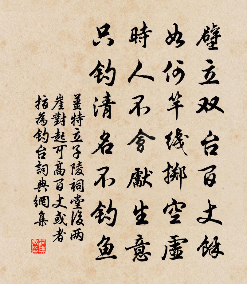 詩詞名句歷史字典書法欣賞書法字典國語詞典說文解字康熙字典古漢語字典標 題 作 者 詩 句 子陵祠堂後兩崖對起可高百丈或者指為釣台作者:姜特立 朝代:宋代原文壁立雙台百丈余,如何竿線擲空虛。時人不會先生意,只釣清名不釣魚。詩詞問答問:《子陵祠堂後兩崖對起可高百丈或者指為釣台》的作者是誰?答:姜特立問:該詩寫於哪個朝代?答:宋代書法欣賞子陵祠堂後兩崖對起可高百丈或者指為釣台書法作品詩詞推薦行香子趙元〔元代〕潦倒無聞。坐慣家貧。眼昏花,心口猶存。人皆笑我,我盡教人。┾醉吟風,閒釣月,困眠雲。邂逅交親。語款情青羊宮何耕〔宋代〕一再官錦城,咫尺望琳宮。未始得得來,正望役役中。今朝弄晴雨,策蹇隨春風。頗受意象古,停驂小從容。縹緲隴州神泉鋪後池李復〔宋代〕山腰綠映女郎祠,祠下泉通竹下池。時有游鯈自來去,只應曾見理鉤絲。次韻子瞻和淵明擬古九首蘇轍〔宋代〕憂來感人心,悒悒久未和。呼兒具濁酒,酒酣起長歌。歌罷還獨舞,黍麥力誠多。憂長酒易消,脫去如風花。不悟採桑子晏幾道〔宋代〕金風玉露初涼夜,秋草窗前。淺醉閒眠,一枕江風夢不圓。長情短恨難憑寄,枉費紅箋。試拂麼弦,卻恐琴心可暗自嘲釋智圓〔宋代〕門徑任苔荒,長年寢一床。病中消白日,詩里發清狂。窗暗雲遮月,林明葉墜霜。百年能幾日,兩鬢已蒼蒼。酬嚴給事賀加五品兼簡同制水部李郎中劉禹錫〔唐代〕九天雨露傳青詔,八舍郎官換綠衣。初佩銀魚隨仗入,宜乘白馬退朝歸。雕盤賀喜開瑤席,彩筆題詩出鎖闈。聞道滿庭芳 贈辛五翁姜四翁馬鈺〔元代〕豪富過人,作為異眾,萊陽姜鑒辛通。文登趁醮,不憚冒霜風。來往近乎千里,投壇告、馬鈺姜公。持孝道,宰公湖州歌九十八首 其九十一汪元量〔宋代〕江南郡守列金階,內里華筵日日排。文武官僚多二品,還鄉盡帶虎頭牌。送珊上座歸育王白玉蟾〔宋代〕一雙膝脛兩條鐵,一掬精神一團雪。早曾火燄上翻身,鴛幃不把丁香結。風吹香囊滿路香,知君也結欽山轍。忽然壬戌正月十四日陸游〔宋代〕老子居然健,上元如許晴。湖平波不起,天闊月徐行。散發漁舟穩,臨風野笛清。安能擁笳鼓,萬里將幽并。嘲淮風進退格楊萬里〔宋代〕絮帽貂裘莫出船,北窗最緊且深關。顛風無賴知何故,做雪不成空自寒。不去掃清天北霧,只來捲起浪頭山。便能謝世詩二首吳潛〔宋代〕股肱十載竭丹心,諫草雖多禍亦深。補袞每思期仲甫, * 未必是曾參。氈裘浩蕩紅塵滿,風雨淒涼紫殿陰。遙望送孔周之南海謁王尚書楊衡〔唐代〕泛棹若流萍,桂寒山更青。望雲生碧落,看日下滄溟。潮盡收珠母,沙閒拾翠翎。自趨龍戟下,再為誦芳馨。水龍吟佚名〔宋代〕邦人前世條緣,福星遇得長庚李。光芒初照,一聲霹靂,重開天地。試問年來,民間安枕,伊誰之賜。有 * 酬孟十二新居見寄陸長源〔唐代〕大道本夷曠,高情亦沖虛。因隨白雲意,偶逐青蘿居。青蘿紛蒙密,四序無慘舒。餘清濯子襟,散彩還吾廬。去歲題酸棗縣蔡中郎碑王建〔唐代〕蒼苔滿字土埋龜,風雨銷磨絕妙詞。不向圖經中舊見,無人知是蔡邕碑。客過張耒〔宋代〕歲窮北風卷平楚,張子畏寒深閉戶。叩門過我者為誰,束帶出見亦良苦。俯眉謂客子勿瞠。我心善煩勿多語。天寒風流子(別贛上故人用美成韻)趙必〔宋代〕春光才一半,春未老、誰肯放春歸。問 * 價數,酒邊商略,尋春巷陌,鞭影參差。春無盡,春鶯調巧舌,春燕壘覺華山居三首仲並〔宋代〕竟日人聲斷,空山一二家。猶憐中夜雨,不礙曉來花。健飯蔬如肉,沖寒酒當茶。飛潛各有性,貧樂付天涯。名句推薦江山如有待,花柳自無私。杜甫《後游》 欲說還休,卻道“天涼好個秋”!辛棄疾《醜奴兒·書博山道中壁》 人而無儀,不死何為?佚名《相鼠》 五嶽尋仙不辭遠,一生好入名山游。李白《廬山謠寄盧侍御虛舟》 形在江海之上,心存魏闕之下劉勰《文心雕龍·神思》 夫禮之初,始諸飲食戴聖《禮記·禮運》 灞涘望長安,河陽視京縣。謝朓《晚登三山還望京邑》 送客自傷身易老,不知何處待先生。劉滄《贈道者》 樹德務滋,除惡務本佚名《尚書·周書·泰誓》 春晚綠野秀,岩高白雲屯。謝靈運《入彭蠡湖口》