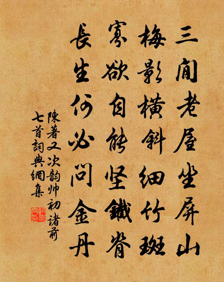 詩詞名句歷史字典書法欣賞書法字典國語詞典說文解字康熙字典古漢語字典標 題 作 者 詩 句 又次韻帥初諸前七首作者:陳著 朝代:宋代又次韻帥初諸前七首原文三閒老屋坐屏山,梅影橫斜細竹斑。寡慾自能堅鐵脊,長生何必問金丹。詩詞問答問:又次韻帥初諸前七首的作者是誰?答:陳著問:又次韻帥初諸前七首寫於哪個朝代?答:宋代陳著又次韻帥初諸前七首書法欣賞又次韻帥初諸前七首書法作品詩詞推薦苦雪寄退之盧仝〔唐代〕天王二月行時令,白銀作雪漫天涯。山人門前遍受賜,平地一尺白玉沙。雲頹月壞桂英下,鶴毛風剪亂參差。山人一年老一年陸游〔宋代〕一年老一年,一日衰一日;譬如東周亡,豈復須大疾。嬾惰已廢書冊久,病來亦復疏杯酒。軔車小住固自佳,拂袖吾年過八十陸游〔宋代〕八十又過二,自言名放翁。斧丘遺壽櫟,雲海寄冥鴻,酒掛驢鞍側,詩投藥笈中。灞城逢薊叟,共語莫匆匆。韓尚書南澗公之從弟德文為東廣常平上幕丙寅曾豐〔宋代〕白露一旬後,秋分三日前。幕中餘暇日,城上肆華筵。卓立參天木,橫陳撲地煙。主人非獨答,客筆不如椽。寄湖口茶局臧尚乾董嗣杲〔宋代〕酡顏探得洞玄真,老氣摩霄岸角巾。案上押批呼局吏,津頭釀酒謝江神。天寒茶課收征倍,雪霽梅吟寄驛頻。何日元日雪二首陳師道〔宋代〕半夜風如許,平明雪皓然。簾疏穿瑣細,竹壓更嬋娟。窘兔走留跡,飢烏鳴乞憐。遙忻炎海上,還復得新年。徐稚山給事慶八十樂語口號陸游〔宋代〕欲知主聖本臣忠,傾盡嘉謨沃舜聰。同載方如周呂尚,安車不數漢申公。日烘盎盎花光暖,燭映鱗鱗酒浪紅。白首碁山院董淵〔宋代〕風際有雲多世態,海中無底是人心。可堪更問碁山話,一局閒爭古到今。招友人鳳山觀雪姚勉〔宋代〕霜風才辦兩朝晴,怪聽敲窗又雨聲。一夜忽生虛室白,六花已與短檐平。酒斟銷帳真成俗,興盡扁舟且未清。想得游武夷作陳韡〔宋代〕閬風元不隔扃扉,桑柘筠匼匝圍。溪貫一原藏曲折,山羅萬象欲騰飛。仙壇起霧成丹灶,玉女披霞作彩衣。寂寂幔玉樓春(丁卯四月一十三日書考會作)郭應祥〔宋代〕賢僚益友俱親密。真箇三年如一日。清尊倒處笑喧譁,彩筆吟餘才俊逸。杯盤狼籍情真率。歌管棋枰仍間出。今朝句俞瑊〔宋代〕壁山僻陋戶口少,兩衙之外惟高眠。悶書二首楊公遠〔宋代〕客里因循斷送春,況逢天氣半晴陰。生來百事少如意,老去千般都上心。長鋏空彈馮氏劍,良材還斲蔡翁琴。愁懷答鄭騎曹青橘絕句(一作故人重九日求橘書中戲贈)韋應物〔唐代〕憐君臥病思新橘,試摘猶酸亦未黃。書後欲題三百顆,洞庭須待滿林霜。廬山歌送至弘法師兼呈薛江州皇甫冉〔唐代〕釋子去兮訪名山,禪舟容與兮住仍前。猿啾啾兮怨月,江渺渺兮多煙。東林西林兮入何處,上方下方兮通石路。連康仙祠釋寶玄〔宋代〕南望青山十里賒,五雲深處問琵琶。從知天子封侯廟,原是神仙賣藥家。新居六詠梅窗陳文蔚〔宋代〕綠陰初散地,今有入檐枝。開窗對瀟灑,歲寒惟獨知。偈頌一百四十一首釋師範〔宋代〕鼻繩拽脫上梅溪,橫臥千峰適所宜。豈謂業級逃不得,依前拽耙與牽梨。壽傅守釋若芬〔宋代〕仙遊舍人聲建中,正論久矣排群雄。令子賢孫俱有耀,皇天兩耳元非聾。立春帖子太上皇后閣周必大〔宋代〕清晚鳴鞘下紫宸,玉觴椒酒壽雙親。袞衣更得褘衣助,總道新春勝舊春。名句推薦五原秋草綠,胡馬一何驕。李白《塞上曲》 猶有遺簪,不展秋心,能卷幾多炎熱。張炎《疏影·詠荷葉》 唯有長江水,無語東流。柳永《八聲甘州·對瀟瀟暮雨灑江天》 斜風細雨作春寒。對尊前。朱淑真《江城子·賞春》 以三寸之舌,彊於百萬之師。司馬遷《史記·平原君虞卿列傳》 昔孟母,擇鄰處。子不學,斷機杼。王應麟《三字經·全文》 淡淡橫朝煙,脈脈深秋思。劉道著《湘江秋曉》 大凡朋友須箴規指摘處少,誘掖獎勸意多,方是。王陽明《傳習錄·卷下·門人陳九川錄》 不經一事,不長一智。佚名《增廣賢文·下集》 江燕話歸成曉別,水花紅減似春休。西風梧井葉先愁。吳文英《浣溪沙·秋情》