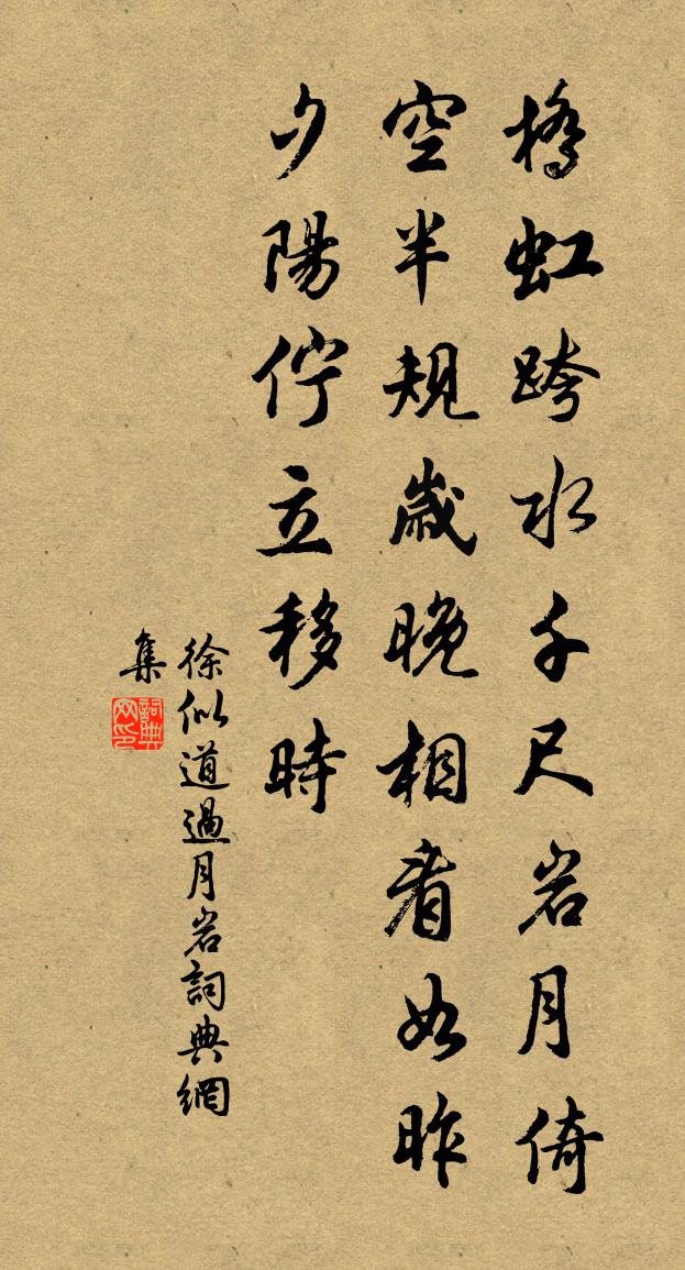 詩詞名句歷史字典書法欣賞書法字典國語詞典說文解字康熙字典古漢語字典標 題 作 者 詩 句 過月岩作者:徐似道 朝代:宋代過月岩原文橋虹跨水千尺,岩月倚空半規。歲晚相看如昨,夕陽佇立移時。詩詞問答問:過月岩的作者是誰?答:徐似道問:過月岩寫於哪個朝代?答:宋代徐似道過月岩書法欣賞過月岩書法作品詩詞推薦偈頌七十八首釋正覺〔宋代〕吾家種草古今難,針鼻才分度線端。混處相期君把手,到時不與汝同盤。卻來大用縱橫是,向去全功轉側看。底事次韻李季章參政哭其夫人陸游〔宋代〕焚香黃閣退朝歸,道話時時正要提。九十老翁緣底健?一生強半是單棲。雪中雪坡十憶姚勉〔宋代〕倚空銀管立嵯峨,看雪須登窣堵波。一覽瓊田三萬頃,分明掌上見山河。燕鄭谷〔唐代〕年去年來來去忙,春寒煙暝渡瀟湘。低飛綠岸和梅雨,亂入紅樓揀杏梁。閒幾硯中窺水淺,落花徑里得泥香。千言春夜陸游〔宋代〕老憊生如寄,春寒夢亦孤。燈花時自墜,梟語迭相呼。萬里書難得,三年病未蘇。窗深不知曉,但覺動林烏。菜羹姜特立〔宋代〕凡物貴適口,何必費橐金。蓴羹與菰菜,千里起歸心。野有美芹獻,重意有所臨。淡薄斯近道,厚味腊毒深。彼哉贈黃任道強至〔宋代〕辭源浩蕩輸滄海,筆勢飄颻薄紫霞。公府薦才猶未試,士林淪滯不須嗟。相逢轉更開懷抱,一跌何嘗掛齒牙。文帝正月將晦繁星滿天楊萬里〔宋代〕兔冷蟾寒不出時,群仙無睡尚游嬉。可憐深夜無燈火,碧玉枰前暗著棋。上吳履齋四明士子〔宋代〕來則非邪抑是邪,緣堤何必更行沙。瑟當調處難膠柱,棋到危時見作家。公論有誰能著腳,事機至此轉聱牙。不如蠟燭孫復〔宋代〕六龍西走入崦嵫,寂寂華堂漏轉時。一寸丹心如見用,便為灰燼亦無辭。初夏三絕呈遊子明、王仲顯其范成大〔宋代〕送春迎夏未聞雷,日日斜風細雨來。不是故人能裹飯,柴門雖設為誰開?與王德強王冕〔元代〕阿伯遷官之五羊,嚴尊習隱水南莊。人生出處故有分,世道如斯徒自忙。笑我漂流雙□雪,羨君奔走滿靴霜。功名過邠州留題竇儀〔宋代〕多少樊籠不敢開,強拘物性要相倍。何時得似邠州守,德政臨民鶴自來。古意贈梁肅補闕孟郊〔唐代〕曲木忌日影,讒人畏賢明。自然照燭間,不受邪佞輕。不有百鍊火,孰知寸金精。金鉛正同爐,願分精與粗。致語口號陸游〔宋代〕涼月參差白露漙,請看賓主罄清歡。麟符玉節交相映,鳳竹鸞絲殊未闌。百穀方登倉庚足,七州無事裡閭安。樽前送育維那釋行機〔宋代〕克賓一字入公門,有理難伸笑 * 。隱靜不行興化令,他年誰道棒頭親。失調名佚名〔宋代〕夜深簾幕靜,一曲管弦清。題江郎廟六絕陳淳〔宋代〕緣爾江家兄弟三,平生愛此石岩岩。寓居石下多年代,陋俗因成附會談。寧都趙令君貽貺五言四首意索余和不可虛辱如曾豐〔宋代〕江西窮處縣,松竹勿嫌深。簿領塵中坐,溪山好處吟。鳴弦人異調,把酒月同斟。倘有可書事,閒收入志林。又和後九首劉克莊〔宋代〕康術鷹眼不化,處仲蜂目亦露。我自有觀人訣,汝勿為相祖誤。名句推薦行舟逗遠樹,度鳥息危檣。陰鏗《渡青草湖》 土花曾染湘娥黛,鉛淚難消。納蘭性德《採桑子·土花曾染湘娥黛》 當時父母念,今日爾應知。白居易《燕詩示劉叟》 小憐初上琵琶,曉來思繞天涯。王安國《清平樂·春晚》 昨夜吳中雪,子猷佳興發。李白《答王十二寒夜獨酌有懷》 海角天涯,寒食清明,淚點絮花沾袖。吳文英《花心動·柳》 白髮悲明鏡,青春換敝裘。岑參《武威春暮聞宇文判官西使還已到晉昌》 國亡身殞今何有,只留離騷在世間。張耒《和端午》 其餘七匹亦殊絕,迥若寒空動煙雪。杜甫《韋諷錄事宅觀曹將軍畫馬圖》 春宵一刻值千金,花有清香月有陰。蘇軾《春宵·春宵一刻值千金》