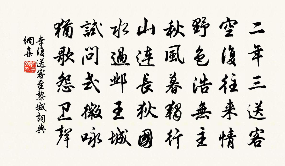 詩詞名句歷史字典書法欣賞書法字典國語詞典說文解字康熙字典古漢語字典標 題 作 者 詩 句 送客至黎城作者:李復 朝代:宋代送客至黎城原文二年三送客,空復往來情。野色浩無主,秋風暮獨行。山連長狄國,水過鄴王城。試問式微詠,猶歌怨衛聲。詩詞問答問:送客至黎城的作者是誰?答:李復問:送客至黎城寫於哪個朝代?答:宋代李復送客至黎城書法欣賞送客至黎城書法作品詩詞推薦和夾谷書隱先生寄題蛟峰石峽書院三十韻何夢桂〔宋代〕堪輿運玄化,萬物品彙分。狉狉鹿豕群,中吸五色麟。聖哲不出世,郊囿可能馴。粵從光岳分,鴻靈鹹糾紛。征役題滄浪峽羅鄴〔唐代〕門向紅塵日日開,入門襟袖遠塵埃。暗香惹步澗花發,晚景逼檐溪鳥回。不為市朝行路近,有誰車馬看山來。可憐初寒無衾買紙被以紓急作四絕趙蕃〔宋代〕度夕陰風吹扊扅,布衾如鐵念嬌兒。夜來例拜奇溫賜,但覺安眠曉不知。晚登子城陸游〔宋代〕江頭作雪雪未成,北風吹雲如有營。驅車出門何所詣,一放吾目登高城。城中繁雄千萬戶,朱門甲第何崢嶸。錦機和微之游湖春夏秋冬四絕韓維〔宋代〕敗荷衰折水西流,極目清光好放舟。幸有主人頻卜晝,肯同俗子更悲秋。素李嶠〔唐代〕□□□□女,纖腰洛浦妃。□□遠方望,雁足上林飛。妙奪鮫綃色,光騰月扇輝。非君下路去,誰賞故人機。送王炎弼赴山陽守以兵衛森畫戟宴寢凝清香為曾協〔宋代〕詩成嘯諾余,謀出壺觴暇。卻整進賢冠,麒麟要圖畫。和黃侍郎韻度正〔宋代〕君不見君家涪翁居戎州,只為山月來登樓。又不見君家繡衣老使君,傳家文物如卿雲。兩仙仙去今百載,雲冠霞佩馬郎婦贊釋惟一〔宋代〕雲開天竺,月照金沙。心心妙法,念念蓮華。示必將身許馬家。覽鏡偈宗澤〔宋代〕覽鏡影還在,掩鏡影還去。試問鏡中人,卻歸什麼處。句王度〔宋代〕樵斧和雲斫,漁蓑帶雪披。戰掉醜奴兒馬鈺〔元代〕悟來修煉身中寶,不騁髯掀。唯喜沉煙。施布仁風無黨偏。願心堅。勸人識破浮生夢,戀甚華軒。更不觀簾。隨我和吳準十齋所賡劉石澗詠湖山之樂因見示韻杜范〔宋代〕勝賞付飛觴詩,讀人妙嚼芳。荷君相抆拭,容我共清涼。湛欲人空老,偷閒策最長。高峰應更好,何日級桄榔。送天台陳庭學序宋濂〔明代〕西南山水,惟川蜀最奇。然去中州萬里,陸有劍閣棧道之險,水有瞿塘、灩澦之虞。跨馬行,則篁竹間山高者,累從趙廟求菖蒲胡寅〔宋代〕欲從蒲澗問安期,仙事茫茫不可知。何許寸根仍穊節,解教霜鬢卻青絲。風流公子茝蘭伴,憔悴騷人香草詩。乞取杏溪十首杏水姚合〔唐代〕不與江水接,自出林中央。穿花復遠水,一山聞杏香。我來持茗甌,日屢此來嘗。滿江紅(烏衣園)吳潛〔宋代〕喚出山來,把鷗鷺、盟言輕食。依舊是、江濤如許,雨帆煙笛。歌罷莫愁檀板緩,杯傾白墮瓊酥滴。但驚心、十六題慈照坦上人房應山閣釋文珦〔宋代〕禪心直以山為體,不與終南捷徑同。吟久白雲生曲檻,定回明月在前峰。子牙釣石臨溪古,博望槎源與漢通。自有琮上人以詩惠茶筍史彌寧〔宋代〕解道碧雲句,三生湯惠休。試春輟鷹爪,斸雨餉獵頭。夢境可容到,饞涎那複流。舌端吾薦取,倘不負珍投。和潘良貴題明州三江亭韻陳棲筠〔宋代〕紅塵一點不相侵,下瞰澄江幾萬尋。地接海潮分鼎足,檐飛鳳翼峙天心。三山有路雲收幕,午夜無風月涌金。欲識名句推薦要問相思,天涯猶自短。晏幾道《清商怨·庭花香信尚淺》 白髮悲花落,青雲羨鳥飛。岑參《寄左省杜拾遺》 勝人者有力,自勝者強。老子《老子·道經·第三十三章》 學之乃知,不問不識。王充《論衡·卷二十六·實知篇》 阿香秋夢起嬌啼,玉女傳幽素。吳文英《燭影搖紅·越上霖雨應禱》 逢郎欲語低頭笑,碧玉搔頭落水中。白居易《採蓮曲》 垂楊低映木蘭舟。半篙春水滑,一段夕陽愁。晁補之《臨江仙·綠暗汀洲三月暮》 博學篤志,切問近思,此八字是收放心的工夫王永彬《圍爐夜話·第一七六則》 休問梁園舊賓客,茂陵秋雨病相如。李商隱《寄令狐郎中》 葉落根偏固,心虛節更高。憨山德清《詠竹五首》