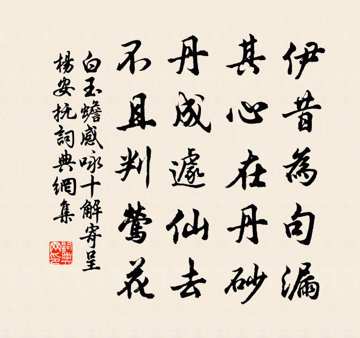 詩詞名句歷史字典書法欣賞書法字典國語詞典說文解字康熙字典古漢語字典標 題 作 者 詩 句 感詠十解寄呈楊安撫作者:白玉蟾 朝代:宋代感詠十解寄呈楊安撫原文伊昔為句漏,其心在丹砂。丹成遽仙去,不且判鶯花。詩詞問答問:感詠十解寄呈楊安撫的作者是誰?答:白玉蟾問:感詠十解寄呈楊安撫寫於哪個朝代?答:宋代問:感詠十解寄呈楊安撫是什麼體裁?答:五絕白玉蟾感詠十解寄呈楊安撫書法欣賞感詠十解寄呈楊安撫書法作品詩詞推薦和聖俞百花洲二首歐陽修〔宋代〕荷深水風闊,雨過清香發。暮角起城頭,歸橈帶明月。看潮陳藻〔宋代〕何處飛來白鷺多,潮頭已減數分□。西旋沖卻東流散,陳陳將軍引戰過。巫山十二峰陽枋〔宋代〕真靈間氣巧蟠融,天下應無似此峰。笑殺襄王凡俗骨,妄生狂夢想仙蹤。贈無咎以既見君子云胡不喜為韻八首張耒〔宋代〕觸有羸其角,進有跋其胡。膏車秣吾馬,白日在修途。雖乏亡何杯,頗多未見書。力學致事功,良田本深鋤。陸務觀編修以石芥送劉韶美吏部劉飲以勁酒二周必大〔宋代〕自移家具失連牆,不復燈前共詠觴。手裡有詩憐指動,甕邊無分笑頭方。寄育王廓和尚釋了演〔宋代〕向來事業俱荒廢,即體生涯迥一空。漸愧此身無被蓋,百般痴鈍玷宗風。賦得巢燕送客錢起〔唐代〕能棲杏梁際,不與黃雀群。夜影寄紅燭,朝飛高碧雲。含情別故侶,花月惜春分。盆梅仇遠〔宋代〕有客送苔梅,來自馬塍里。斜枝巧盤折,的皪數十蕊。意欲媚春風,寧免少屈己。獨憐鐵石腸,竟作柔繞指。他鄉能賦台王之道〔宋代〕萬頃玻瓈水浸空,台前佳色詠難窮。倚欄人在煙霞外,落筆詩成笑語中。屬句畏慚非孟子,供歡端合有車公。解將蘇武慢凌雲翰〔元代〕芳草纖纖,遊絲冉冉,可愛地晴江碧。世事浮雲,人生大夢,歧路漫悲南北。漉酒春朝,步蟾秋夜,卻憶舊時巾舄題彭祖樓薛能〔唐代〕新晴天狀濕融融,徐國灘聲上下洪。極目澄鮮無限景,入懷輕好可憐風。身防潦倒師彭祖,妓擁登臨愧謝公。誰致戲呈珉禪師周麟之〔宋代〕我來何幸識支郎,百丈峰頭寶月光。質薄自憐非燕頷,途窮誰信是龜腸。漸看鬢底千絲白,敢說眉間一點黃。坐見謙仲好古攜酒見過伯氏以詩謝之次韻王洋〔宋代〕我生南北本殊津,邂逅相逢若聚苹。故納破愁成一笑,應憐對影只三人。居嫌人邑猶分袂,醉覺同心只異身。送客次韻楊明叔見餞十首黃庭堅〔宋代〕老作同安守,蹇足信所便。胸中無水鏡,敢當吏部銓。恨此虛名在,未脫世糾纏。夢作白鷗去,江南水如天。春帖子詞二十首九夫人合五首歐陽修〔宋代〕微風池沼輕澌漾,旭日樓台瑞藹浮。四海懽聲歌帝澤,萬家春色滿皇州。和伯氏示兒侄王洋〔宋代〕屋僻唯宜靜,櫳疏巧受寒。衾光宵獻白。爐火書無丹。潦倒投僧梵,依稀似宰官。一錢不停蓄,卻喜布囊寬。卜運算元(秋深)趙長卿〔宋代〕涼夜竹堂空,小睡匆匆醒。庭院無人月上階,滿地欄乾影。何處最知秋,風在梧桐井。夜半驂鸞弄玉笙,露濕衣裳曉思楊冠卿〔宋代〕山鳥春猶咽,城烏曉亂啼。危譙初罷角,落月已催雞。地迥來何事,家遙夢到迷。片懷如許惡,深覺負瓜畦。五星謝枋得〔宋代〕五緯煌煌聚在秦,項王稱霸沛公臣。誰知四百年天下,已屬寬仁大度人。桂枝香陳亮〔宋代〕仙風透骨。向夏葉叢中,春花重出。駿發天香,不是世間尤物。占些空闊閒田地,共霜輪、伴他秋實。淺非冷蕊,名句推薦智足以拒諫,言足以飾非司馬遷《史記·汲鄭列傳》 黃河水,水闊無邊深無底,其來不知幾千里。貢泰父《黃河行》 有熊有羆,有貓有虎,慶既令居,韓姞燕譽。佚名《韓奕》 尚憐終南山,回首清渭濱。杜甫《奉贈韋左丞丈二十二韻》 晝短苦夜長,何不秉燭游!佚名《生年不滿百》 一片春愁待酒澆。江上舟搖,樓上簾招。蔣捷《一剪梅·舟過吳江》 簾外雨潺潺,春意闌珊。李煜《浪淘沙令·簾外雨潺潺》 青山朝別暮還見,嘶馬出門思舊鄉。李頎《送陳章甫》 士無事而食,不可也。孟子《孟子·滕文公章句下·第四節》 人生在勤,不索何獲。范曄《後漢書·列傳·張衡列傳》