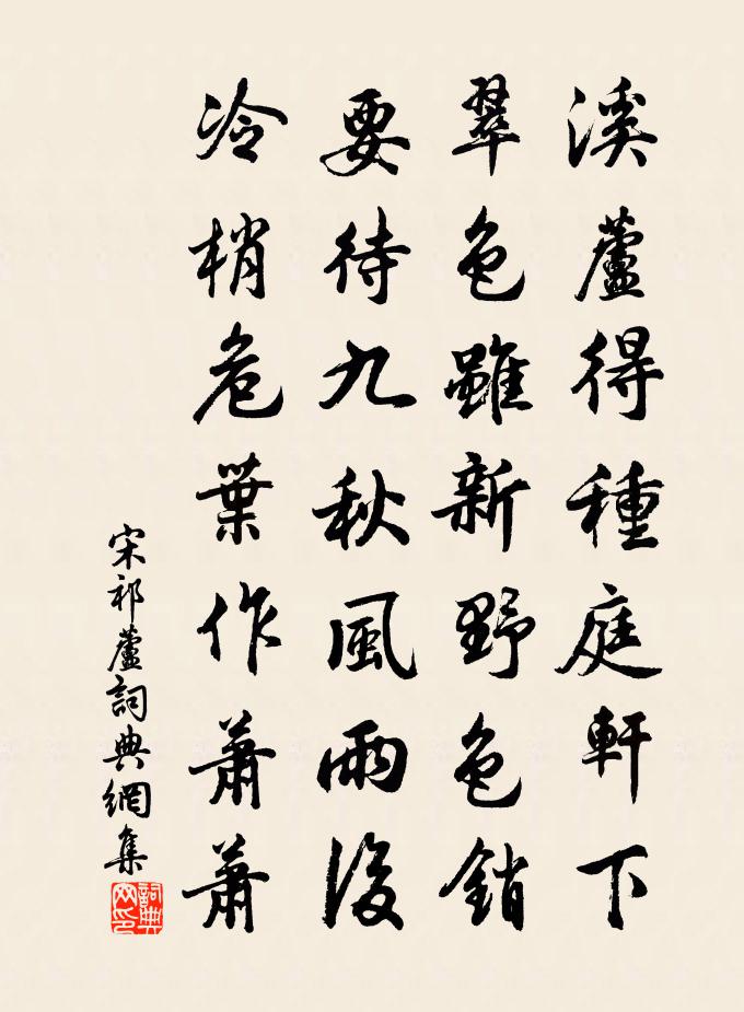 詩詞名句歷史字典書法欣賞書法字典國語詞典說文解字康熙字典古漢語字典標 題 作 者 詩 句 蘆作者:宋祁 朝代:宋代蘆原文溪蘆得種庭軒下,翠色雖新野色銷。要待九秋風雨後,冷梢危葉作蕭蕭。詩詞問答問:蘆的作者是誰?答:宋祁問:蘆寫於哪個朝代?答:宋代問:宋祁的名句有哪些?答:宋祁名句大全宋祁蘆書法欣賞蘆書法作品詩詞推薦次信文早春韻洪皓〔宋代〕一星終後尚蹉跎,四壁如懸已化梭。方殢聖賢排旅悶,忽驚天地應人和。春風乍扇融冰雪,佛火初收散綺羅。遐想句寇準〔宋代〕蒼芷溪煙晻靄山,翛然城角起天端。端明無惰趙公哀詩二首劉克莊〔宋代〕惜身顧影世滔滔,嘆息斯人振古豪。中壘老猶獻封事,三閭去尚作離騷。無金可遺貧如故,加璧難招節更高。有淚游法雲寺彝老新葺小園陸游〔宋代〕古寺朱扉傍水開,高僧笑語共徘徊。陰陰曲徑人稀到,一一名花手自栽。竹筧引泉滋藥壟,風爐篝火試茶杯。此行九日從宋公戲馬台集送孔令詩謝靈運〔南北朝〕季秋邊朔苦。旅鴈違霜雪。淒淒陽卉腓。皎皎寒潭絜。良辰感聖心。雲旗興暮節。鳴葭戾朱宮。蘭巵獻時哲。餞宴偈頌一百二十三首釋普度〔宋代〕踏斷洛陽橋,直上妙峰頂。拈得家傳黑竹篦,攪動龍淵千尺井。四五處雷動風行, * 十春花月影。為人端的無情聽彈古淥水(琴曲名)白居易〔唐代〕聞君古淥水,使我心和平。欲識慢流意,為聽疏泛聲。西窗竹陰下,竟日有餘清。次韻叔衍兄賀生子魏了翁〔宋代〕一壑一丘耕且為,不歆周綱應非羆。雲霾障日樹蒙密,草蔓漫天山蔽虧。生意正從芽櫱露,善根不逐斧斤斯。溶溶留別昌國五首王阮〔宋代〕妄意弦歌學子游,迄無三異比中牟。丁寧今夜東風雨,添起潮頭急去休。次韻任伯仲均父詩和唐英之什傅察〔宋代〕數子聲華久絕塵,更將詩律斬清新。爛如曉日鋪紅錦,穆若薰風 * 苹。王謝由來多大手,何劉那得比斯人。從今睢陽贈李司倉劉長卿〔唐代〕白露變時候,蛩聲暮啾啾。飄飄洛陽客,惆悵梁園秋。只為乏生計,爾來成遠遊。一身不家食,萬事從人求。且喜送三哥守蜀韓維〔宋代〕昔我忠憲公,握節臨西州。於今三十載,餘愛尚應留。旌旗愴獨往,山水記同游。一歌緇衣詩,涕下不能收。慈恩寺避暑李遠〔唐代〕香荷疑散麝,風鐸似調琴。不覺清涼晚,歸人滿柳陰。秋夕嘆白髮詩何遜〔南北朝〕絲白不難染。蓬生直易扶。唯見星星鬢。獨與眾中殊。昔年十四五。率性既廉隅。直是安被褐。非敢慕懷珠。何言卜運算元·萬里籋浮雲辛棄疾〔宋代〕萬里籋浮雲,一噴空凡馬。嘆息曹瞞老驥詩,伏櫪如公者。山鳥哢窺檐,野鼠飢翻瓦。老我痴頑合住山,此地菟裘題佛剎釋宗印〔宋代〕七十勞生西復東,鄉關在望念飄蓬。大遼半歲九分盡,全晉一年千里空。周召已亡無善政,蔡童雖死有餘風。華陰傚東坡從歐陽公詠雪體不用鹽玉鶴鷺絮蝶飛舞袁說友〔宋代〕樓頭一夜寒聲促,但怪重衾慣藏六。小窗起聽枯葉鳴,更覺凝寒透肌粟。乃知龍公修故事,幻作輕細巧翻覆。摶空題韋郎中新亭張籍〔唐代〕起得幽亭景復新,碧莎地上更無塵。琴書著盡猶嫌少,松竹栽多亦稱貧。藥酒欲開期好客,朝衣暫脫見閒身。成名醉戲竇子美人岑參〔唐代〕朱唇一點桃花殷,宿妝嬌羞偏髻鬟。細看只似陽台女,醉著莫許歸巫山。偈頌三十首釋慧暉〔宋代〕行腳大事,一段宗要。直拈起兔角佛杖,正舉著龜毛祖拂。若人拈起舉著時,人盡有禮謝在時。名句推薦丹桂不知搖落恨,素娥應信別離愁。王琪《望江南·江南月》 對此懷素心,千里共明月德隱《新秋晚眺》 中庭月色正清明,無數楊花過無影。張先《木蘭花·乙卯吳興寒食》 露濕晴花春殿香,月明歌吹在昭陽。李益《宮怨》 東風夜放花千樹。更吹落、星如雨。辛棄疾《青玉案·元夕》 日暮九疑何處?認舜祠叢竹。文廷式《好事近·湘舟有作》 就解佩旗亭,故人相遇。吳文英《掃花游·西湖寒食》 朱門酒肉臭,路有凍死骨。杜甫《自京赴奉先縣詠懷五百字 / 自京赴奉先詠懷五百字》 碧虛無雲風不起,山上長松山下水。劉禹錫《八月十五夜桃源玩月》 財物輕,怨何生。言語忍,忿自泯。李毓秀《弟子規·出則弟》