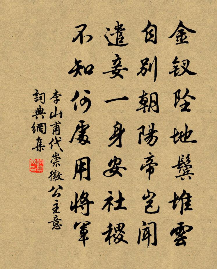 詩詞名句歷史字典書法欣賞書法字典國語詞典說文解字康熙字典古漢語字典標 題 作 者 詩 句 代崇徽公主意作者:李山甫 朝代:唐代代崇徽公主意原文金釵墜地鬢堆雲,自別朝陽帝豈聞。遣妾一身安社稷,不知何處用將軍?詩詞問答問:代崇徽公主意的作者是誰?答:李山甫問:代崇徽公主意寫於哪個朝代?答:唐代問:代崇徽公主意是什麼體裁?答:七絕李山甫代崇徽公主意書法欣賞代崇徽公主意書法作品注釋全唐詩:卷643-65詩詞推薦若耶溪逢陸澧陳羽〔唐代〕溪上春晴聊看竹,誰言驛使此相逢。擔簦躡屐仍多病,笑殺雲間陸士龍。雨晴後陪王員外泛後湖得溪字獨孤及〔唐代〕遠山媚平楚,宿雨漲清溪。沿泝任舟楫,歡言無町畦。酒酣相視笑,心與白鷗齊。擬行路難·其六鮑照〔南北朝〕對案不能食,拔劍擊柱長嘆息。丈夫生世會幾時?安能蹀躞垂羽翼!棄置罷官去,還家自休息。朝出與親辭,暮還玉樓春(乙酉九日)劉辰翁〔宋代〕龍山歌舞無人道。只說先生狂落帽。秋風亦是可憐人,要令天意知人老。菊花不為重陽早。自愛古人詩句惱。與君自河北貶滁州初入汴河聞鴈歐陽修〔宋代〕陽城淀里新來鴈,趁伴南飛逐越船。野岸柳黃霜正白,五更驚破客愁眠。又賦文天祥〔宋代〕驟雨知何處,一溪秋水生。苦吟肩鶴瘦,多病耳蟬鳴。隱几惟便睡,挑包正倦行。山深明月夜,乞我半窗清。謁大慈恩寺李治〔唐代〕日宮開萬仞,月殿聳千尋。花蓋飛團影,幡虹曳曲陰。綺霞遙籠帳,叢珠細網林。寥廓煙雲表,超然物外心。贈從弟茂卿(時欲北游)楊巨源〔唐代〕吾從驥足楊茂卿,性靈且奇才甚清。海內方微風雅道,鄴中更有文章盟。扣寂由來在淵思,搜奇本自通禪智。王維野燒陳普〔宋代〕雜沓平原起電紅,憑陵勢欲逼青峰。草芽不問新開甲,蟄戶尤憐乍啟封。何暇徹侯分玉石,略如伯益逐蛇龍。際天雪方回〔宋代〕老面臨高不畏風,塵寰一變蕊珠宮。驟難金碧茅茨別,預喜蝗螟瘴癘空。至潔獨凝群物表,太和元在極寒中。絕憐別五祖山悅眾釋正覺〔宋代〕東山聚散亦夤緣,華吐芳姿柳鎖煙。肯處根塵非一一,用時手眼恰千千。塔中祖有相傳事,嶺外人元不會禪。後日聖柬將寓於衛行乞食於齊有可憐之色再次韻感黃庭堅〔宋代〕春風鳴布穀,天道似勸分。持飢望路人,誰能顏色溫。笑憶枯魚說,詼諧老漆園。湘纍不得祿,哀怨寫荃蓀。千年偈公六十五首釋鹹傑〔宋代〕月生一,萬像不能逃影質。月生二,東行不見西行利。月生三,無言童子口喃喃。寄房千里博士許渾〔唐代〕春風白馬紫絲韁,正值蠶眠未採桑。五夜有心隨暮雨,百年無節待秋霜。重尋繡帶朱藤合,更認羅裙碧草長。為報代作五首項安世〔宋代〕蒼龍元住五雲東,此日黃昏卻正中。琴瑟銅壺添水箭,翩翻珠戶記桑蓬。上弦月色如銀白, * 光似燭紅。歲歲七不堪詩七首宋祁〔宋代〕六不堪,不樂俗人共。聒聒沸蟈集,紛紛臭孥眾。別詩應瑒〔魏晉〕浩浩長河水。九折東北流。晨夜赴滄海。海流亦何抽。遠適萬里道。歸來未有由。臨河累太息。五內懷傷憂。 寄嚴文炳陳造〔宋代〕子云草玄宅,門徑積莓苔。昨夢憑詩說,新雨無客來。袞袞手可炙,自詫甘寒灰。蜀莊寂寞者,念我首獨回。題畫扇項安世〔宋代〕前舟半出垂楊港,兒子把篙翁撒網。後舟兒小未能篙,媼自哺雛斜刺舫。何處兩生來看魚,野服綸巾意森爽。路窮題蔡令葉嶺書房趙汝□〔宋代〕日誦哲師記,歲通聖人書。前岡復後麓,儼在中間居。佩月而冠雲,被服以璠璵。滄海朝奮駕,崑崙暮停車。矯然名句推薦念天地之悠悠,獨愴然而涕下。陳子昂《登幽州台歌》 行賢而去自賢之心,焉往而不美。韓非及後人《韓非子·說林上》 一身轉戰三千里,一劍曾當百萬師。王維《老將行》 人非人不濟,馬非馬不走,土非土不高,水非水不流。戴聖《大戴禮記·曾子制言上第五十四》 庸愚足以覆事;精明亦足以覆事。王永彬《圍爐夜話·第五九則》 轡搖銜鐵。蹴踏平原雪。張炎《清平樂·平原放馬》 博觀而約取,厚積而薄發蘇軾《稼說送張琥》 回首暮雲遠,飛絮攪青冥。蘇軾《水調歌頭·昵昵兒女語》 江上月明胡雁過,淮南木落楚山多。劉長卿《江州重別薛六柳八二員外》 崑崙之高有積雪,蓬萊之遠常遺寒。王令《暑旱苦熱》